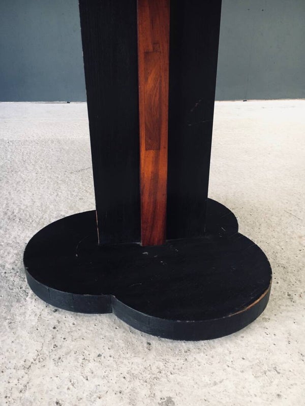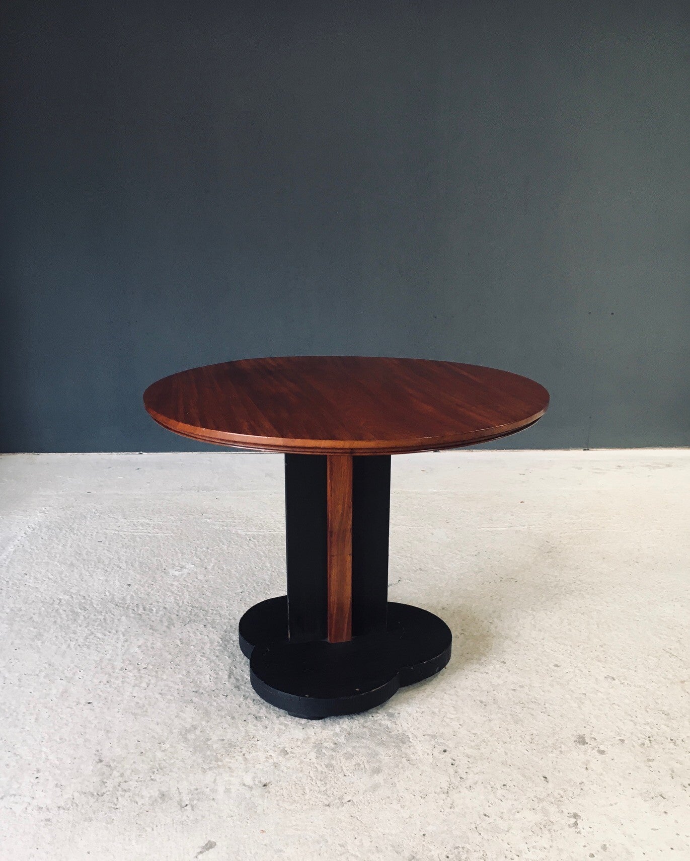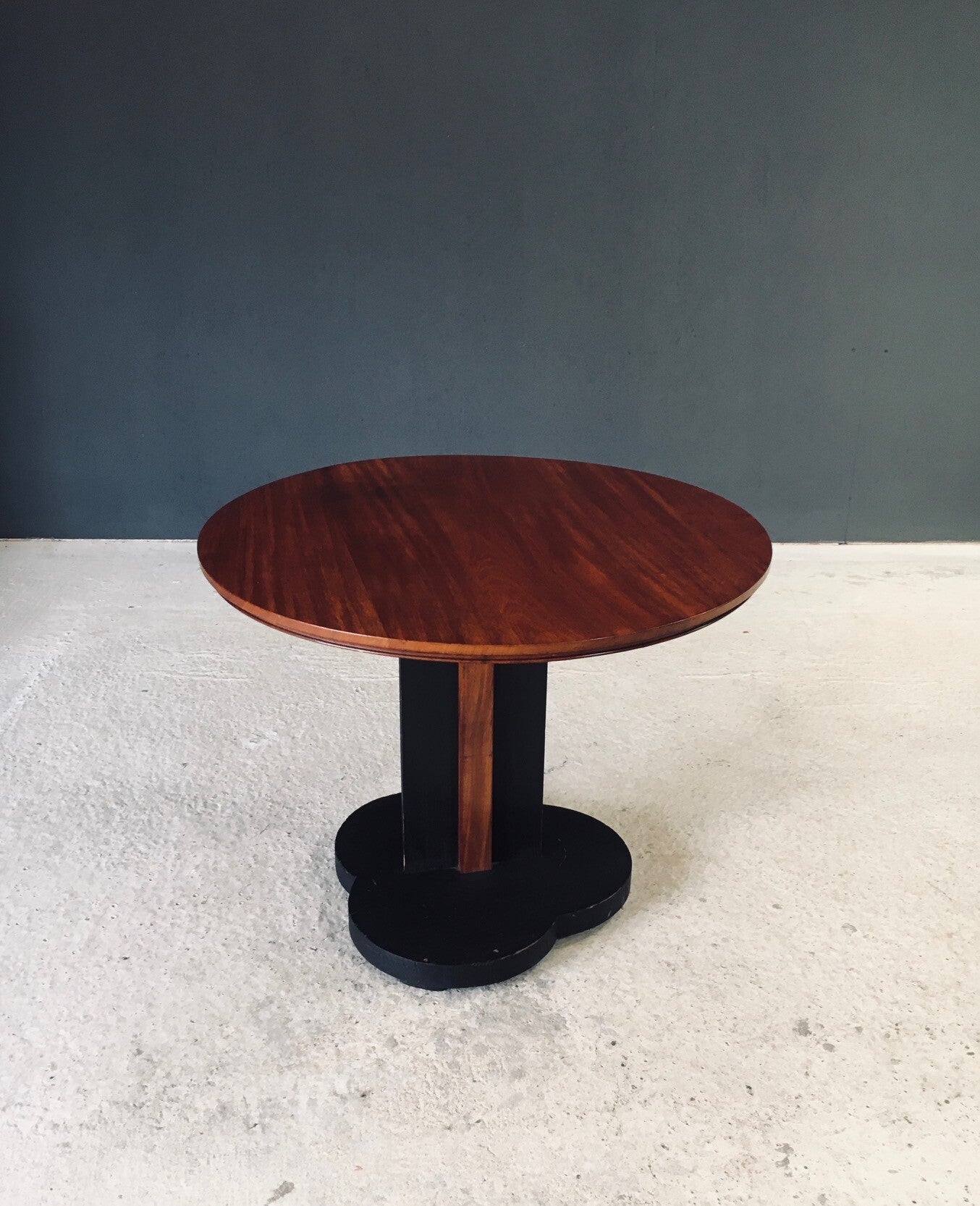 Vintage Art Deco Design Round Side Table. Made in France, 1930's period. Wood constructed side table with cloud shaped black stained base and slender support with walnut finish on the support and a walnut table top. This comes in very good condition with normal wear signs from it's use and age. Some marks on the table top (see pictures). This measures 61cm x 78cm x 78cm.