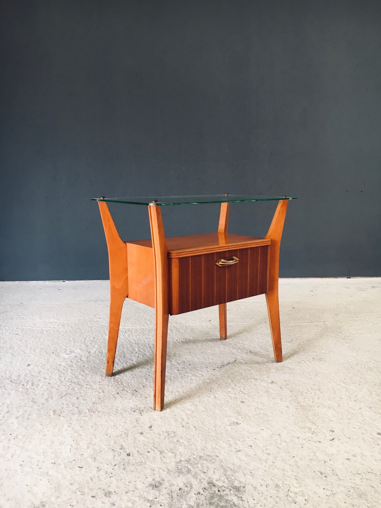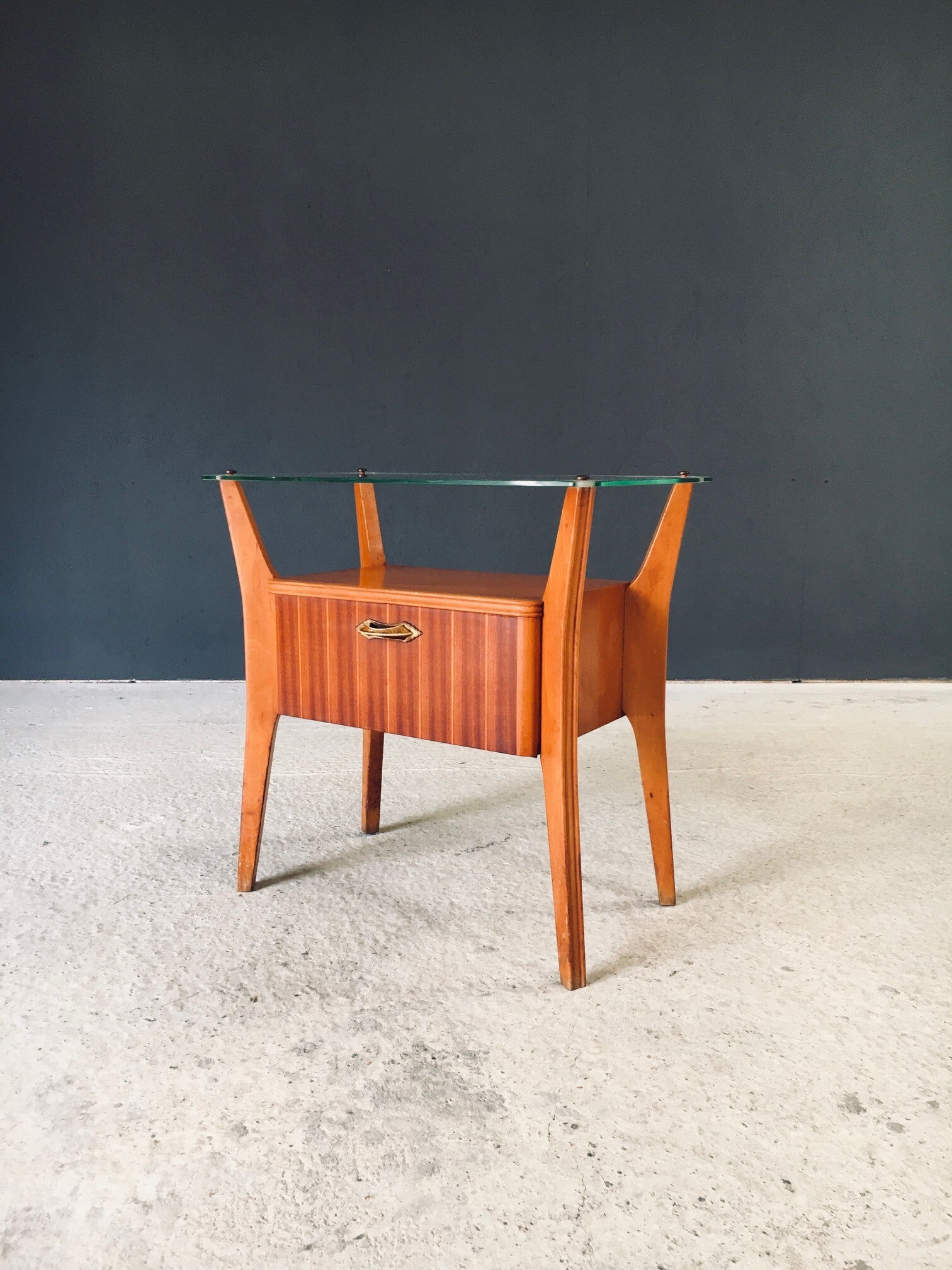 Vintage Midcentury Italian Design Bedside Table by Gio Ponti for La Permanente Mobili Cantu. Made in Italy in the early 1950's. Walnut & Maple wood constructions with crystal glass top and brass half moon handle. Beautiful designed and proportioned side table. This comes in very good, all original condition. With normal signs of wear from it's use and age. This measures 56cm x 57cm x 34,5cm.