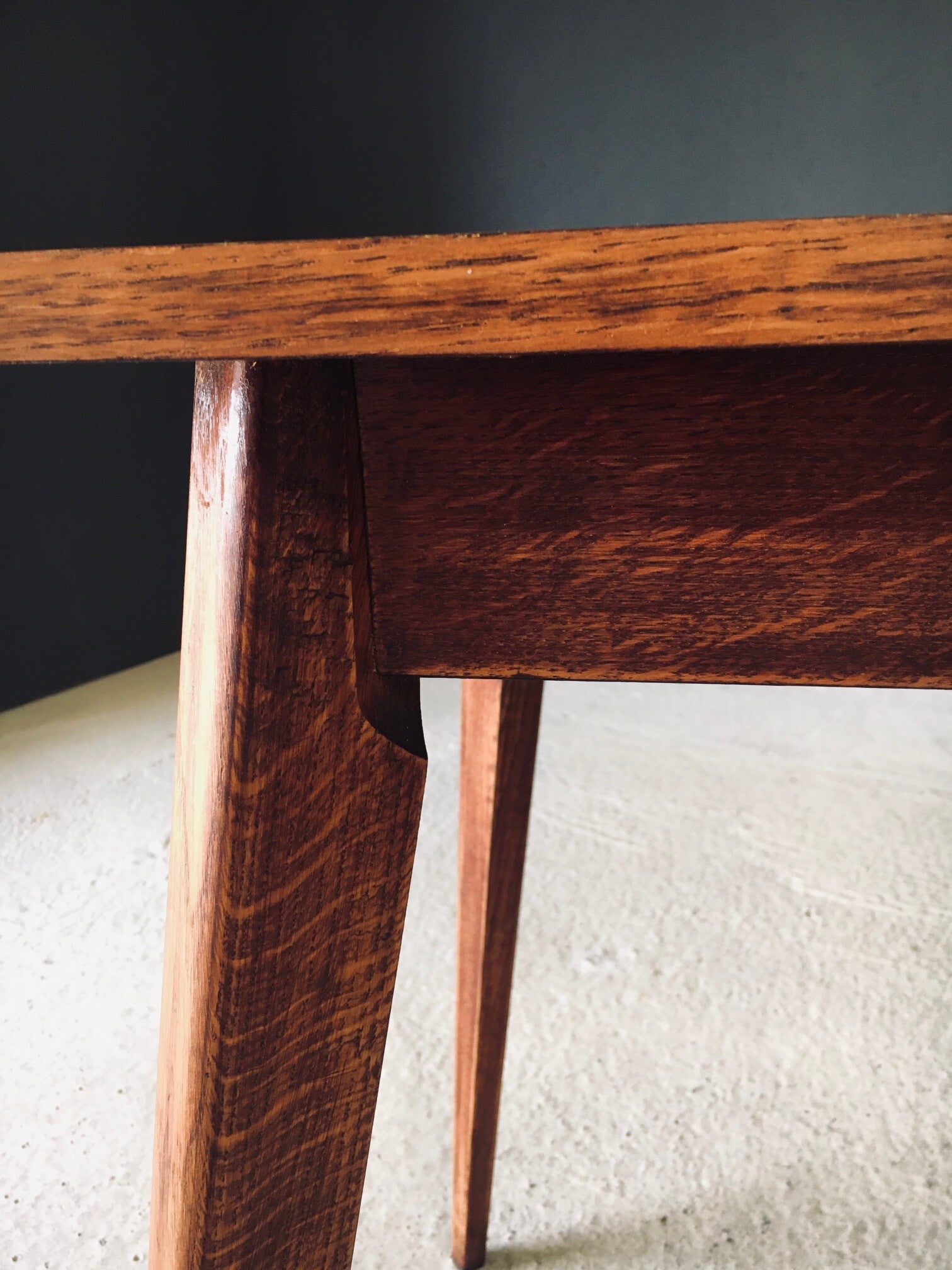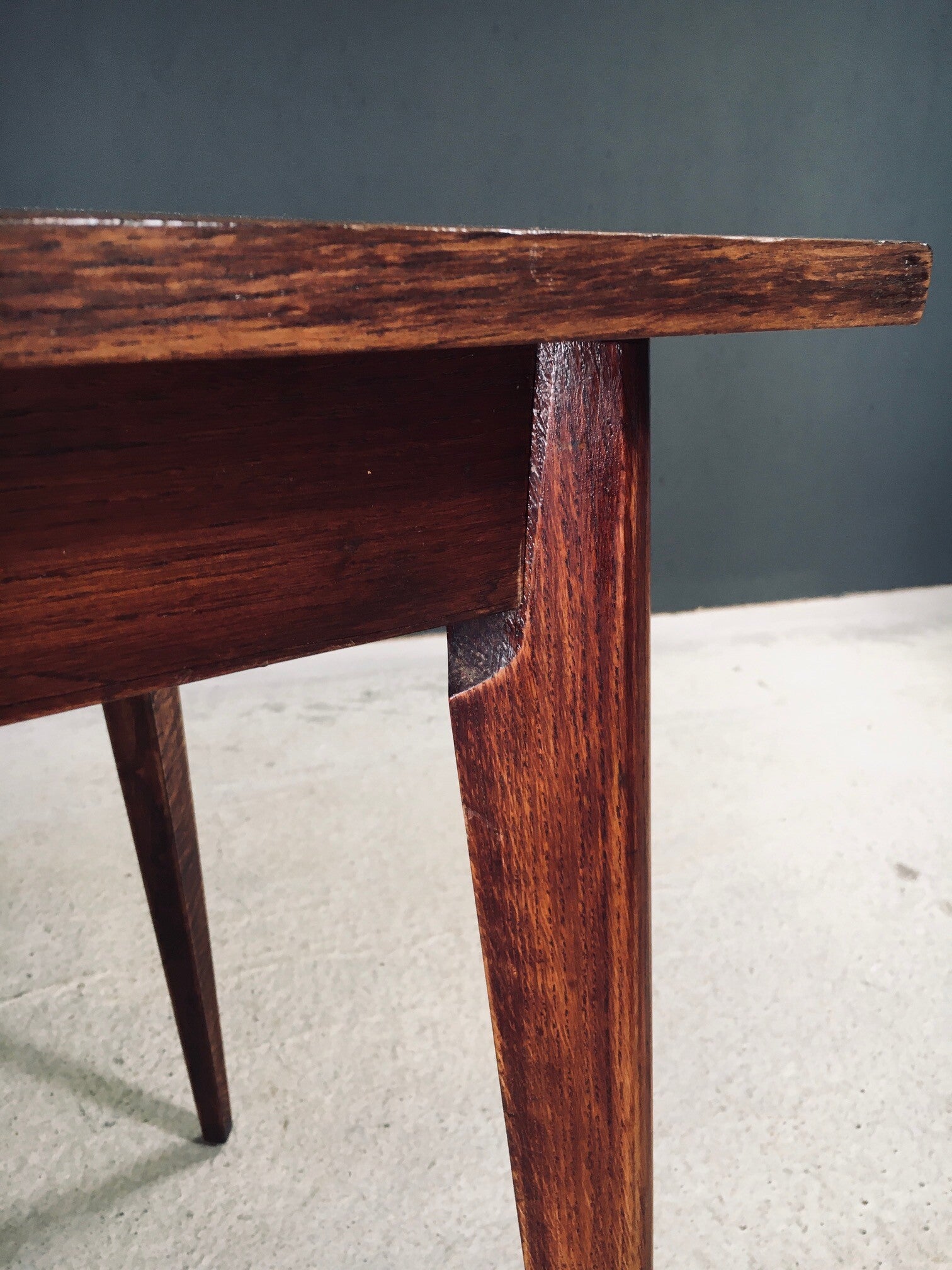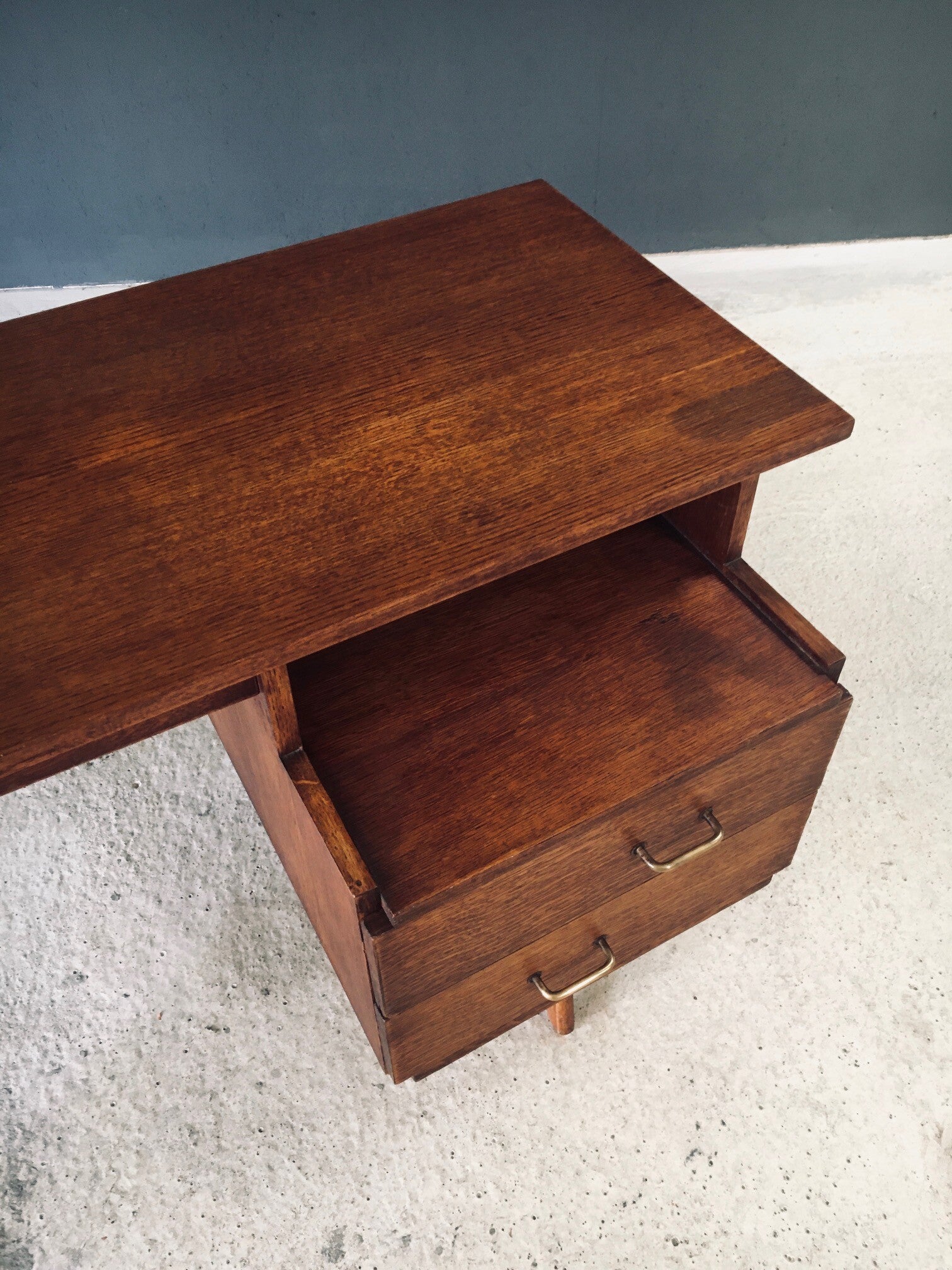 Vintage Midcentury Modern Modernist Reconstruction Period Design Writing Desk. Made in France, early 1950's period. Solid oak constructed desk with two drawers and slender tapered legs. Beautiful in it's simplicity and details on this well designed desk. This comes in very good, all original condition with normal wear signs from it's use and age. Measures 73cm x 120cm x 67cm.