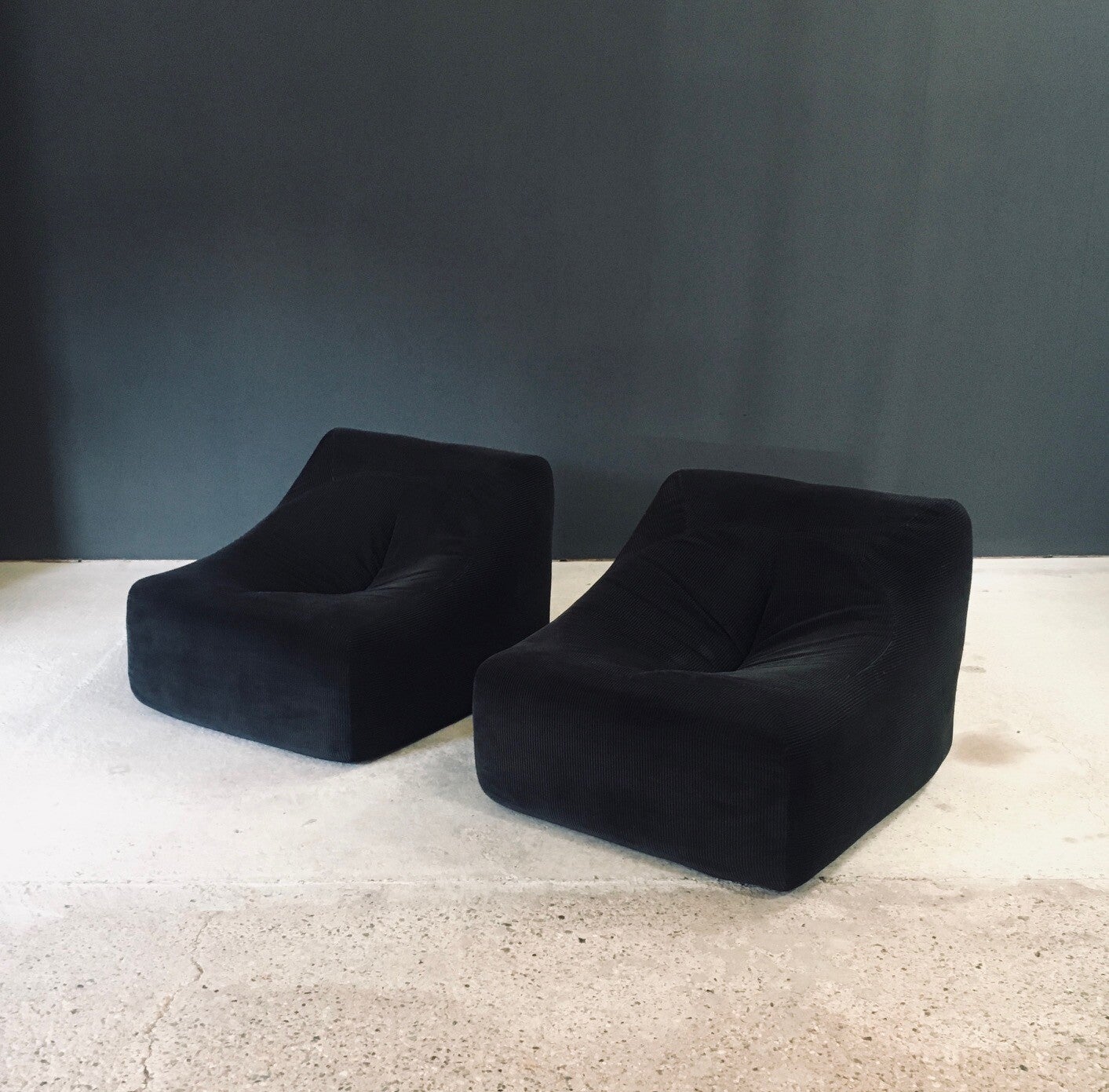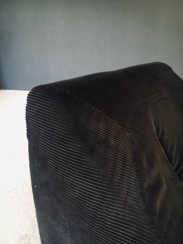 Vintage Midcentury Modern Design Corduroy Lounge Chair set of 2. Made in France, 1970's period. In the manner of Michel Ducaroy Kali model sofa. Dark grey soft corduroy fabric covered fauteuils with leather pad underneath to protect them at the base. These come in very good, all original condition. With normal wear from their use and age. Each lounge chair measures 65cm x 77cm x 87cm. Seat height measures 35cm.