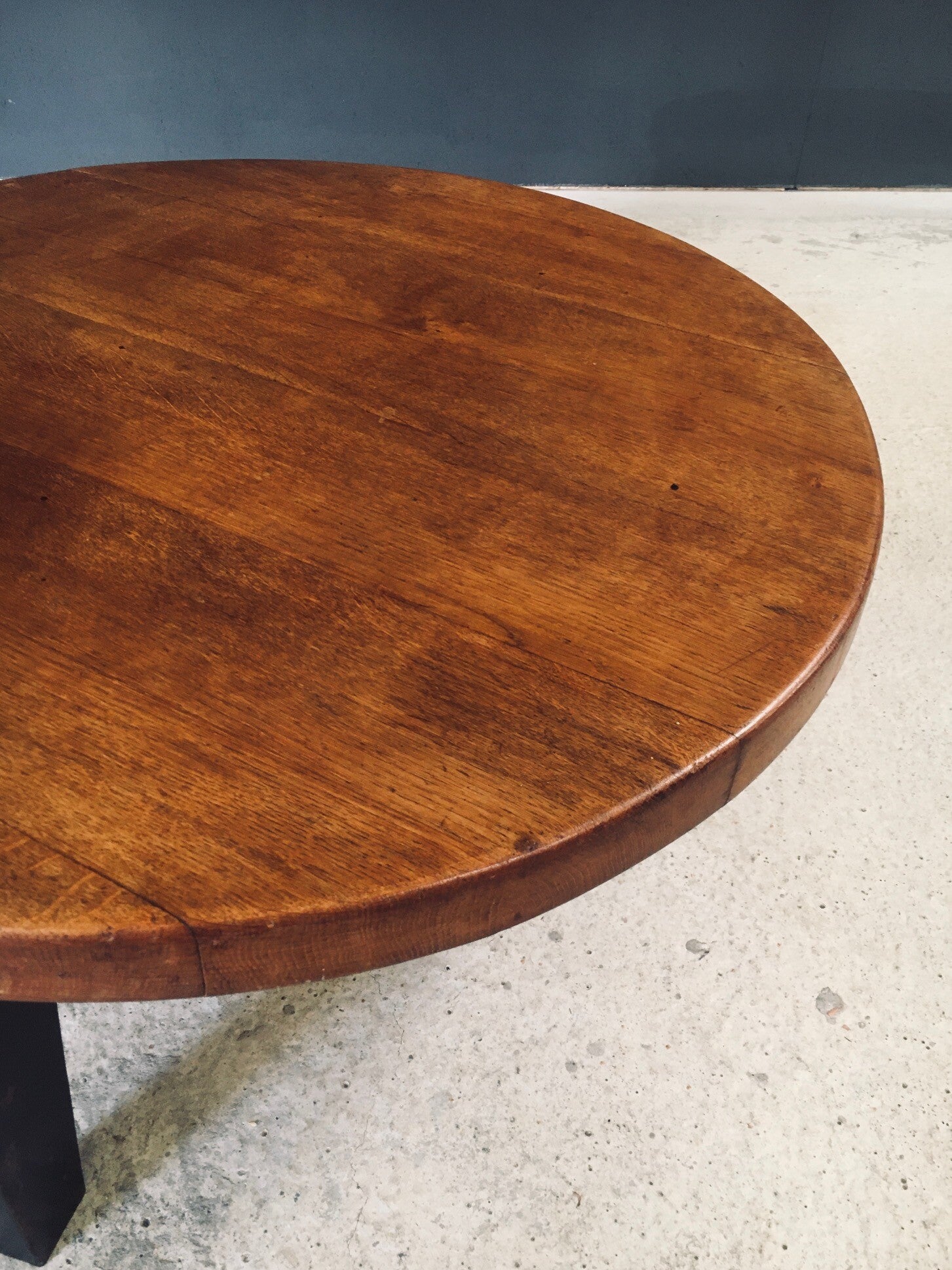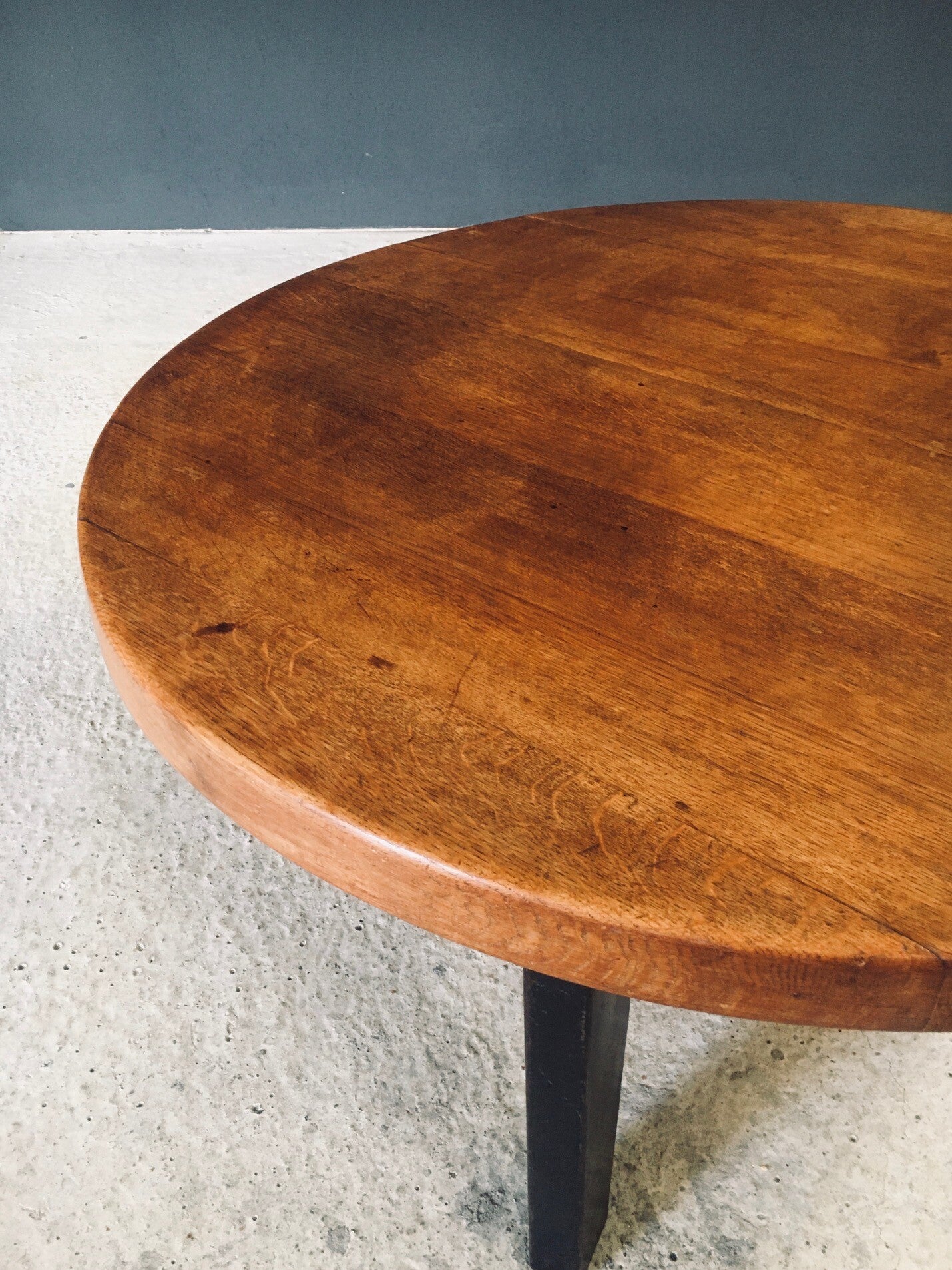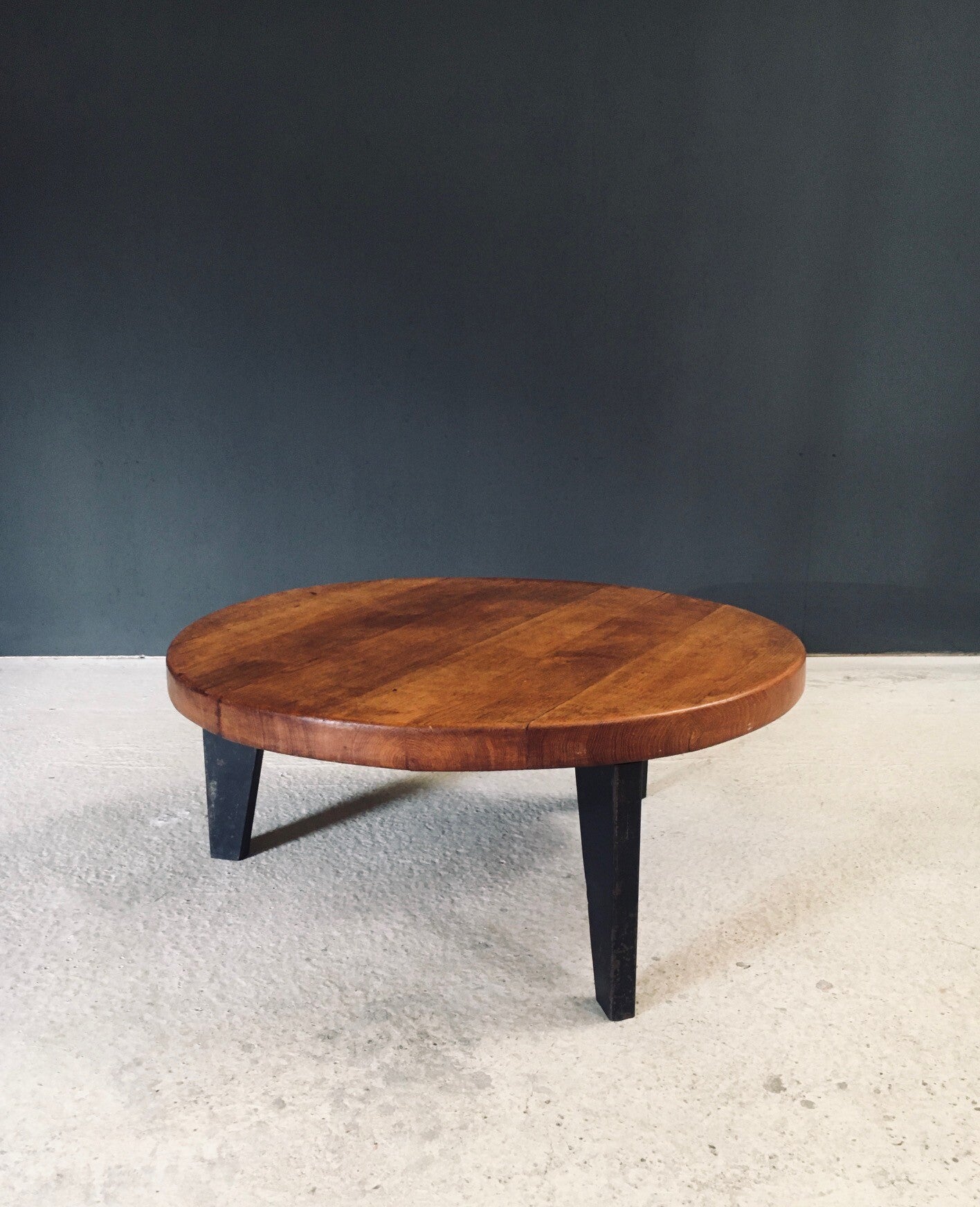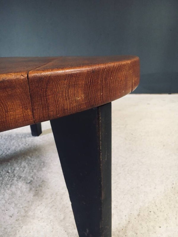 Vintage Midcentury French Industrial Design Round Coffee Table in the manner of Jean Prouvé designs. Made in France, 1950's. The table consists of a metal tripod base partnered with a solid oak slab top. These are beautifully married together, as the base and the top had a separate start in life. The metal base has a nice patina with wear from it's age and use. The solid oak slab top has a very nice patina that comes with it's age and past use. They fit very well together and make a beautiful well designed coffee table. This measures 38,5cm x 95cm x 95cm.