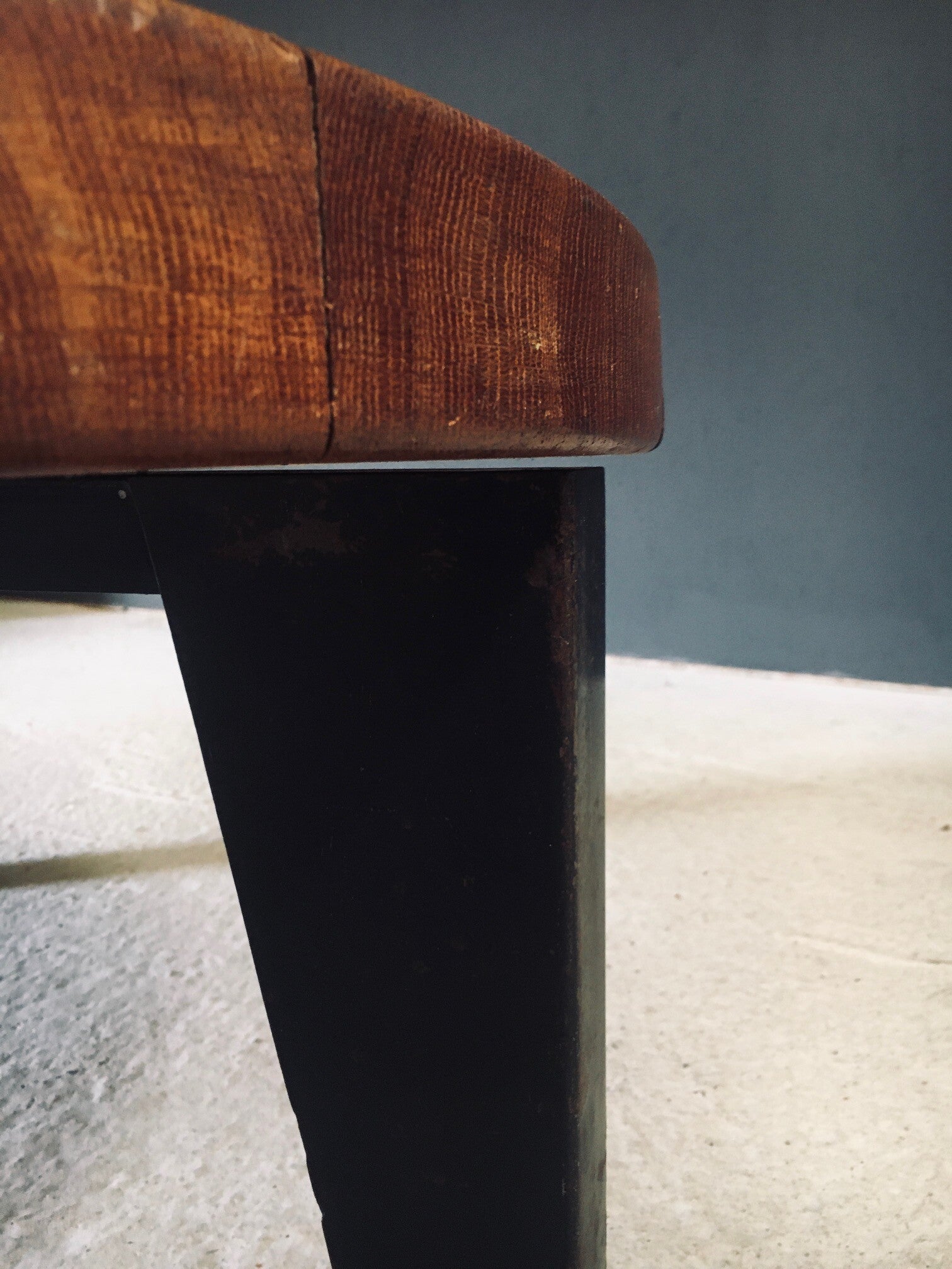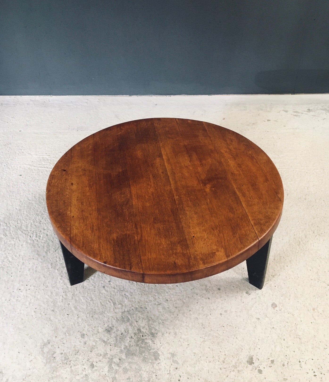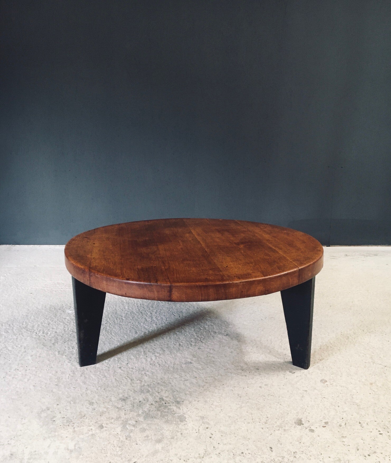 Vintage Midcentury French Industrial Design Round Coffee Table in the manner of Jean Prouvé designs. Made in France, 1950's. The table consists of a metal tripod base partnered with a solid oak slab top. These are beautifully married together, as the base and the top had a separate start in life. The metal base has a nice patina with wear from it's age and use. The solid oak slab top has a very nice patina that comes with it's age and past use. They fit very well together and make a beautiful well designed coffee table. This measures 38,5cm x 95cm x 95cm.