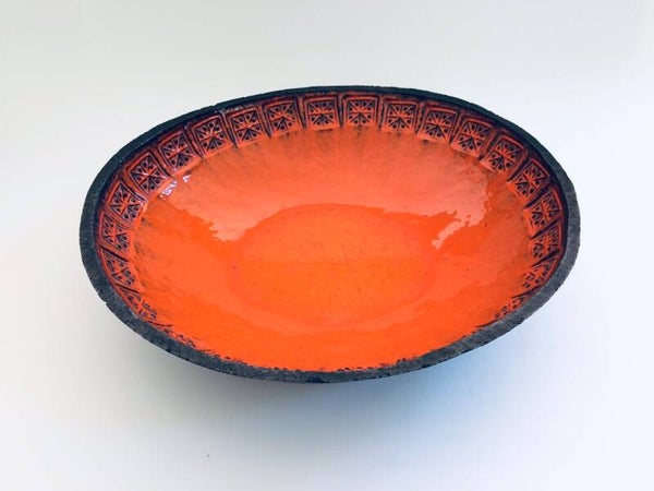 Vintage Midcentury Modern Belgian Design Xlarge Ceramic Bowl in orange & black. Made in Perignem Art Pottery Studio, Belgium 1960's. By Jan Ryheul. Super orange glaze, stamped on the borders with cross and dots motif. In very good condition. 49cm x 46cm x 12cm.
