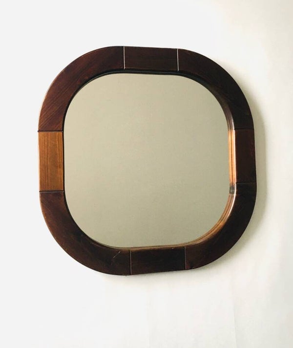 Vintage Design "Finja" Mirror in Stained Pine by Ikea. Made in Sweden, 1970's / 80's period. Large model dark stained pine wood rounded square shape mirror. This comes in very good, original condition with normal wear for it's age and use. This measures 80cm x 80cm x 4cm.