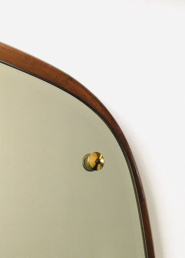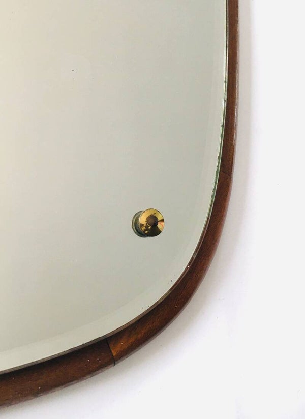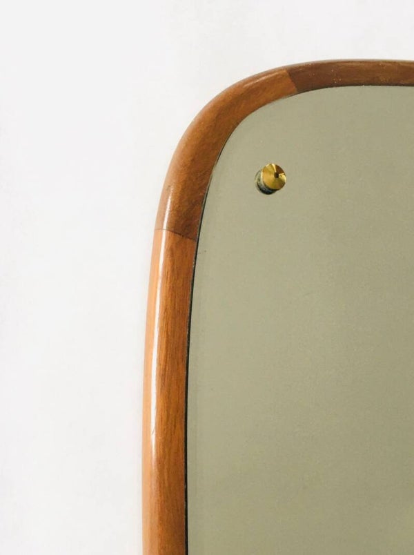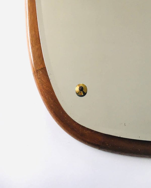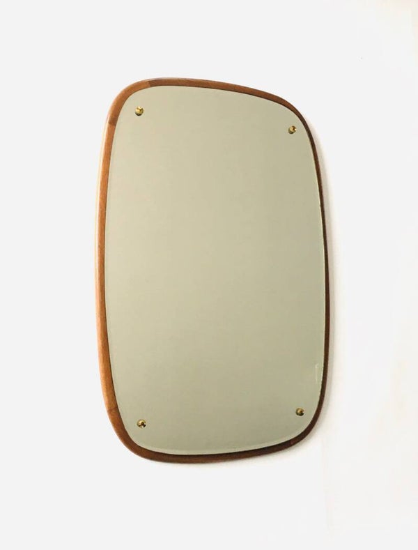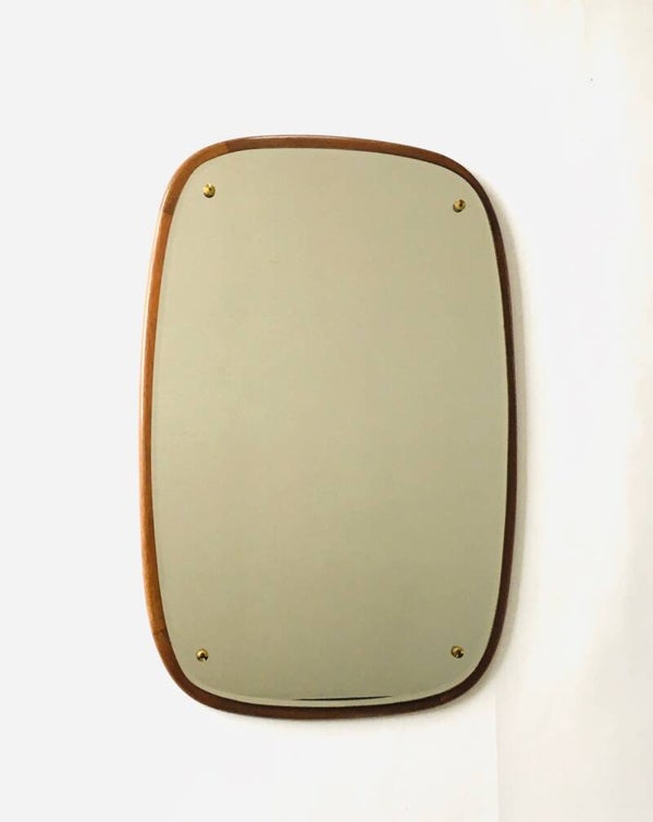 Vintage Midcentury Modern Scandinavian Design Teak Oval Mirror. Made in Denmark, 1960's period. Large oval rounded edge rectangular mirror with beveled mirror edges, brass fittings and teak wooden frame. This comes in very good, all original condition. Measures 84cm x 56cm x 3cm.