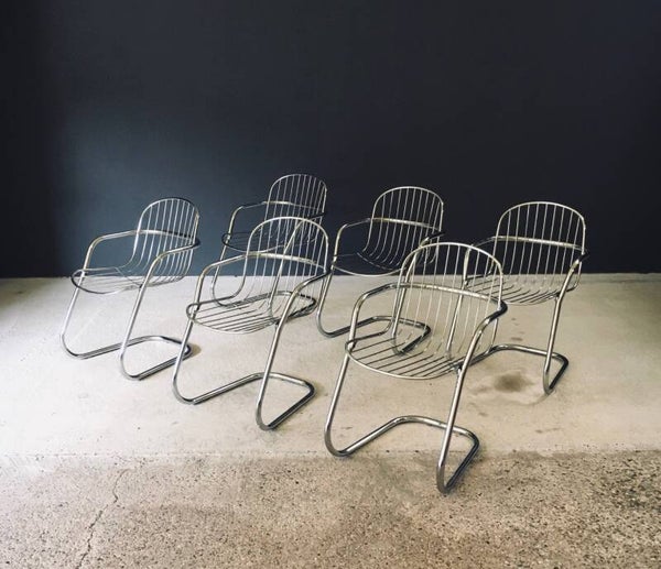 Midcentury Modern Design Chrome Steel Dining Chair set of 6 by Gastone Rinaldi. Made in Italy, 1960's / 70's period. Chromed steel wire frame arm chairs. These armchairs all come in very good, all original condition. WIth normal signs of wear from their age and use. Each chair measures 79cm x 55cm x 70cm. Seat height measures 45cm.