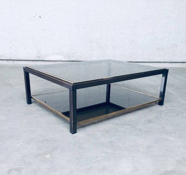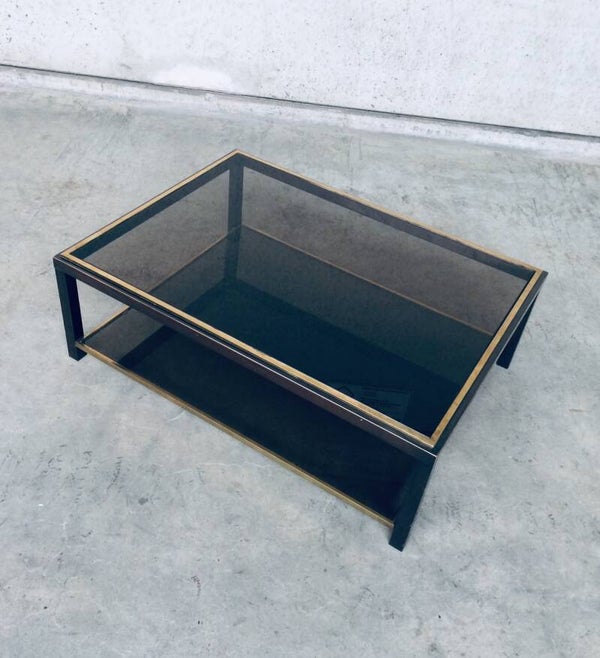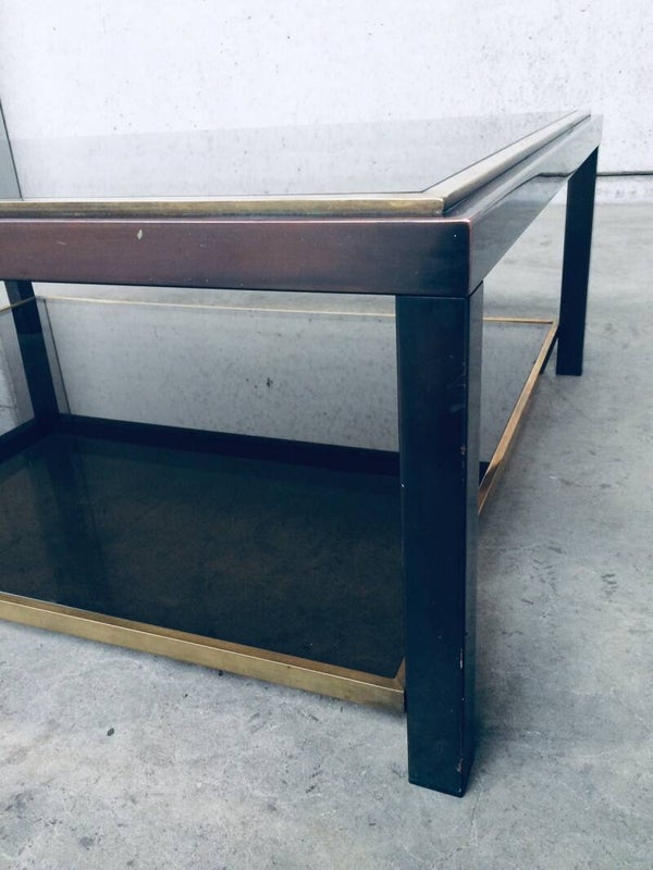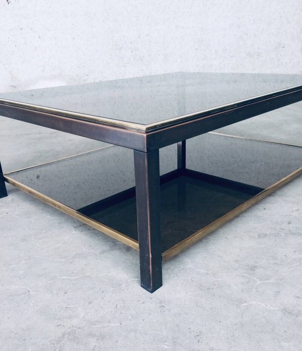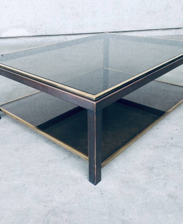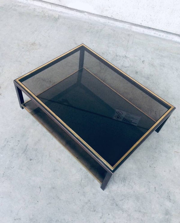 Vintage Midcentury Modern Hollywood Regency Style Two-Tier Coffee Table in Brass & Copper Gun metal with brown fumé glass, by Willy Rizzo. Italy, 1970's. Rectangular model with raised inlay top glass. Beautiful proportions and colors on this used table. In good condition. 120cm x 90cm x 41cm.