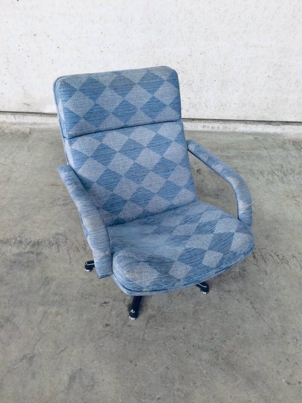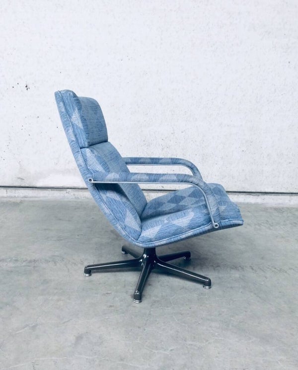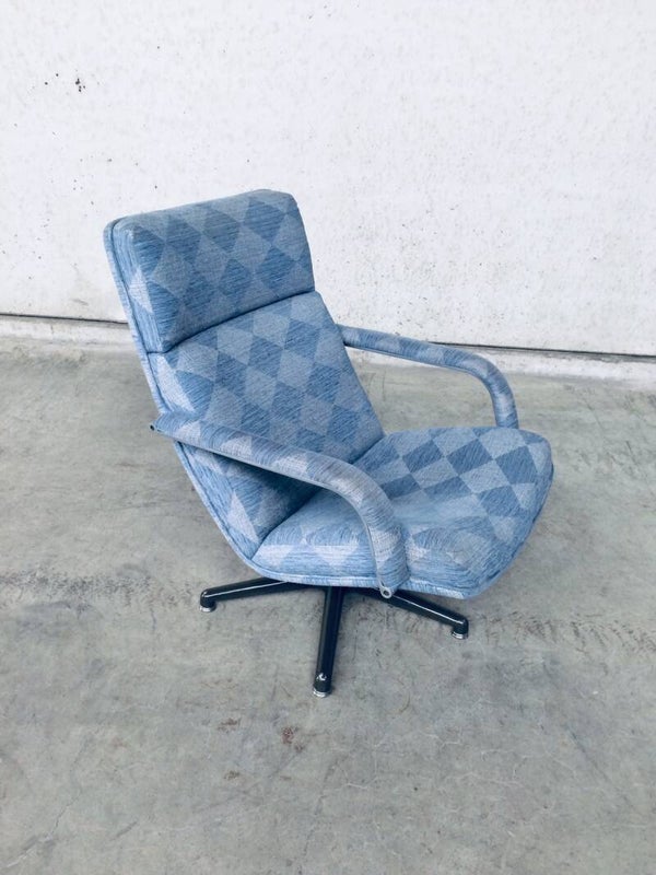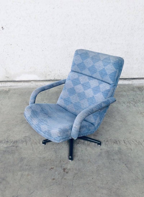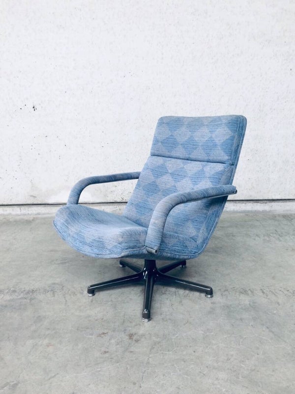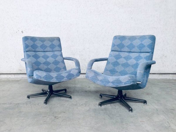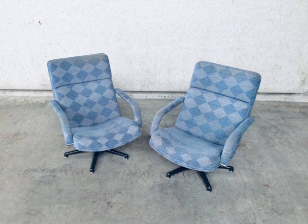 Vintage Midcentury Modern Design original swivel lounge chair set of 2 by Geoffrey Harcourt for Artifort - model F141 in blue checkered fabric. Both are in good condition, one has slight fabric loss on left front seat corner, see pictures for condition. Each measures 87cm x 80cm x 70cm.