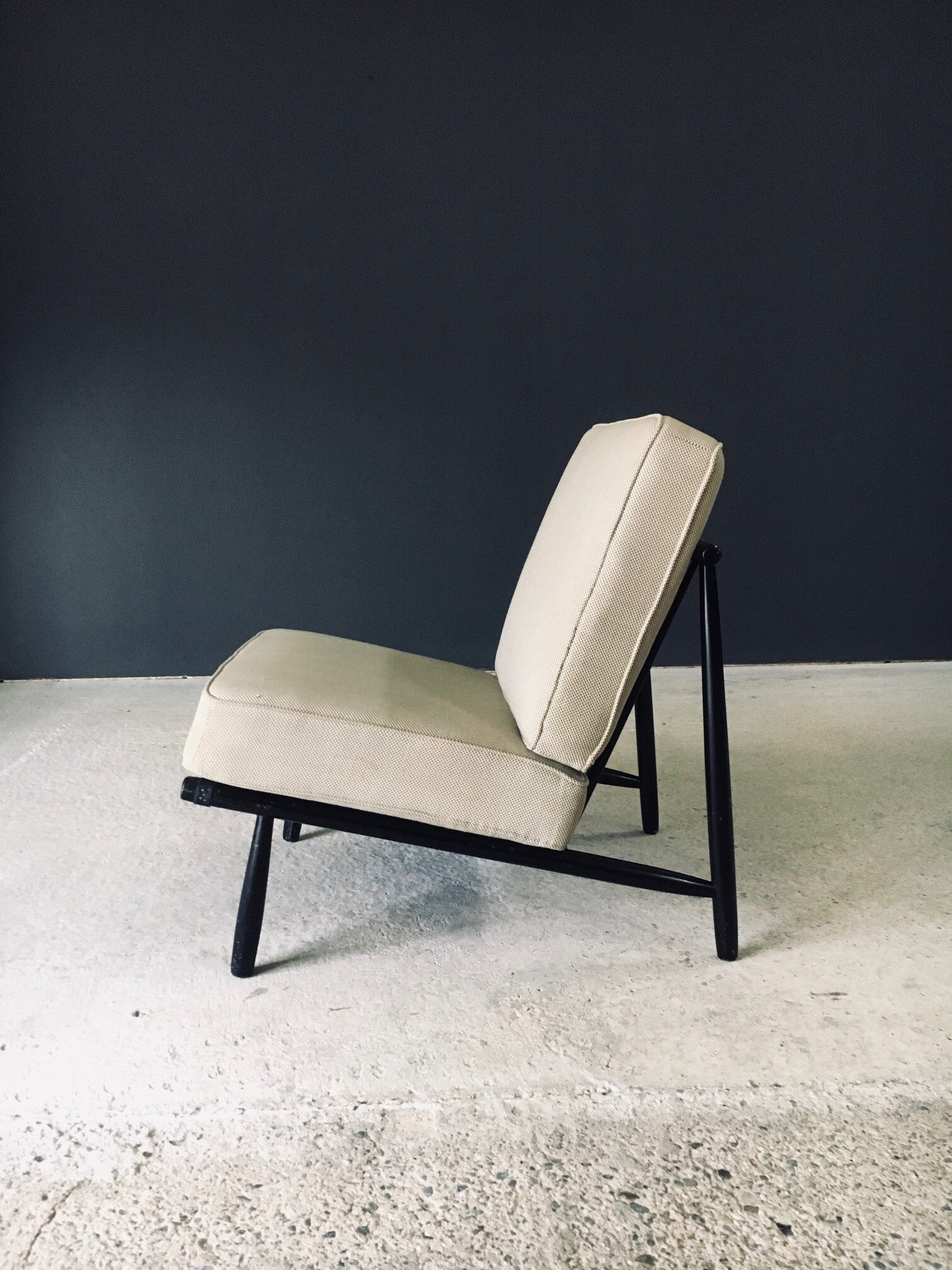 Vintage Midcentury Modern Design Domus Easy Chair by Alf Svensson for Artifort, Dux. Made in Sweden in the 1950's, distributed by Artifort. Marked on the bottom with Artifort label. Black lacquered beech wooden frame with light grey / off white original cushions. The beech frame has had some damage in the past at the front where they were split, and repaired (not to standard, but sturdy - see pictures). This comes in good, original condition. Original cushions in good condition with some light staining from it's use and age. This measures 75cm x 60cm x 78cm. Seat height measures 41cm.