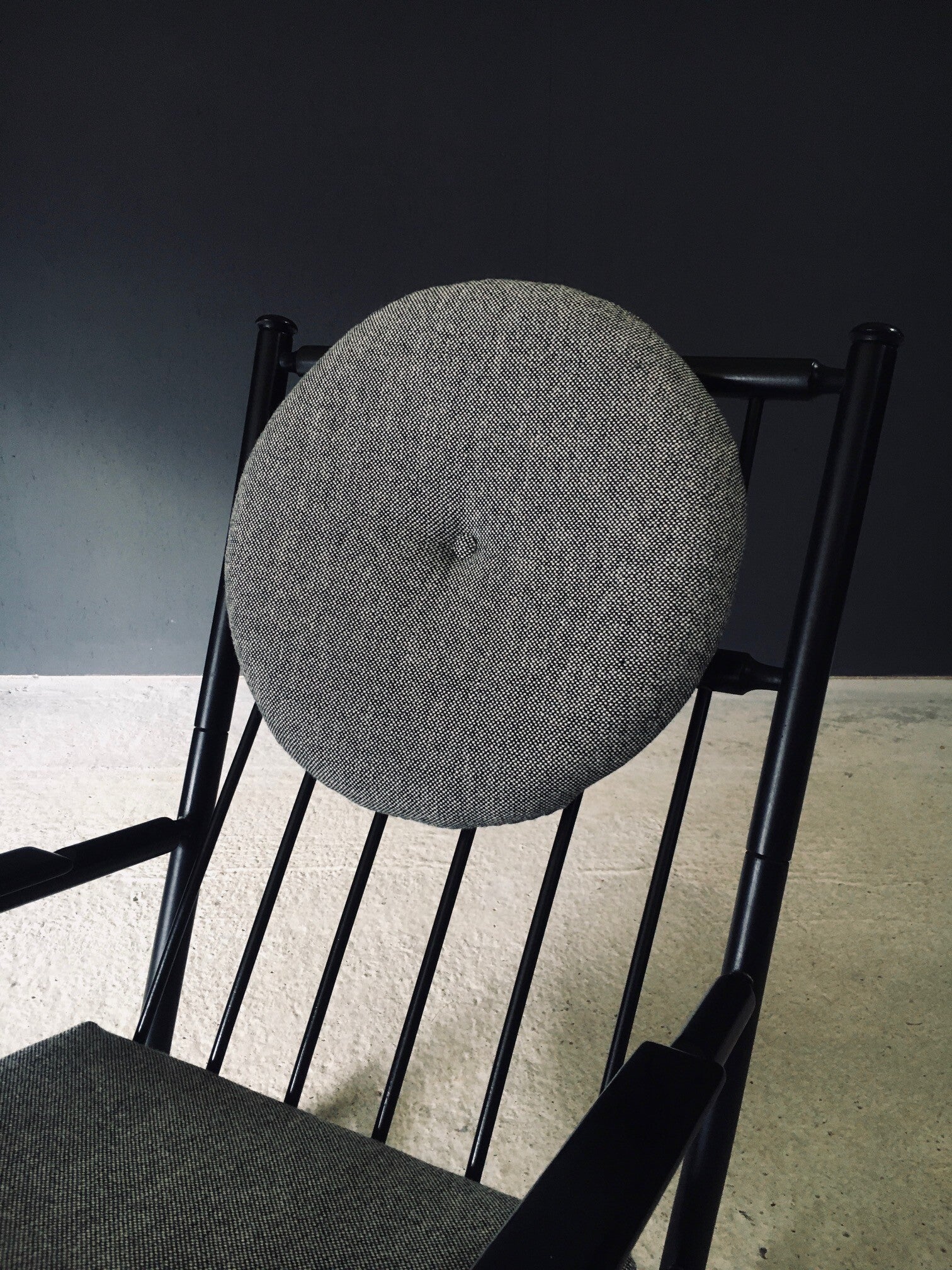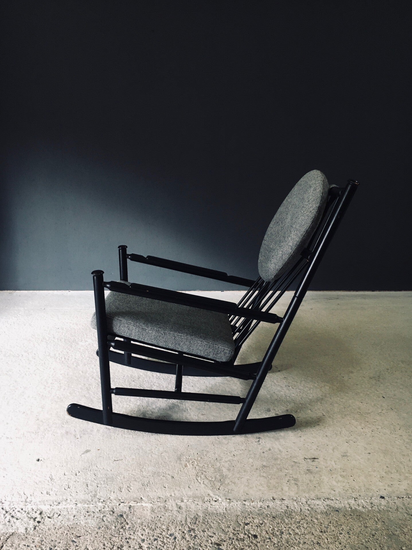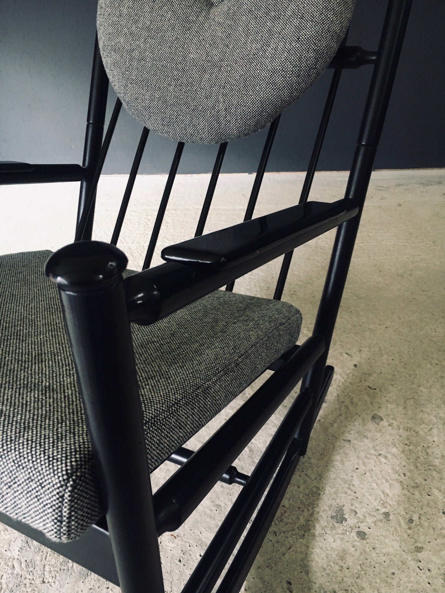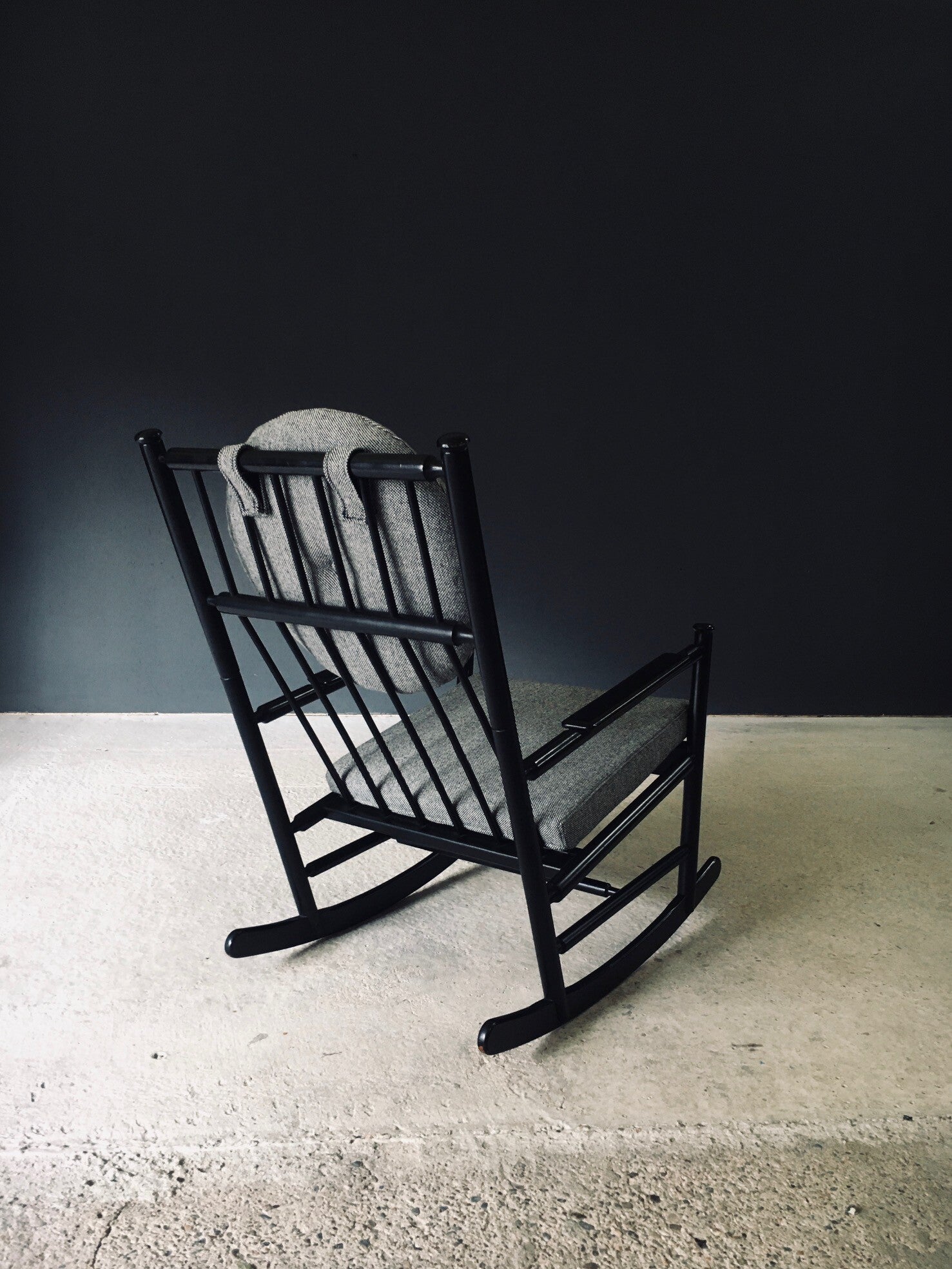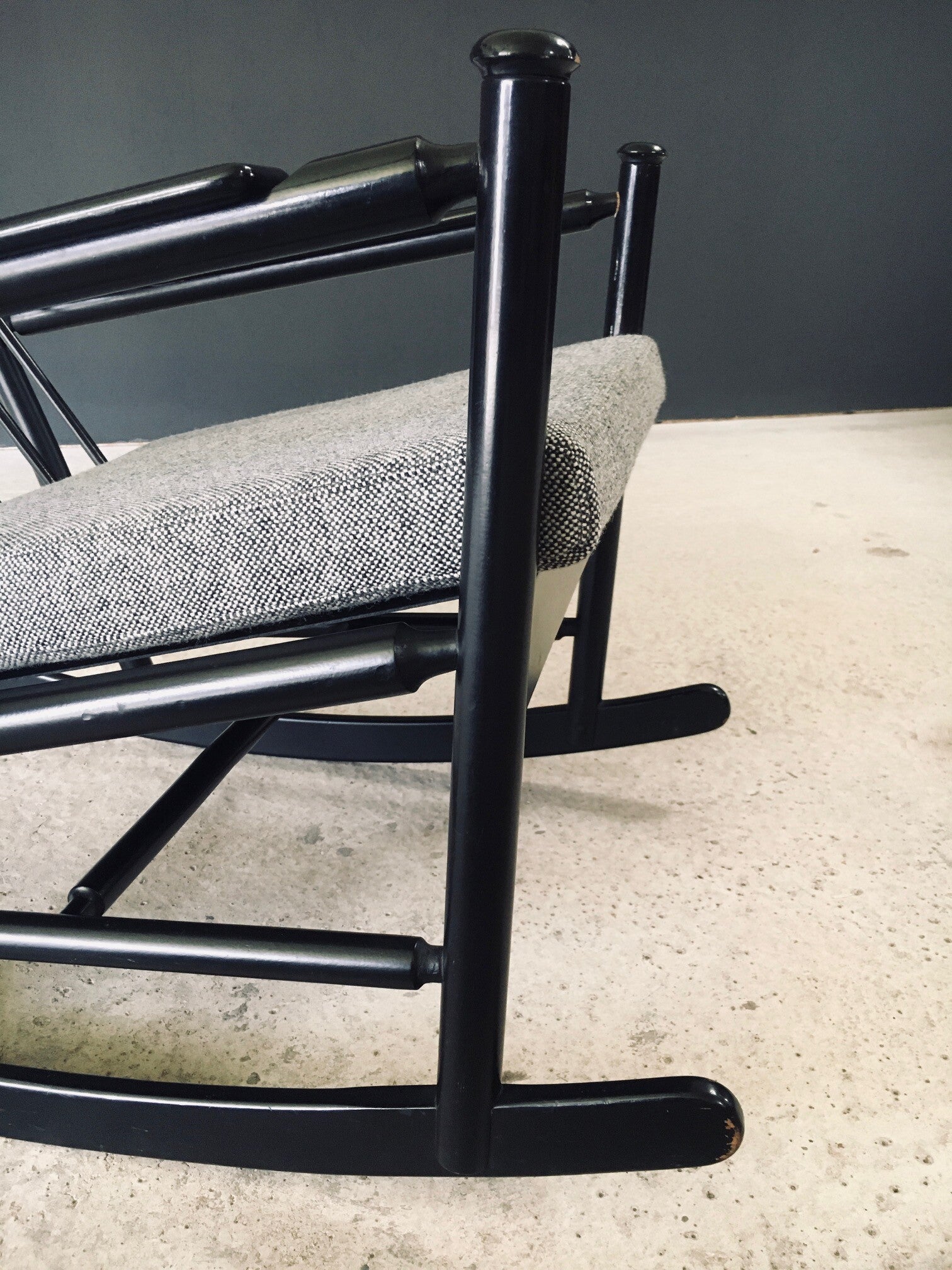 Vintage Midcentury Modern Scandinavian Design Rocking Chair. Made in Sweden, 1960's / 70's period. Black lacquered beech wooden frame with turned details and spindle backrest. This comes with all new made to measure cushions in all new fabric. This comes in very good condition. Normal wear to the black frame from it's use and age. Measures 94cm x 58cm x 90cm. Seat height measures 45cm.