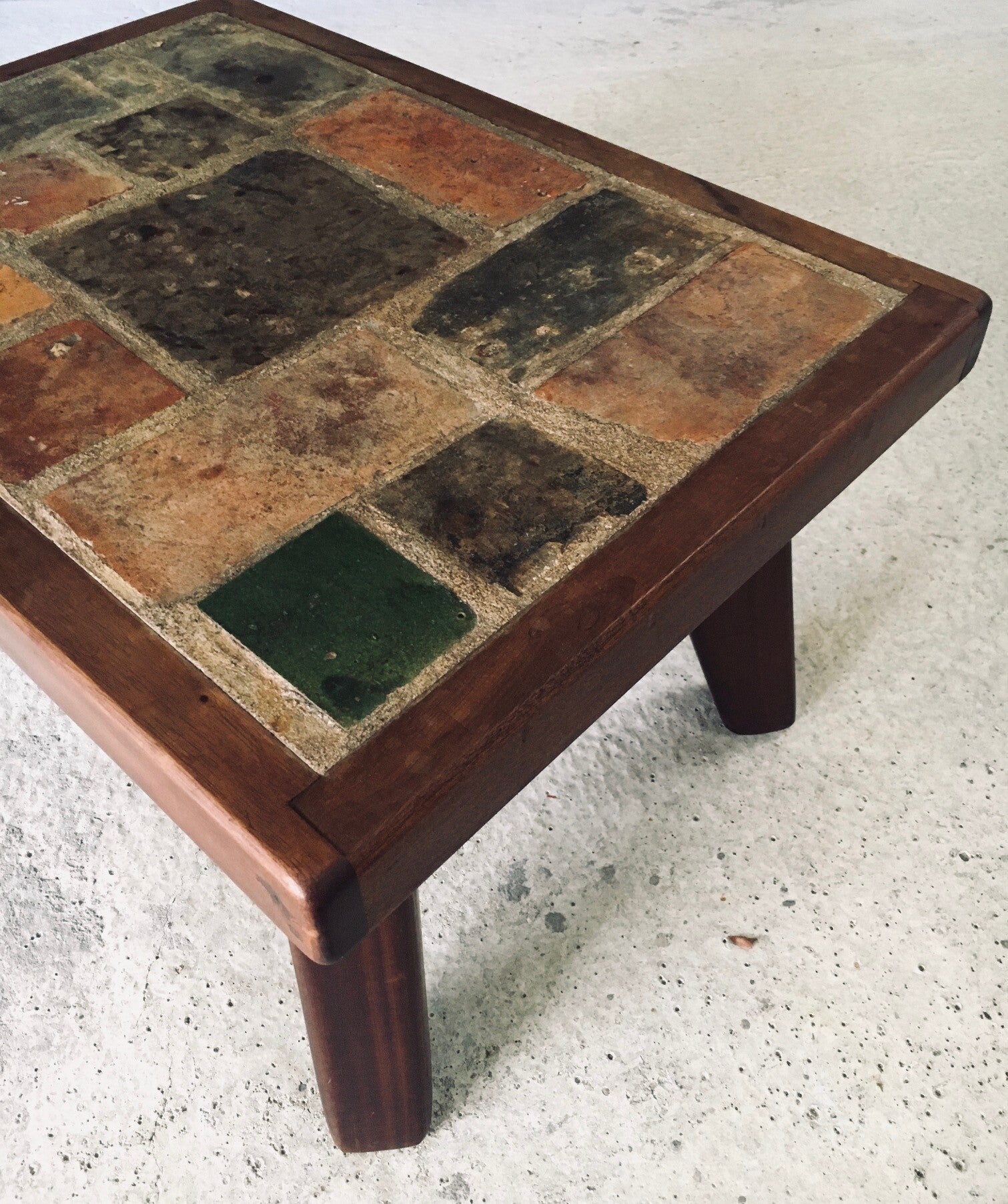 Vintage Brutalist Rustic Design Slate Tile & Oak Coffee Table. Made in Belgium, 1960's. Oak wooden frame with slate stone and ceramic tile inlay top. Beautiful cone shaped legs. This comes in very good, all original condition, with very minor wear from it's use and age. This measures 42,5cm x 80cm x 57cm.