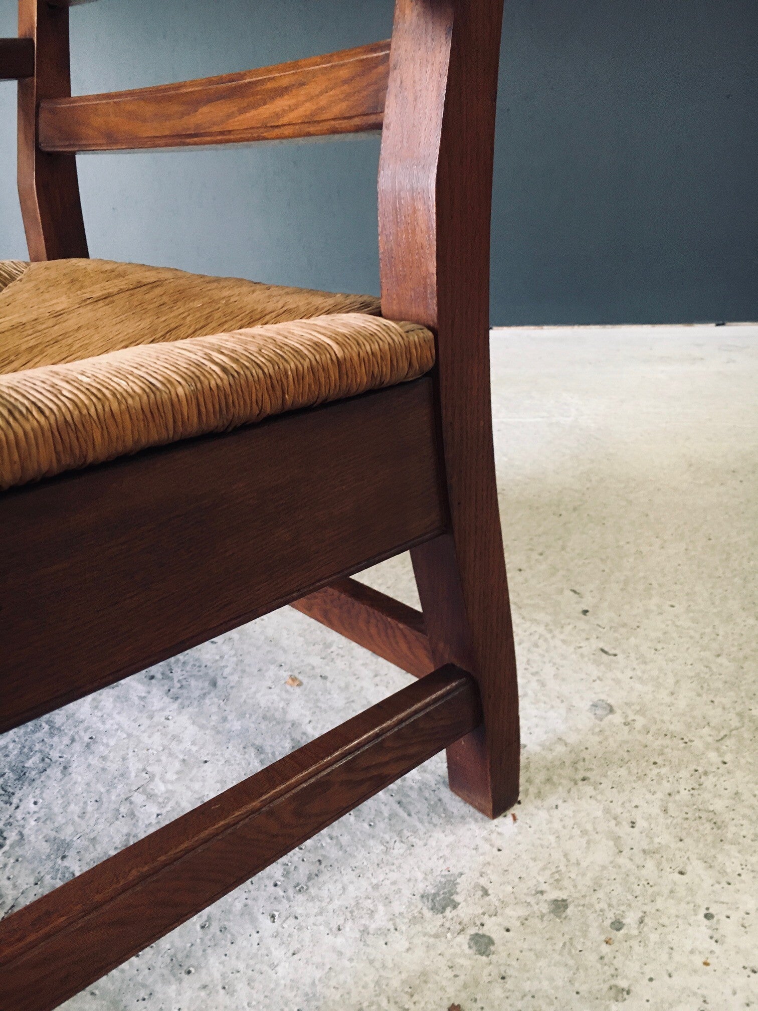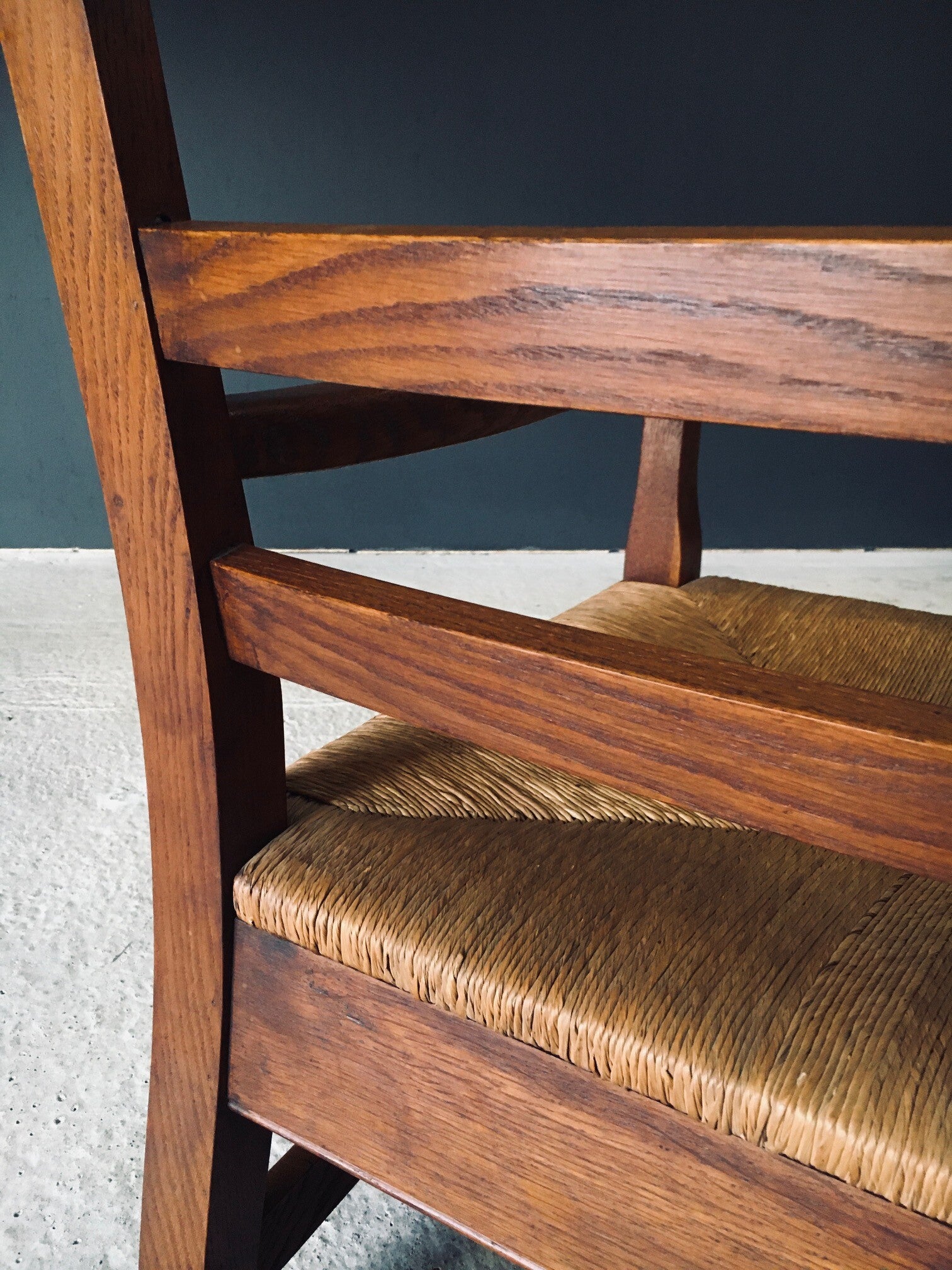 Rustic Solid Design XL Oak & Rush Arm Lounge Chair, France 1930's