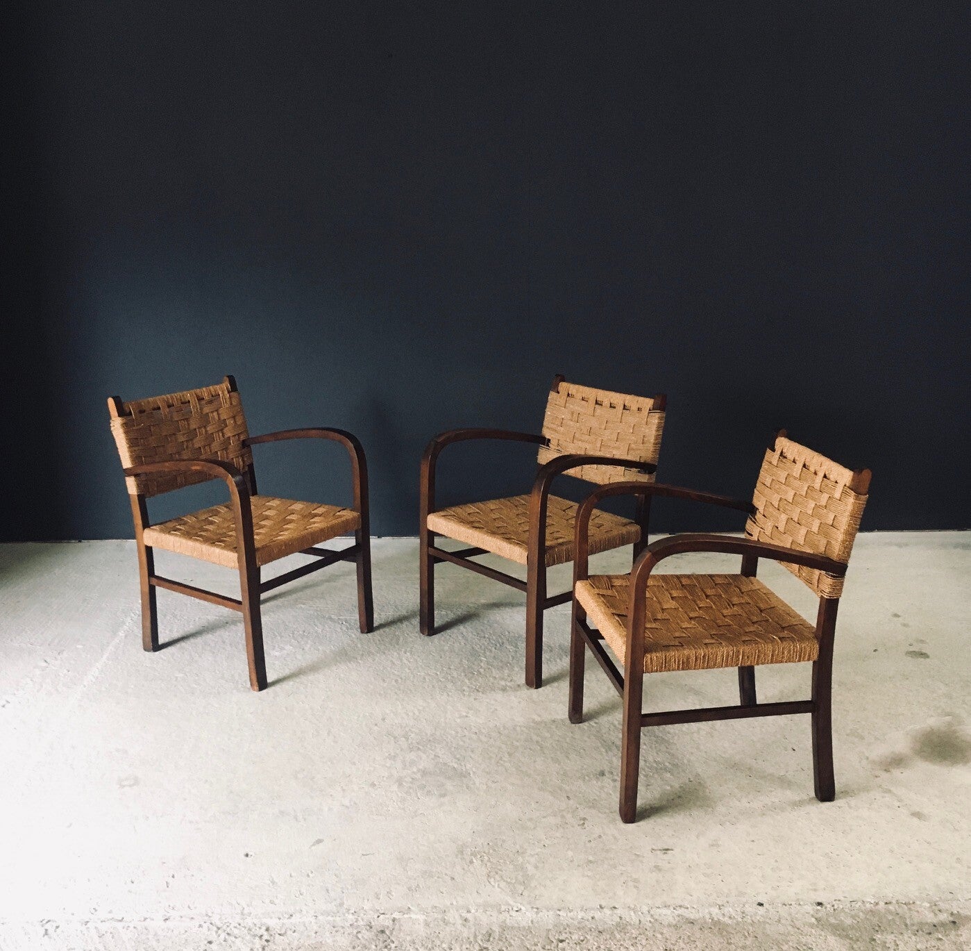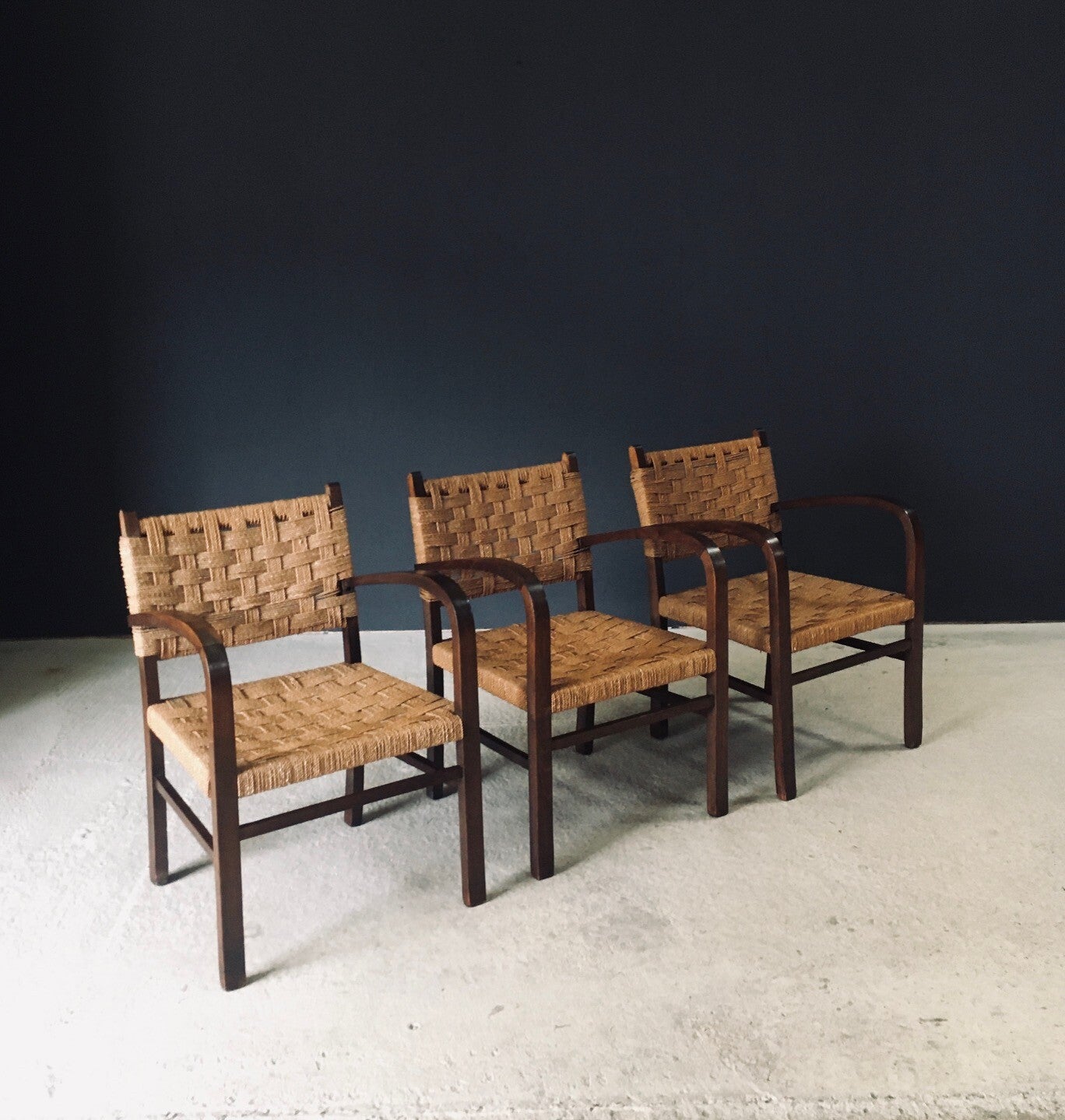 Vintage Bauhaus Modernist Design Rope Armchairs by Erich Dieckmann. Made in Germany, 1930's / 40's period. Beech wood constructed frame with woven rope seat and back. Set of 3 arm chairs, all are in very good, all original condition, no damage. Normal signs of wear from their use and age. Each measures 78cm x 54cm x 55cm. Seat height measures 40cm.