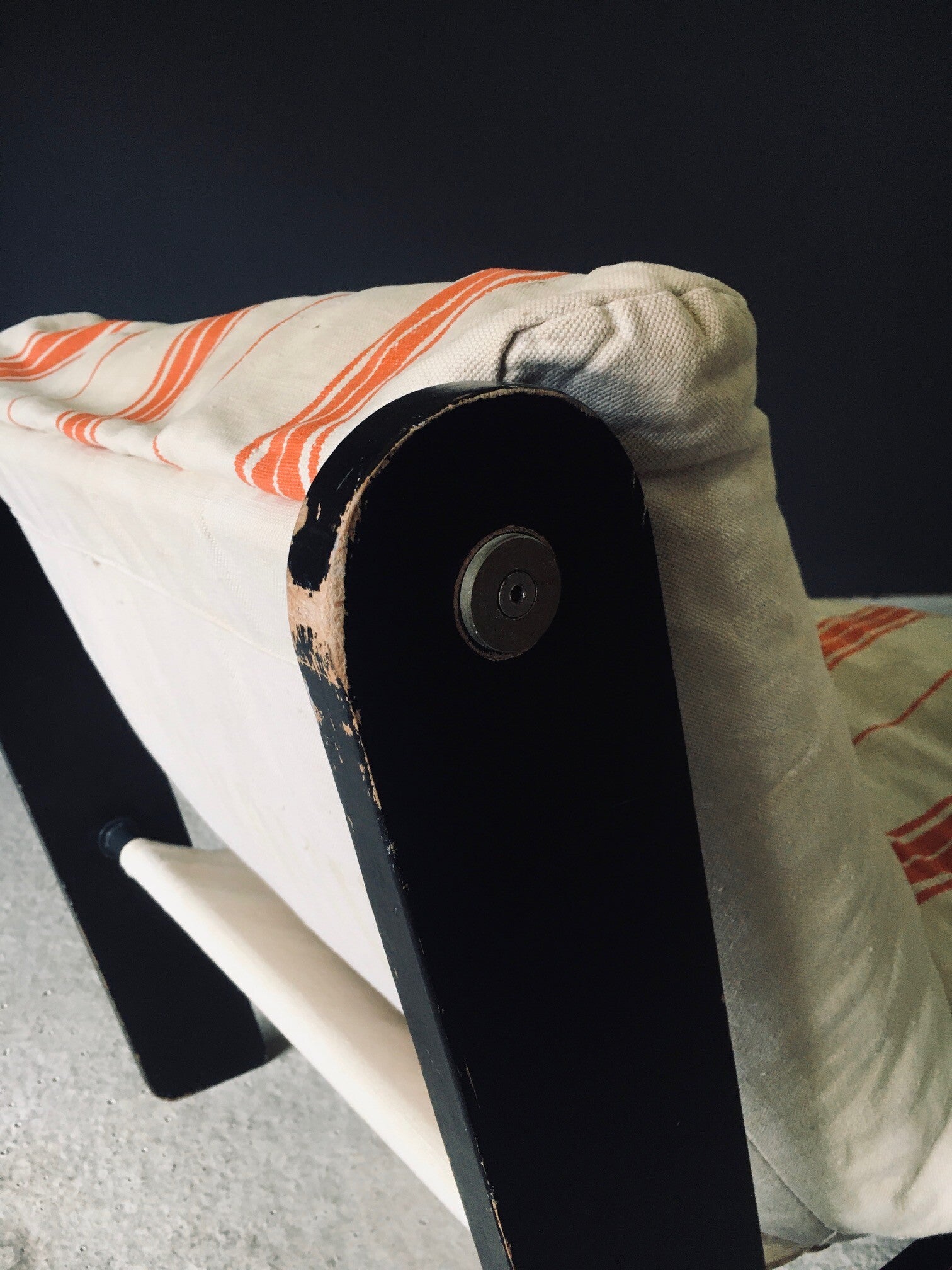 Vintage Design Low Lounge Chair. Made in the 1970's, probably Germany. Black lacquered wooden frame with original striped fabric. This comes in well used condition, with obvious signs of it's use and age. Worn and stained fabric and filling on the seat, scratches and scuffs on the black frame. A piece for the purist lovers. This measures 64cm x 63cm x 87cm. Seat height measures 39cm.