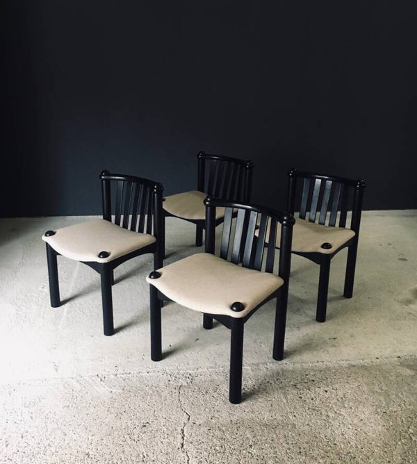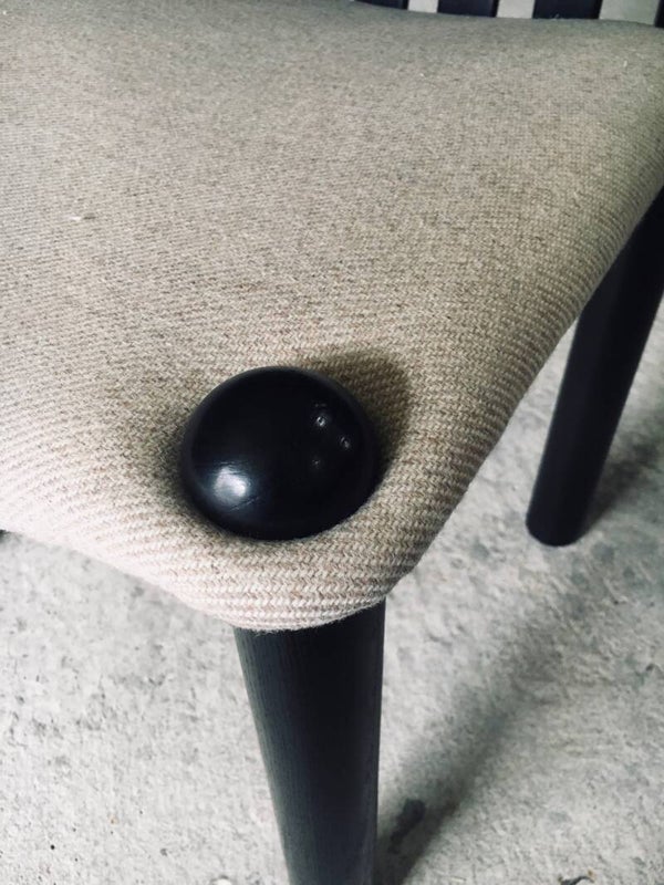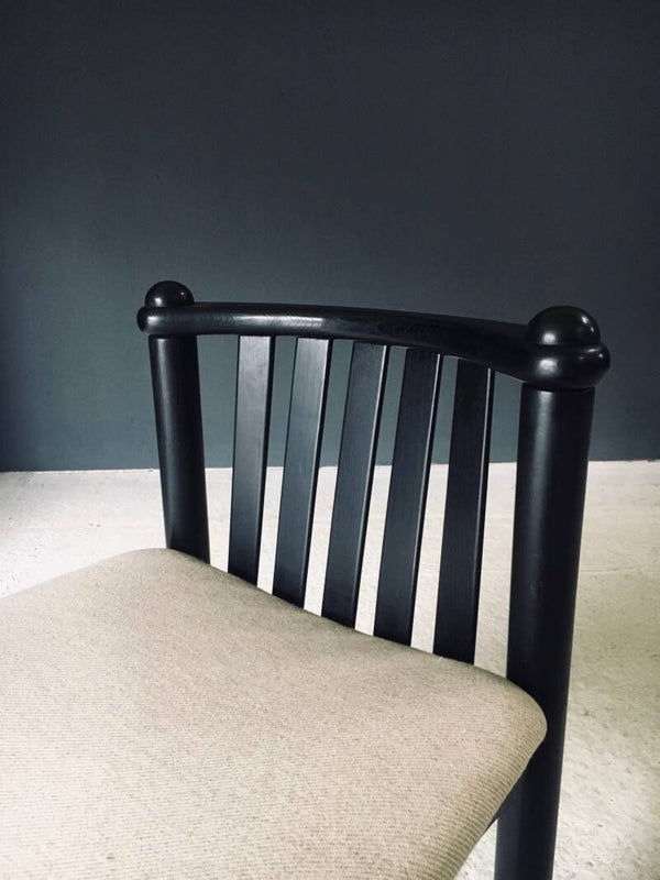 Vintage Brutalist Design Black Dining chair set. Made in Germany, 1970's period. Black lacquered beech wooden frames with newly reupholstered seats in wool fabric. These come in very good condition with minor signs of wear to the black frames from their use and age. Each chair measures 78cm x 57cm x 50cm. Seat height measures 44cm.