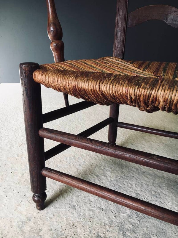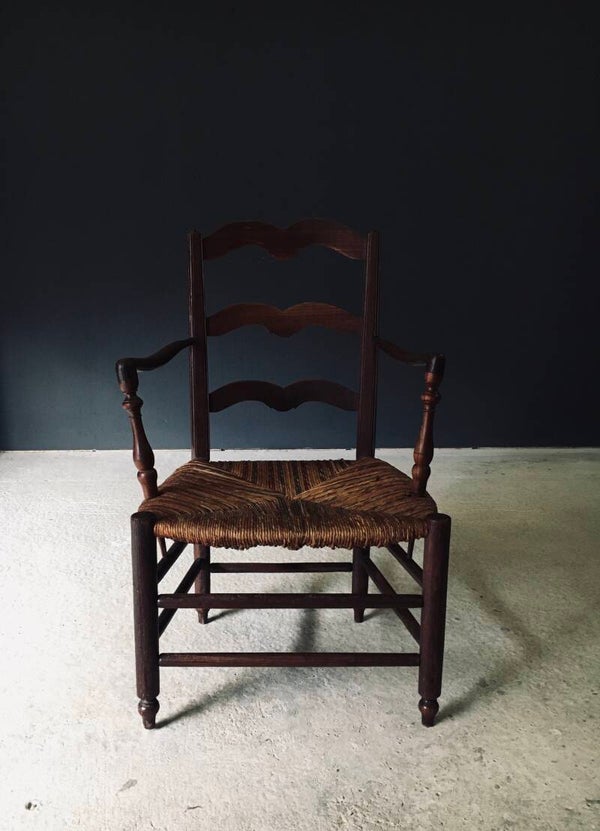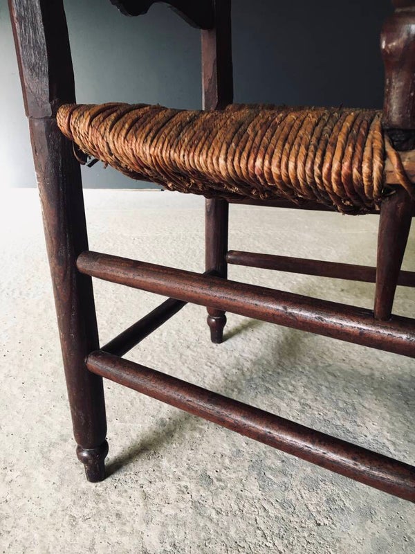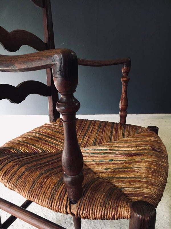Vintage Early 20th Century French Country Style Design Hand Crafted Armchair. Made in France, 1910/20's period. Solid Oak constructed frame with woven rush seat. The seat is woven and colored with green and red. This arm chair comes in good, all original condition. The spindles that hold the arm rests have come loose in the chair base, but this does not affect the sturdiness. This measures 93cm x 60cm x 50cm. Seat height is 39cm.