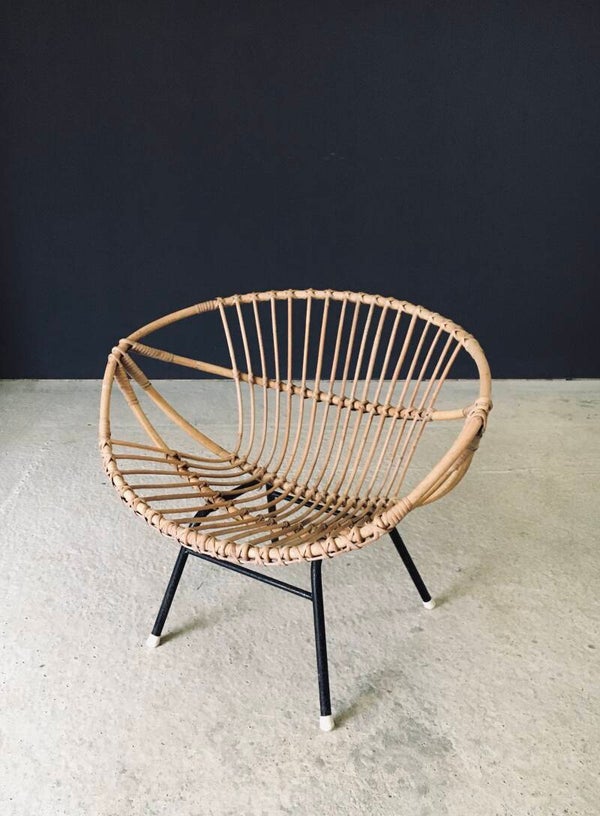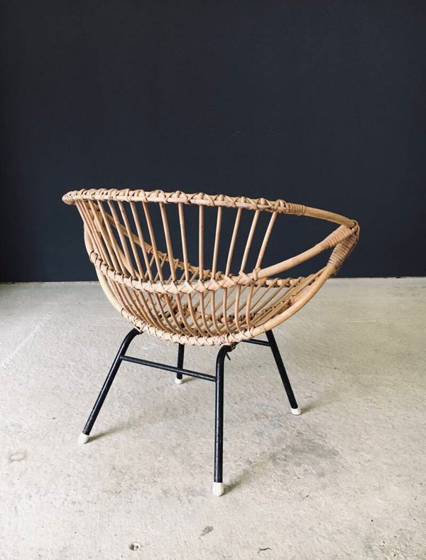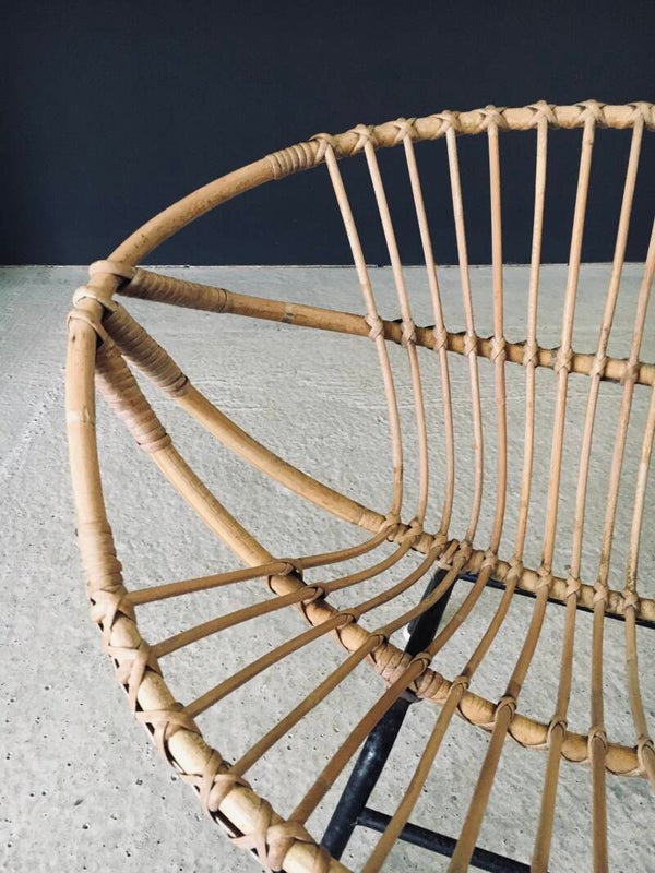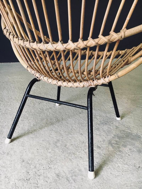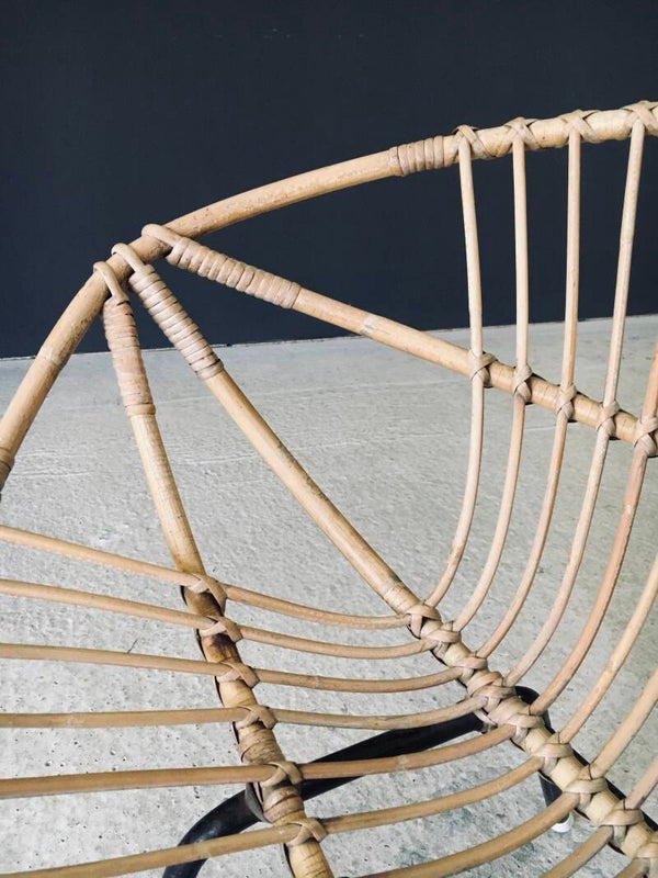 Vintage Midcentury Modern Design Bamboo Lounge Chair. Made in France, 1950's period. Bamboo bent and woven shell shape lounge arm chair on black stained metal H frame. This comes in very good, all original condition. With normal signs of wear for it's age and use. The metal base has scuffs and flakes in the black paint. This measures 66cm x 79cm x 61cm. Seat height measures 37cm.