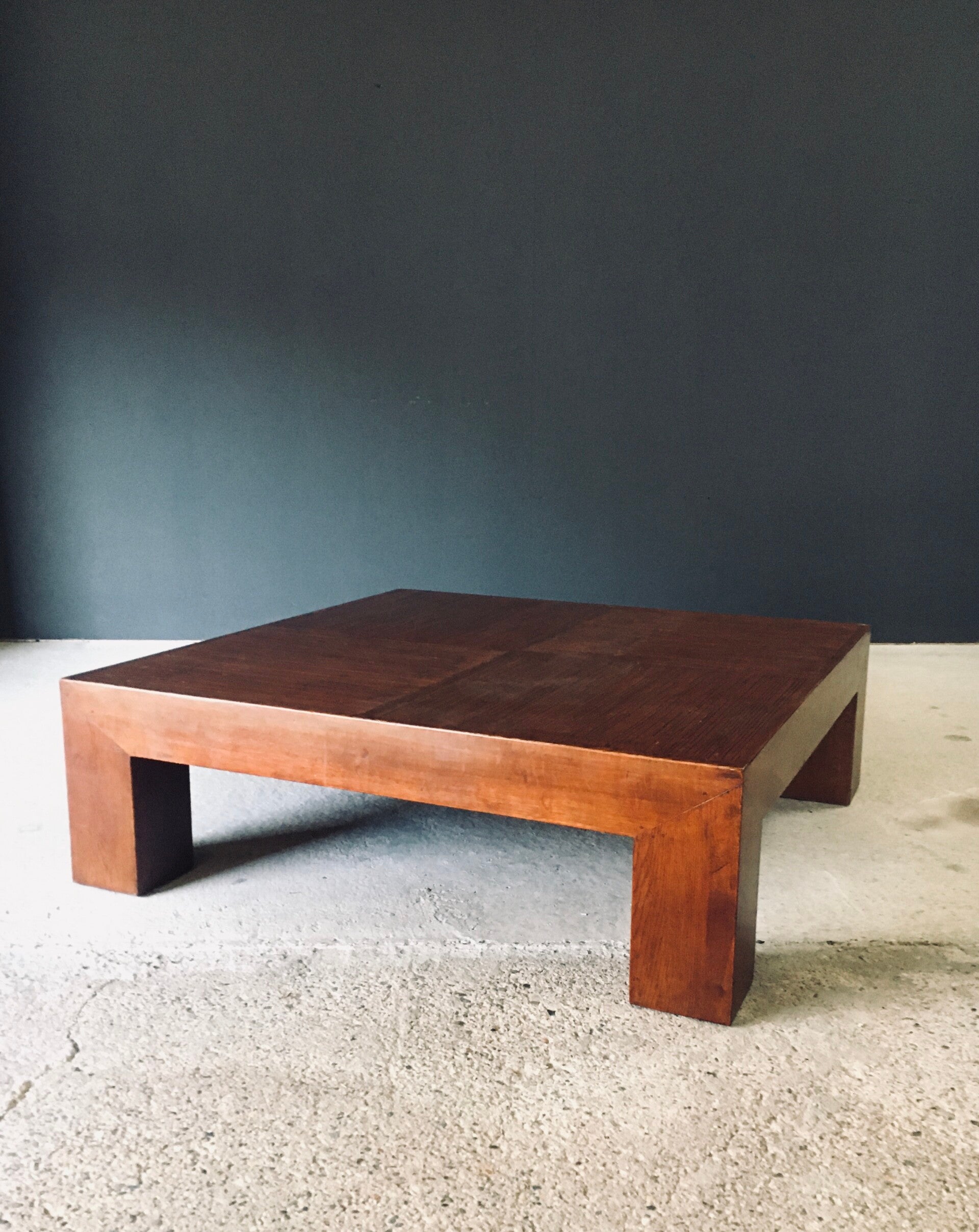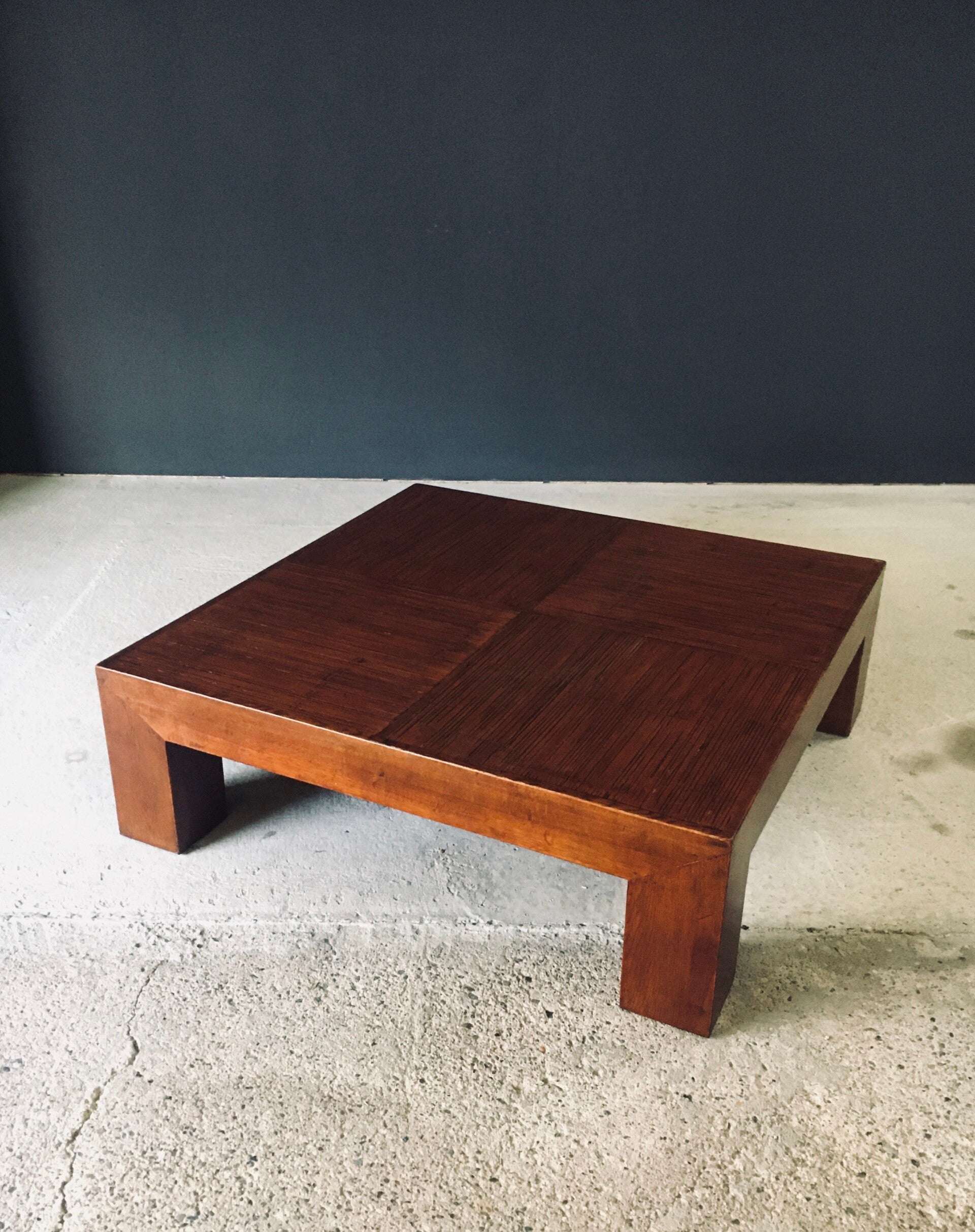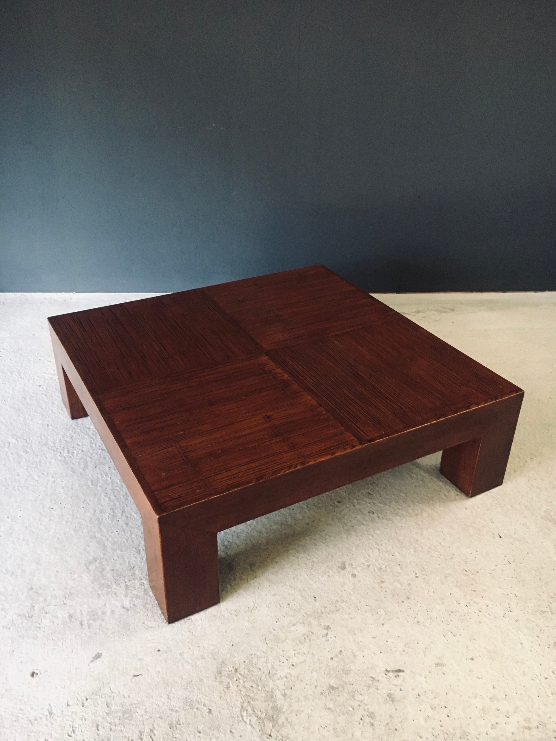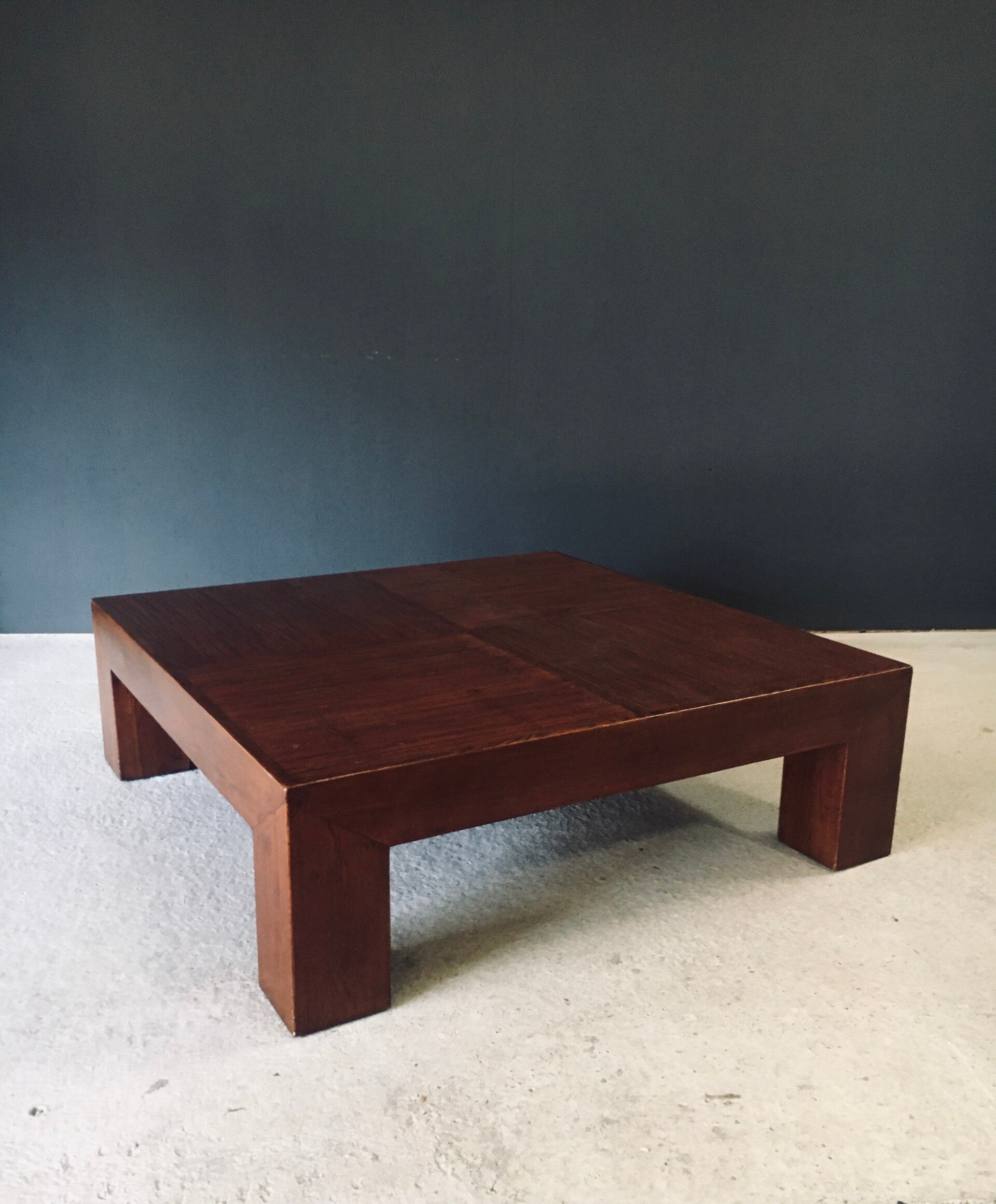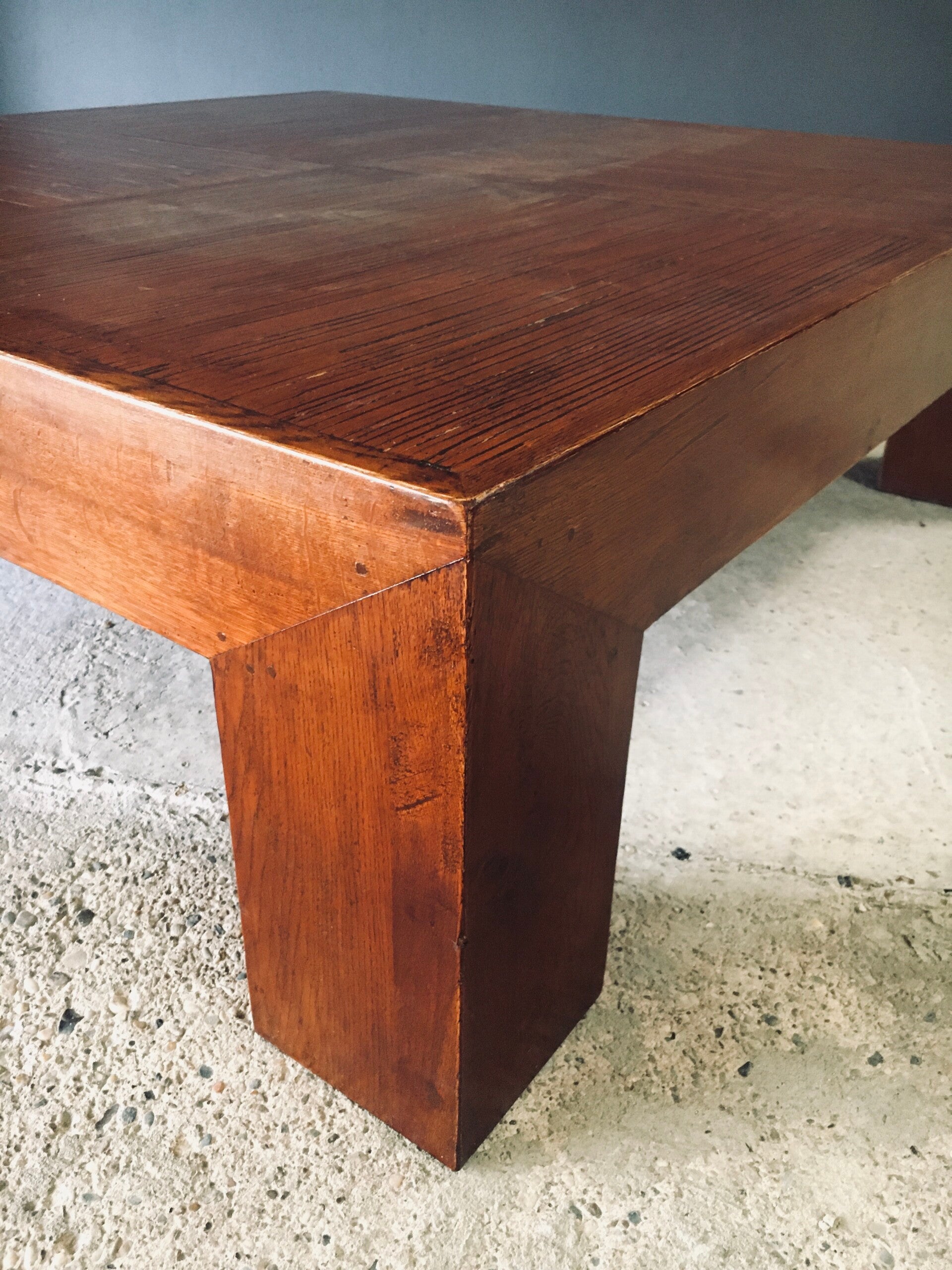 Vintage Postmodern Design XL Teak Checkered Coffee Table in the style of Parsons. Made in the United States, 1980's period. Has a label on the bottom. Teak wood construction with checkered inlaid top. This comes in very good, all original condition. Has normal signs of wear from it's use and age. Measures 38cm x 120cm x 120cm.