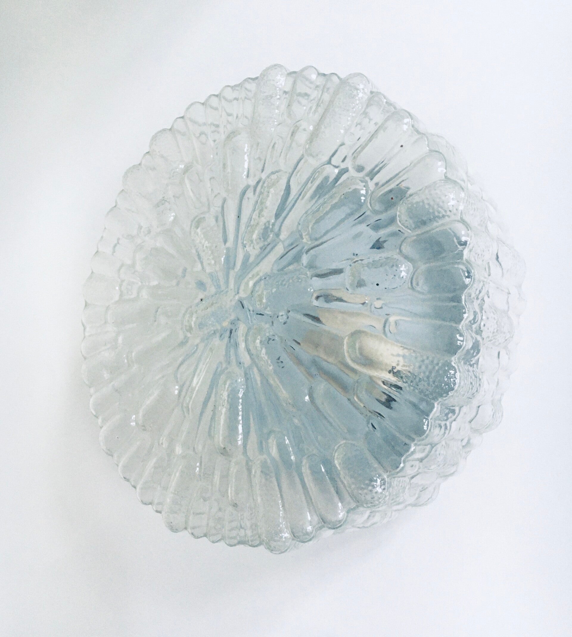 Vintage Design Ice Crystal Glass Wall Lamp. Made in Germany, 1960's / 70's period. Pressed glass round wall lamp. This comes in very good condition. Measures 10cm x 25cm x 25cm.