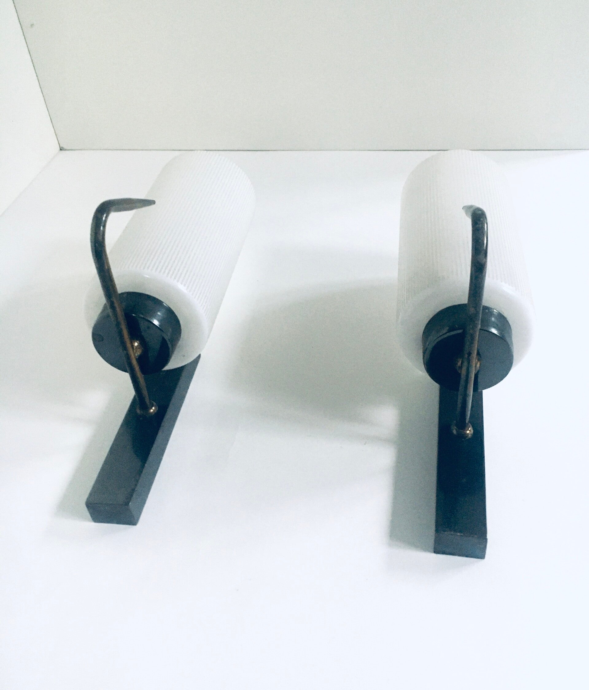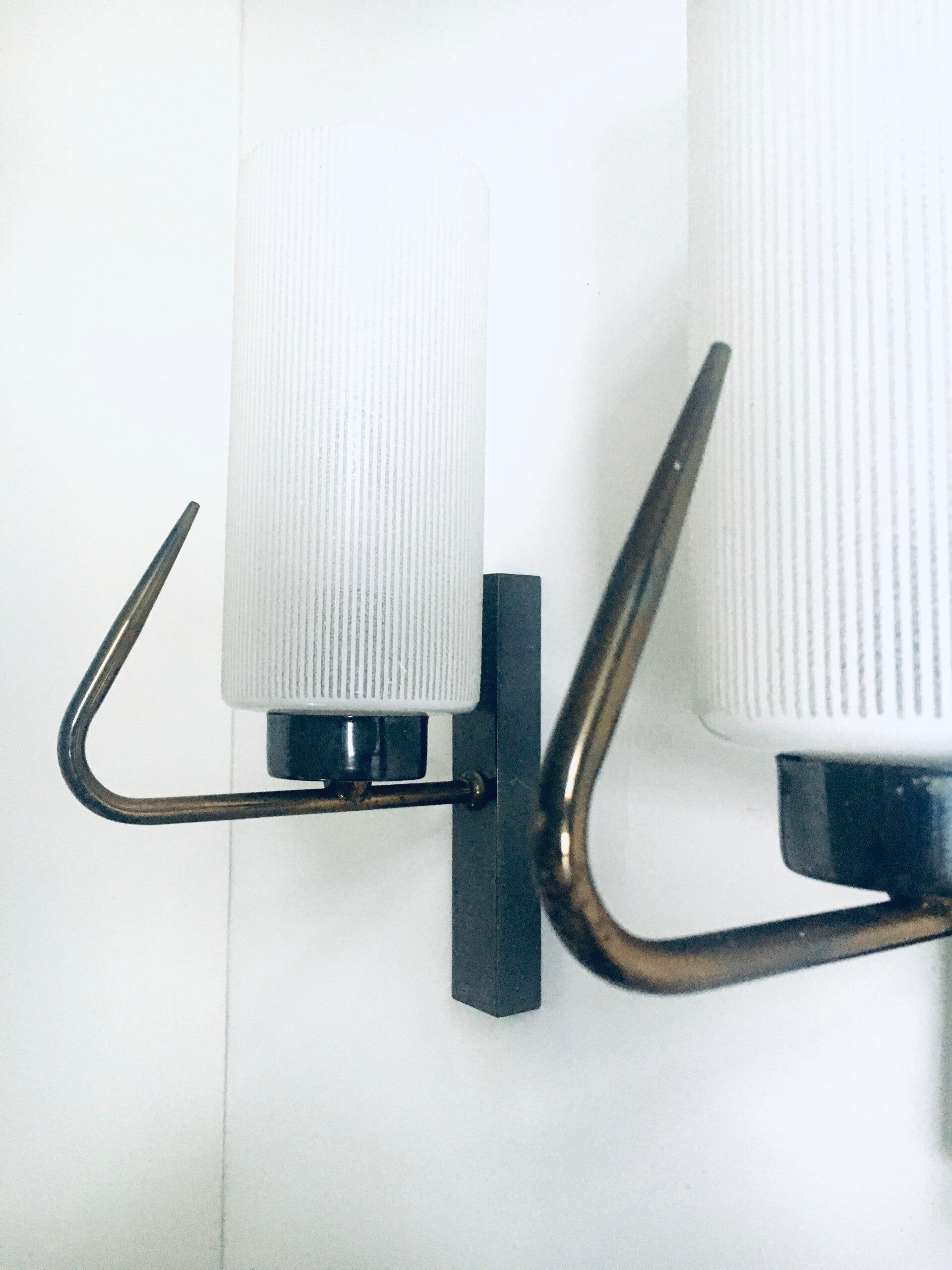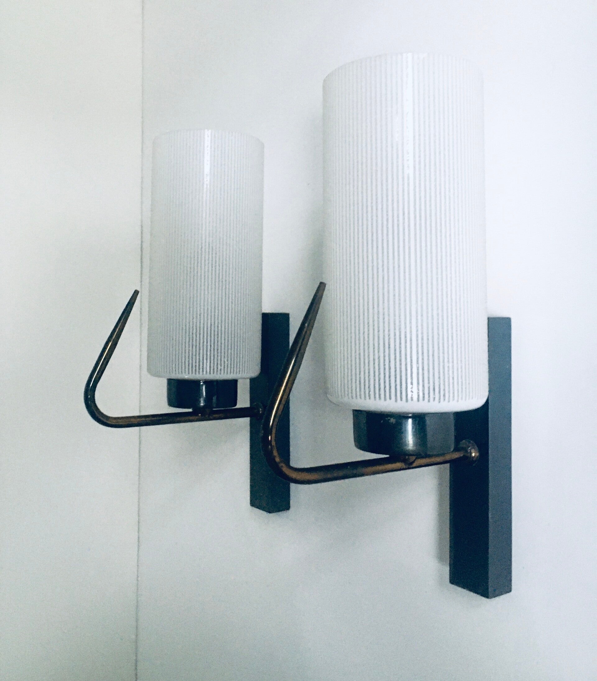 Vintage Midcentury Design Brass & Etched Glass Wall Lamp Sconce Set. Made in France, 1950's period. Brass toned wall fitting and white glass with etched stripes. These come in good condition, with normal signs of wear from their age and use. These measure 28cm x 16,5cm x 8,5cm.