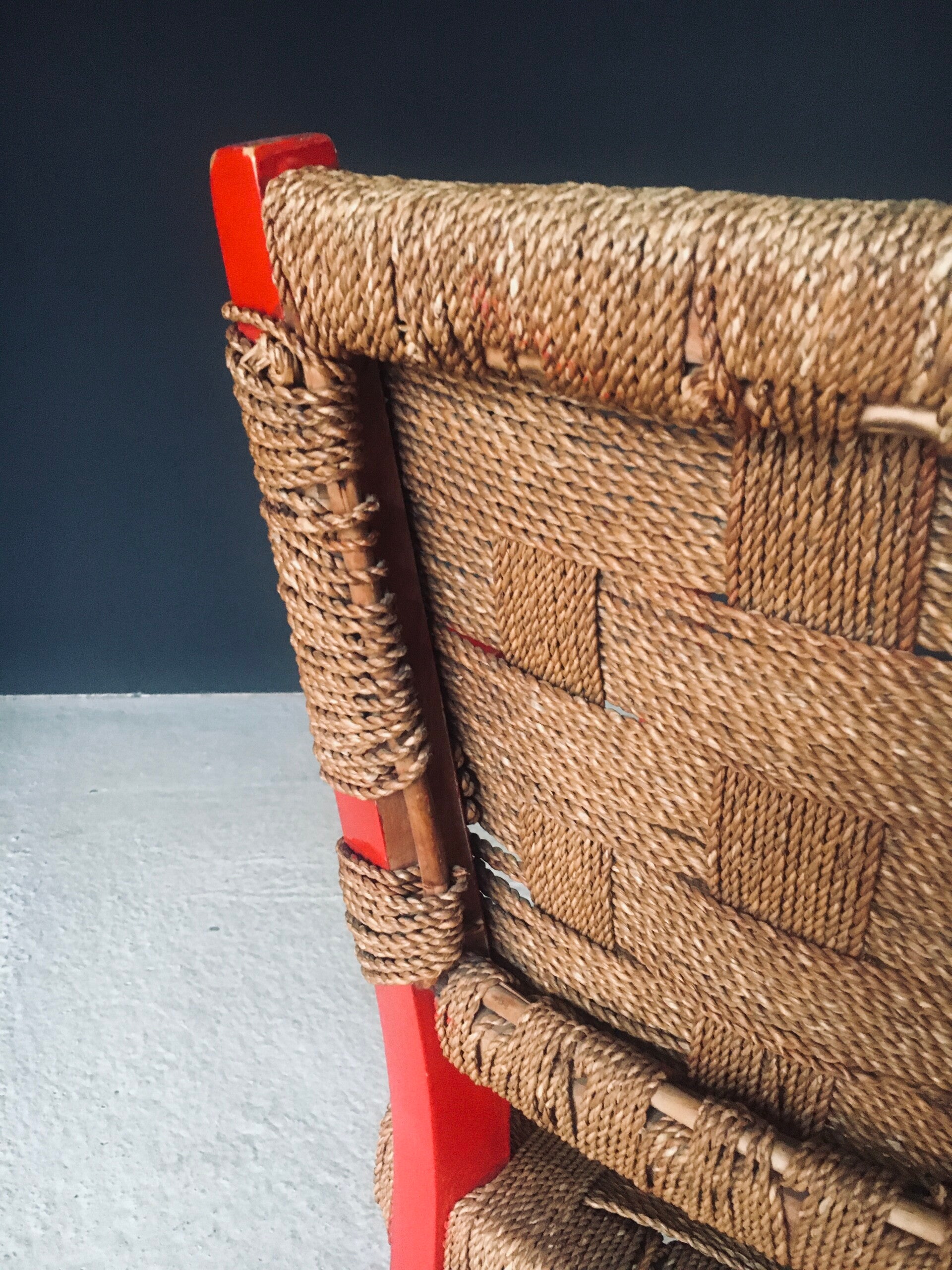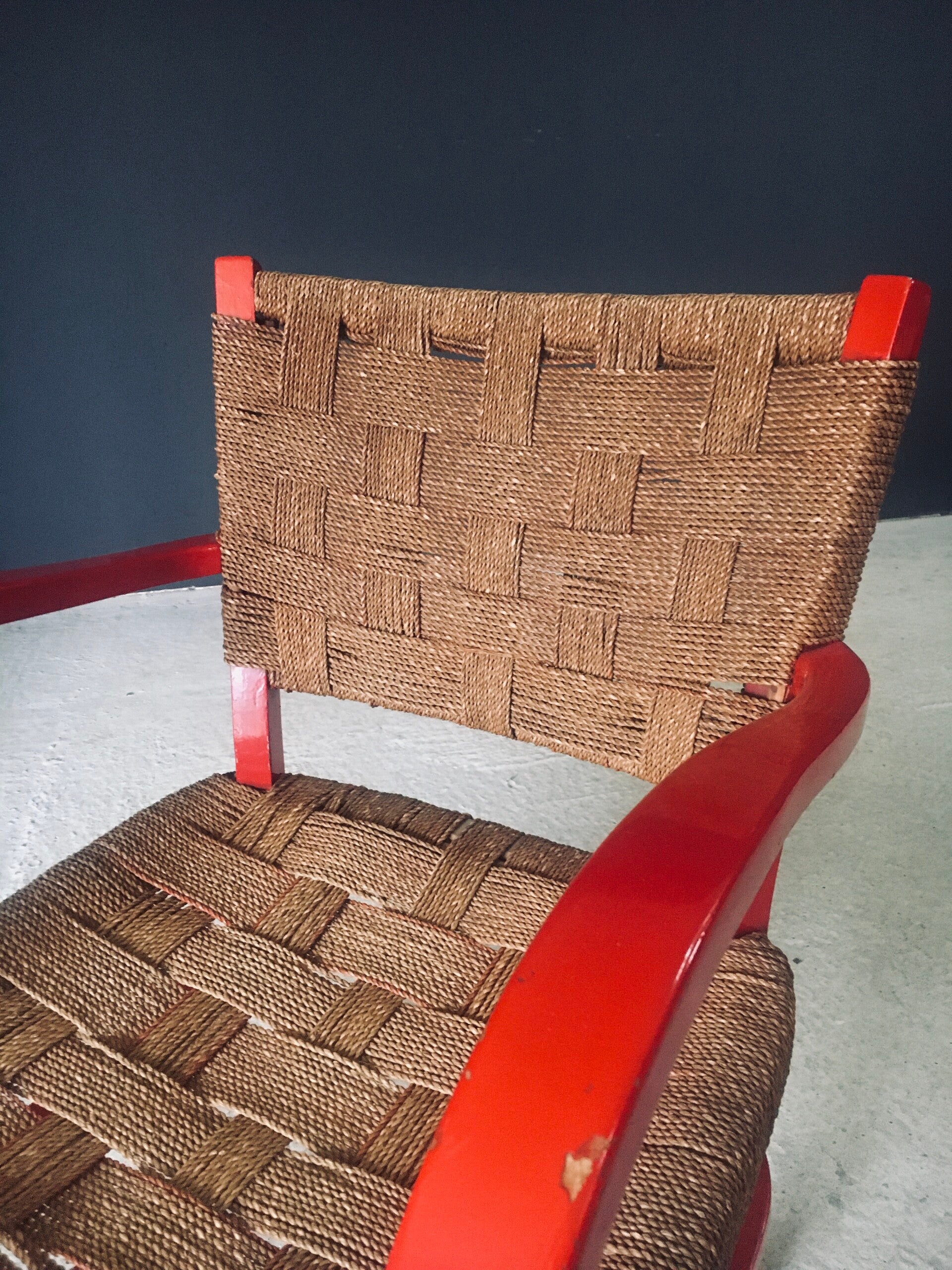 Vintage Mediterranean Design Arm Chair Set 2. Made in France, 1950's period. Red lacquered beech frame with woven rope seat and backrest. In the manner of Adrien Audoux & Frida Minet designs. These come in good, all original condition. They both have wear and signs of their age and use. Each measures 80cm x 56cm x 63cm. Seat height measures 41cm.