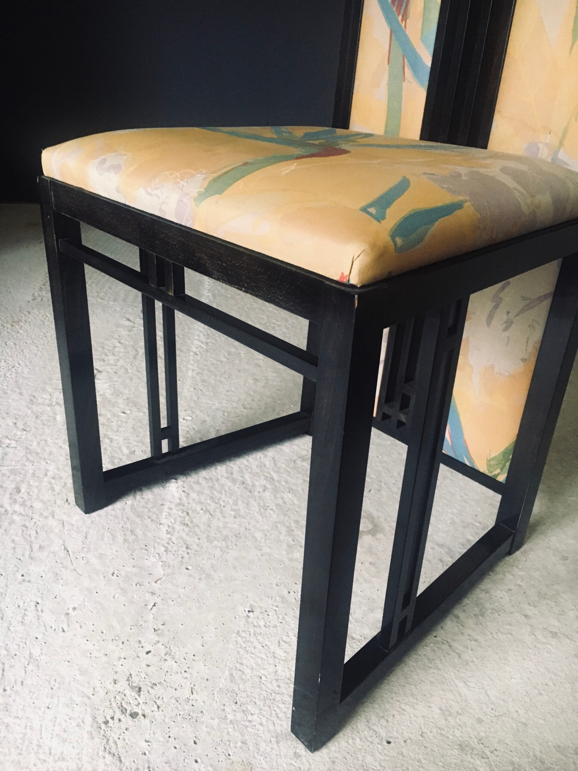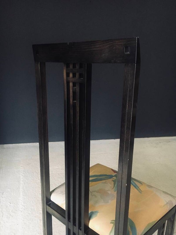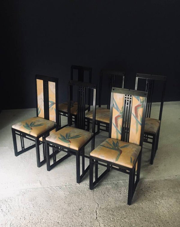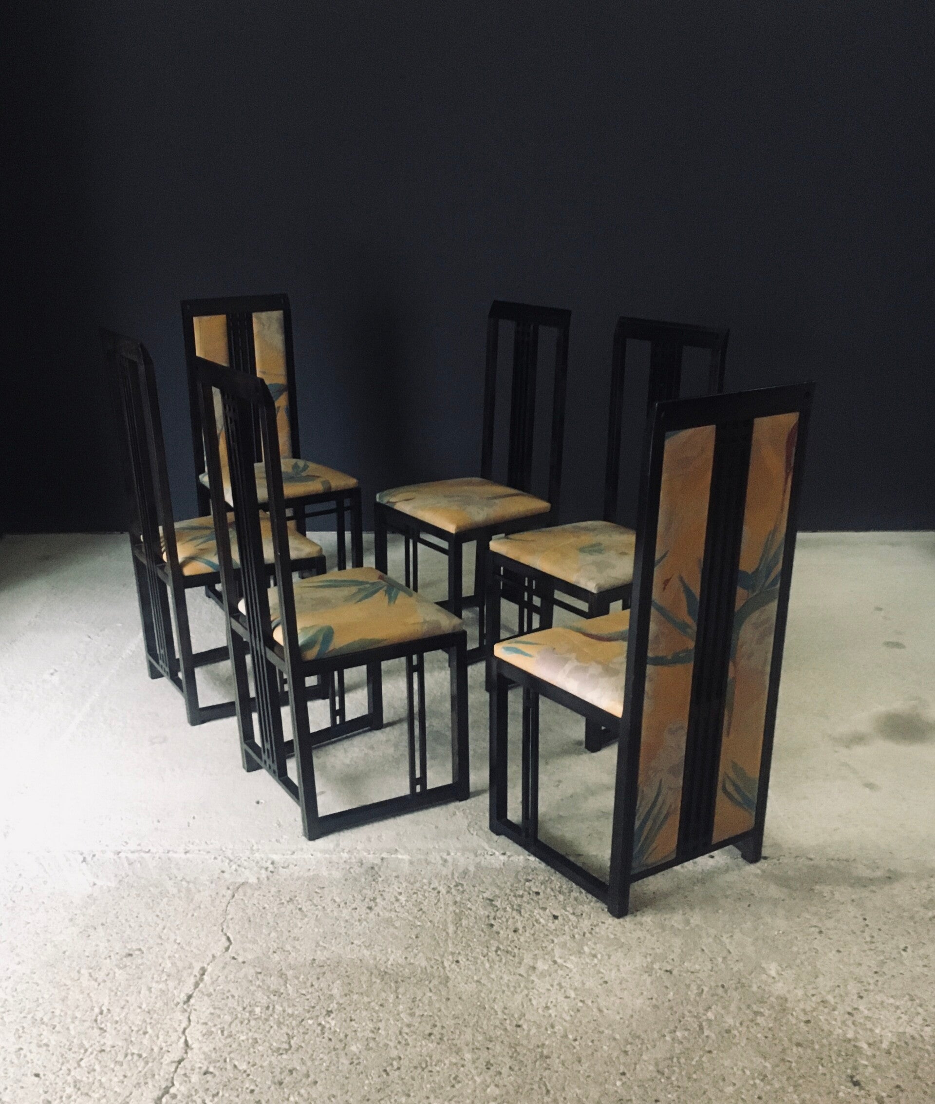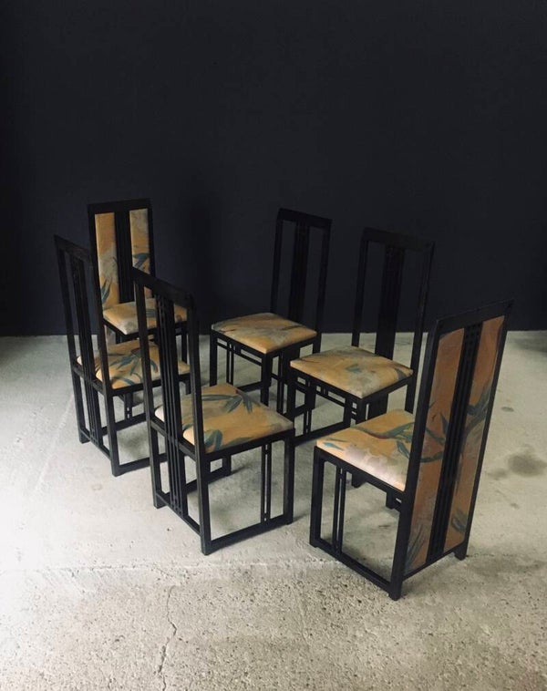 Vintage Postmodern Design "Galaxy" Series Dining Chair set of 6 by Umberto Asnago for Giorgetti. Made in Italy, 1980's period. Black lacquered wooden frame with tropical print fabric on these architectural designed high back chairs. This consists of 4 regular chairs and 2 with fabric filled back. All chair come in good, original condition. They all have wear marks. Fabric scuffs, small rips, discoloration and some stains. Regular wear from their use and age. Each chair measures 107cm x 47cm x 46cm. Seat height measures 47cm.