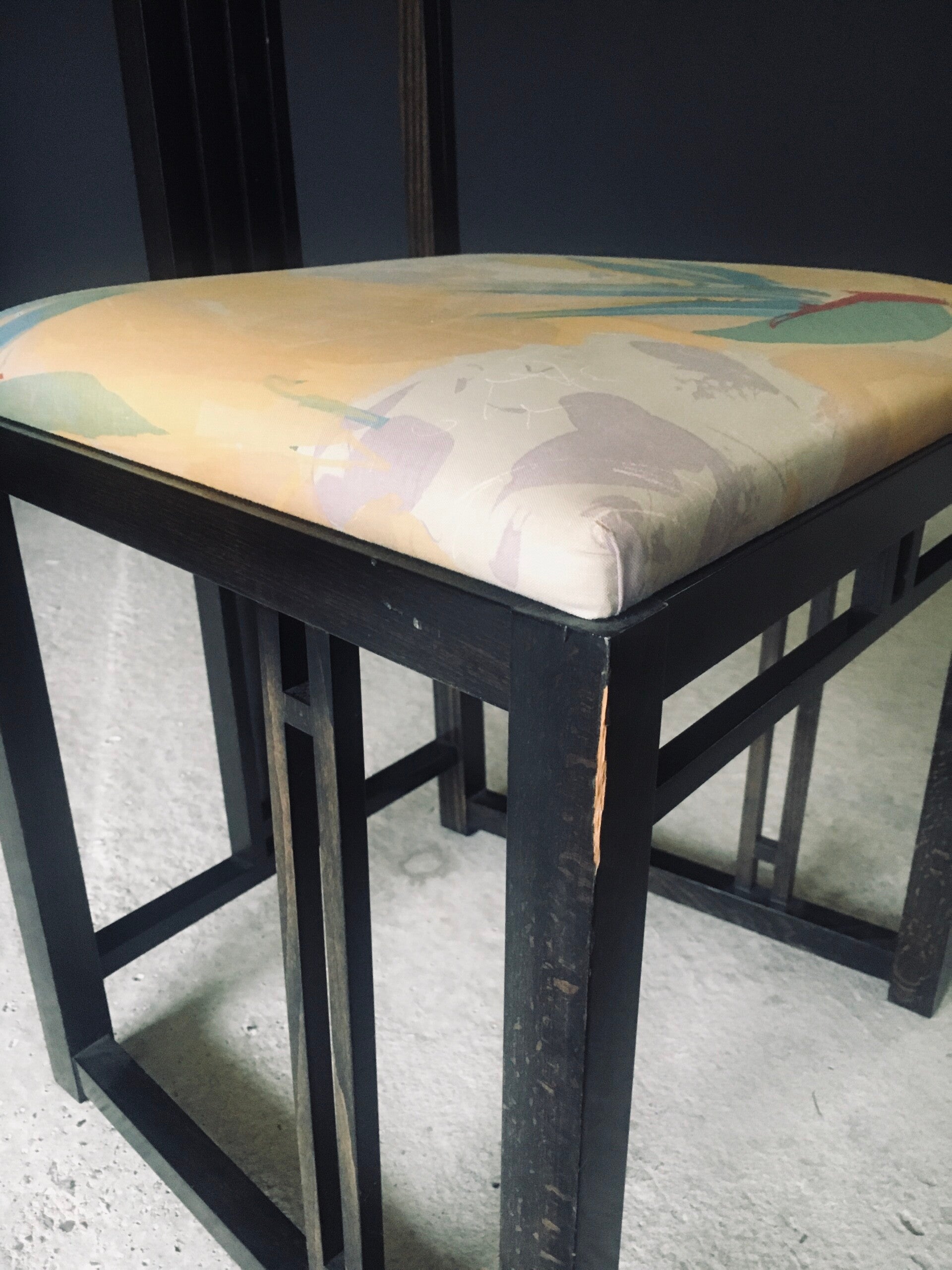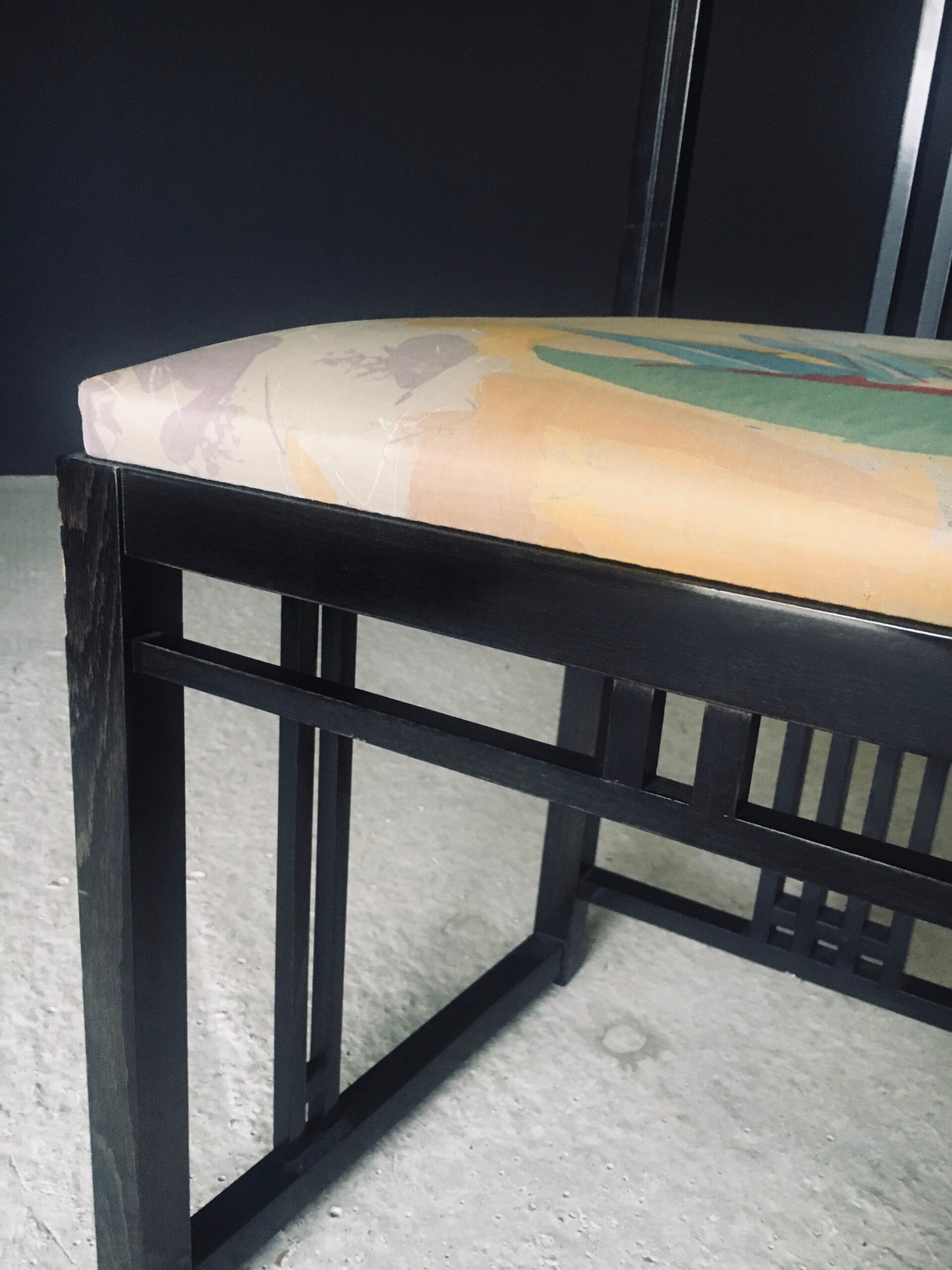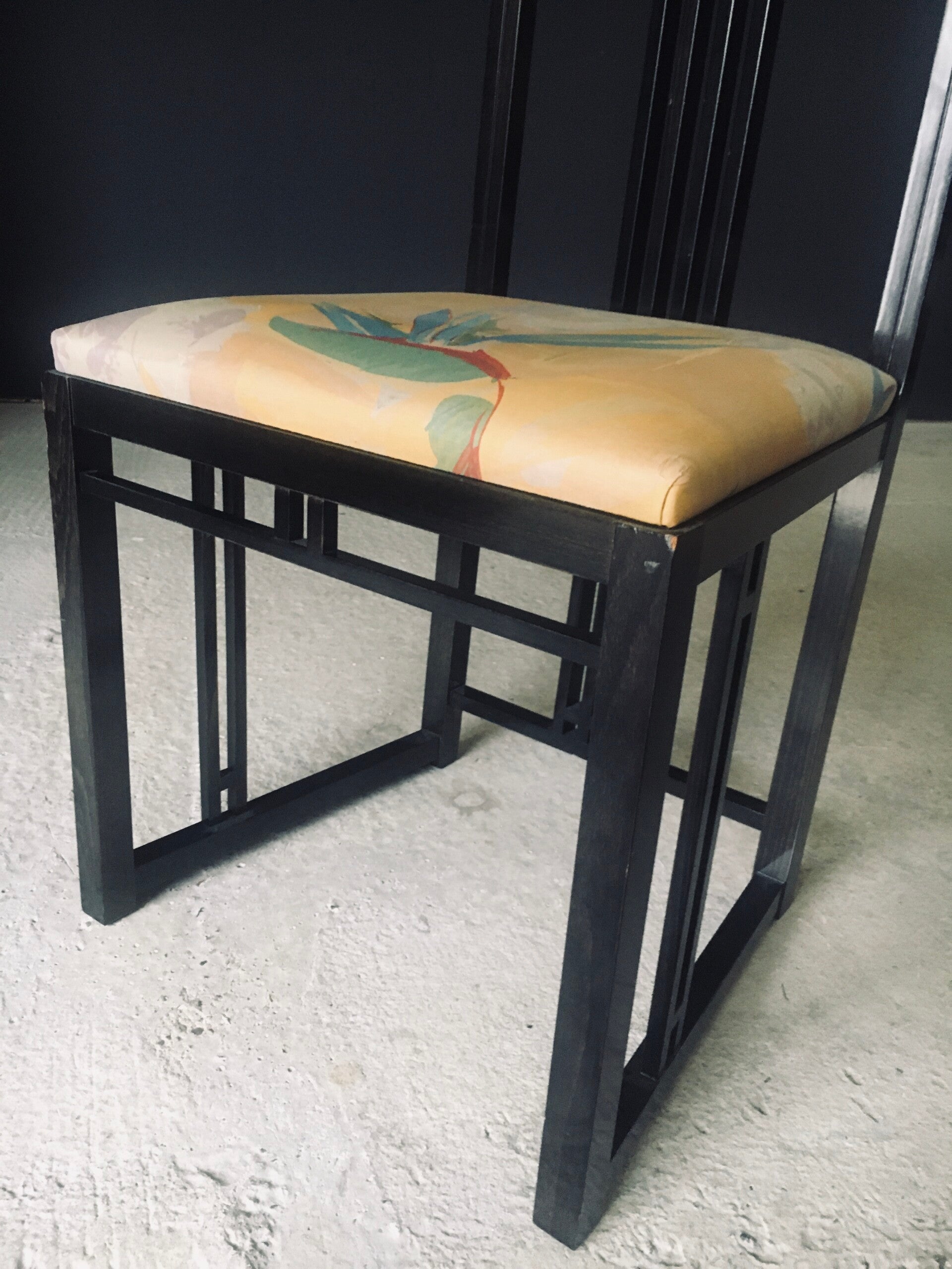 Vintage Postmodern Design "Galaxy" Series Dining Chair set of 6 by Umberto Asnago for Giorgetti. Made in Italy, 1980's period. Black lacquered wooden frame with tropical print fabric on these architectural designed high back chairs. This consists of 4 regular chairs and 2 with fabric filled back. All chair come in good, original condition. They all have wear marks. Fabric scuffs, small rips, discoloration and some stains. Regular wear from their use and age. Each chair measures 107cm x 47cm x 46cm. Seat height measures 47cm.