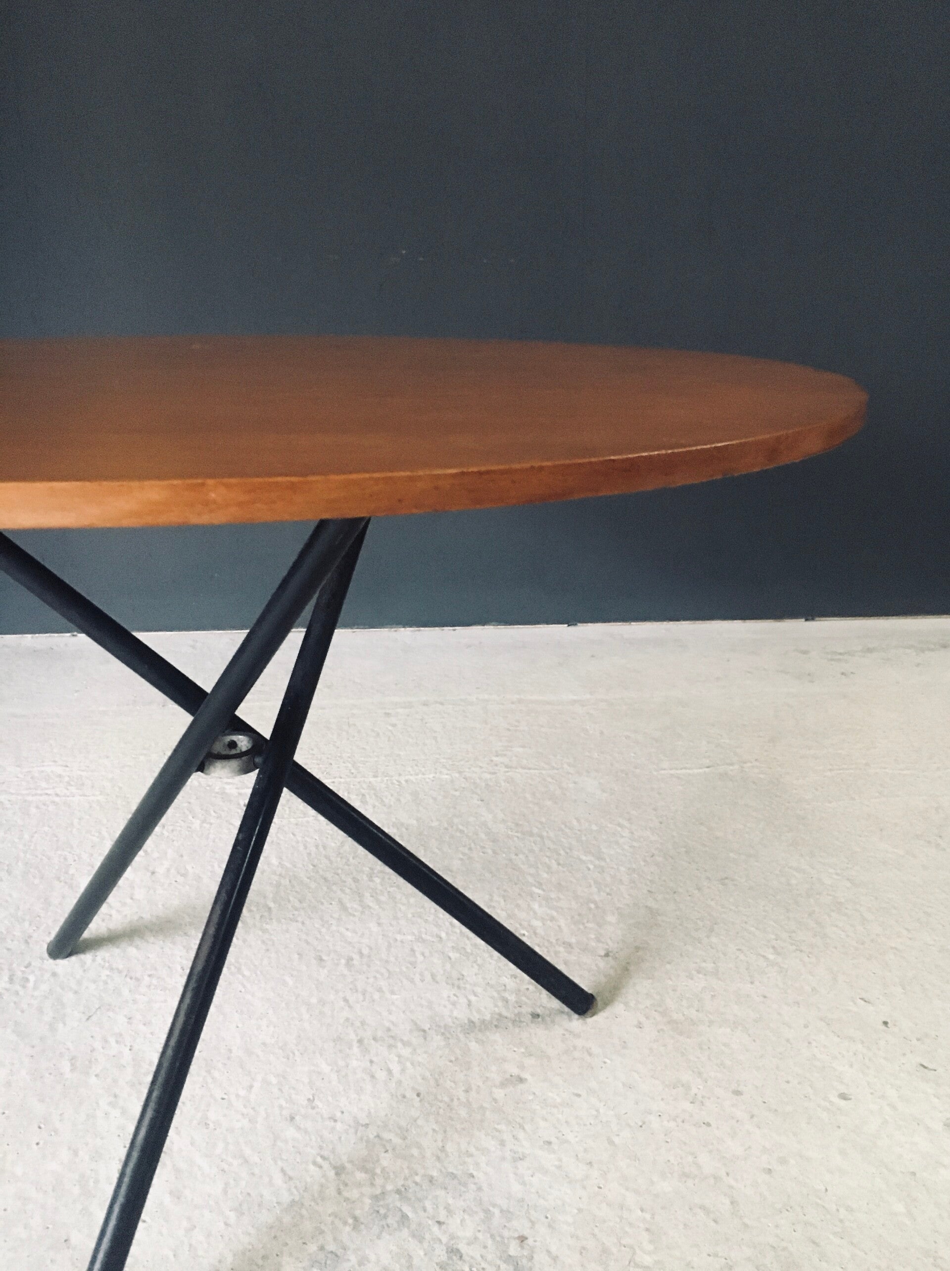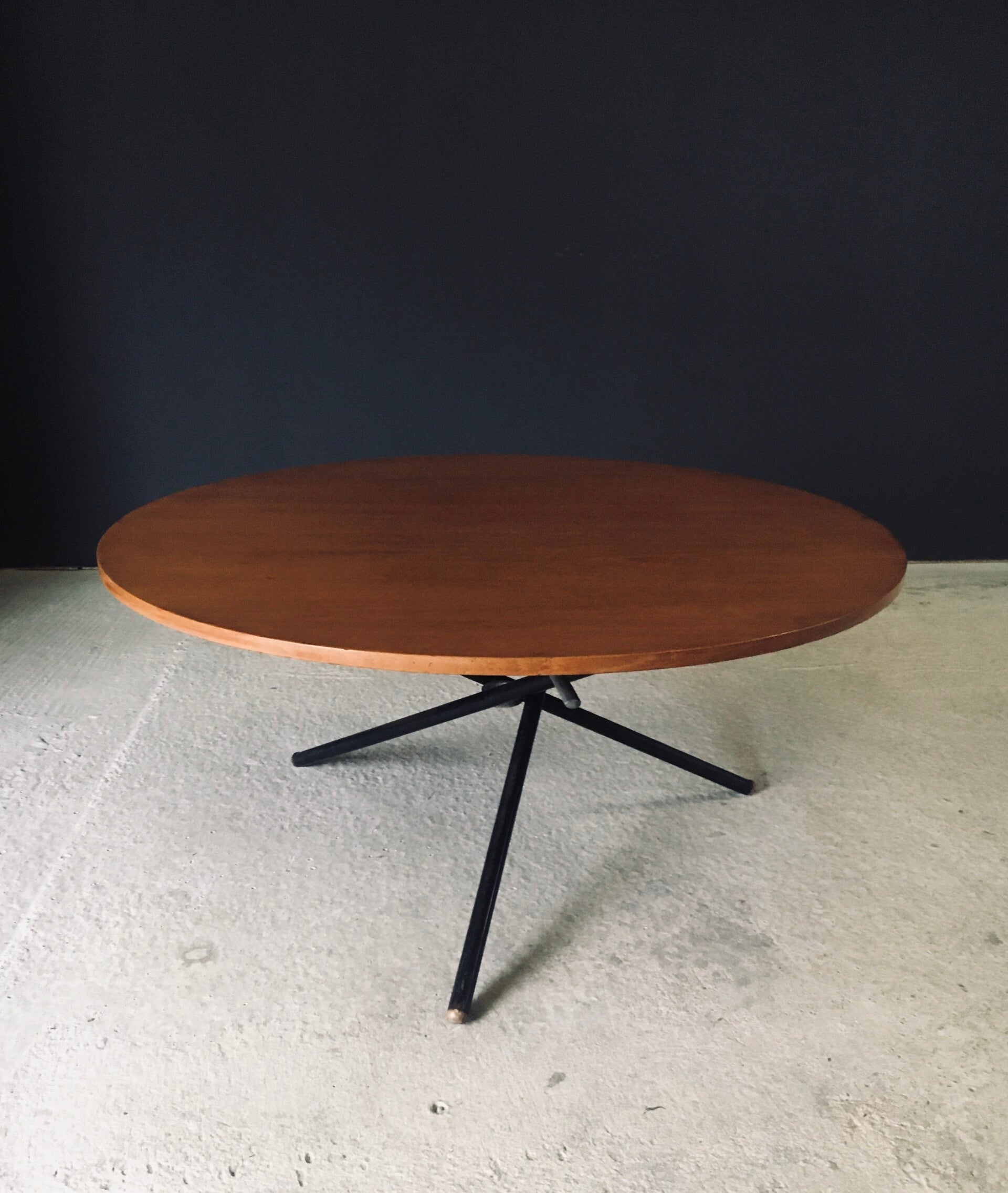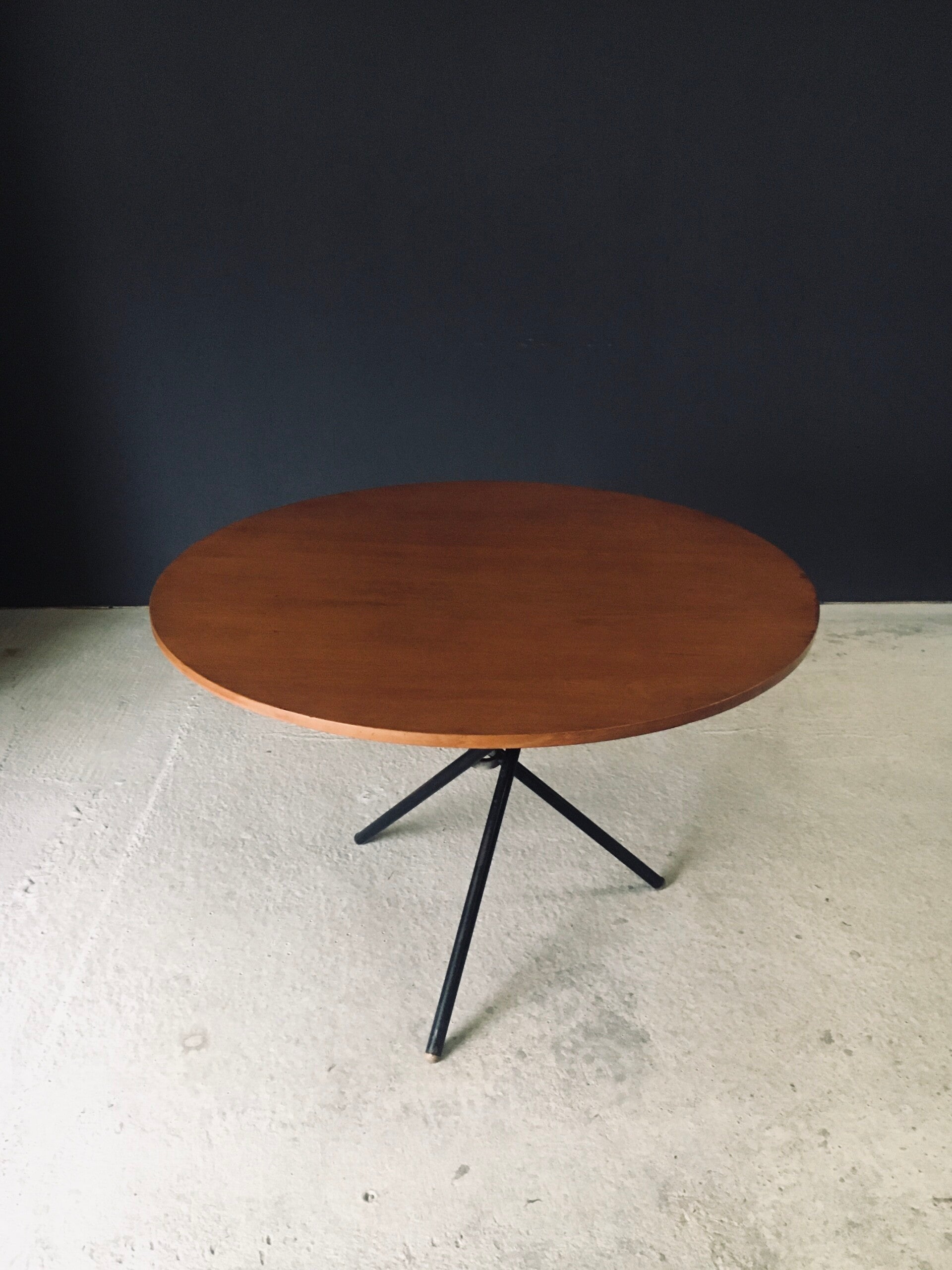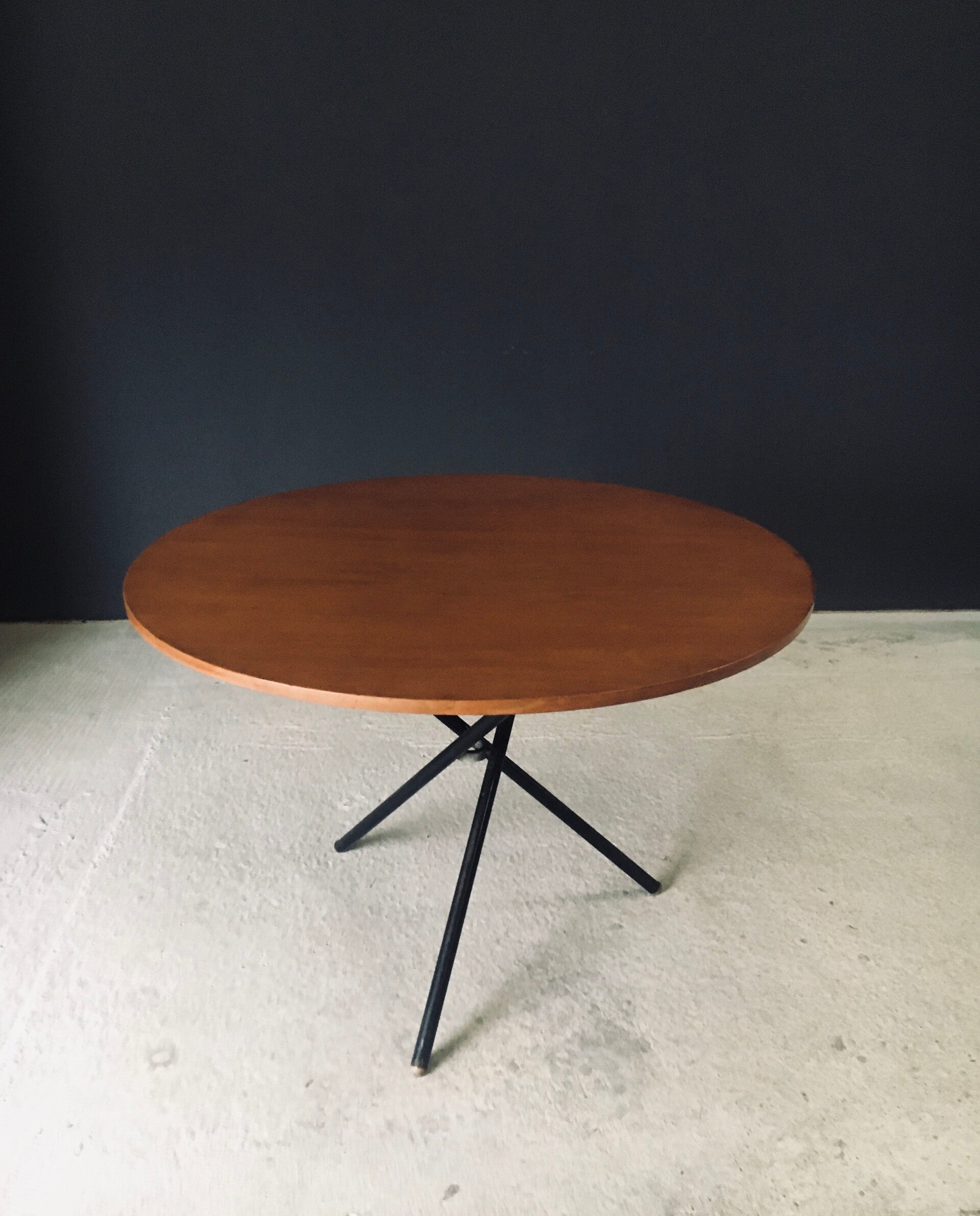 Vintage Midcentury Modern Italian Design very rare and multifunctional table by Jürg Bally for Arform. Made in Italy, 1950's period. The table has it's original label that has a serial number 80. This table with maple veneer table top and black lacquered steel legs topped with wood feet can be elevated to different heights. As a dining table, low centre table or coffee table. This comes in good, all original condition. Has normal signs of wear from it's age and use. The mechanism still works and holds the table in place at the different heights. This table measures as dining table: 76cm x 115cm x 115cm - as centre table: 54cm high and as coffee table 47cm high.