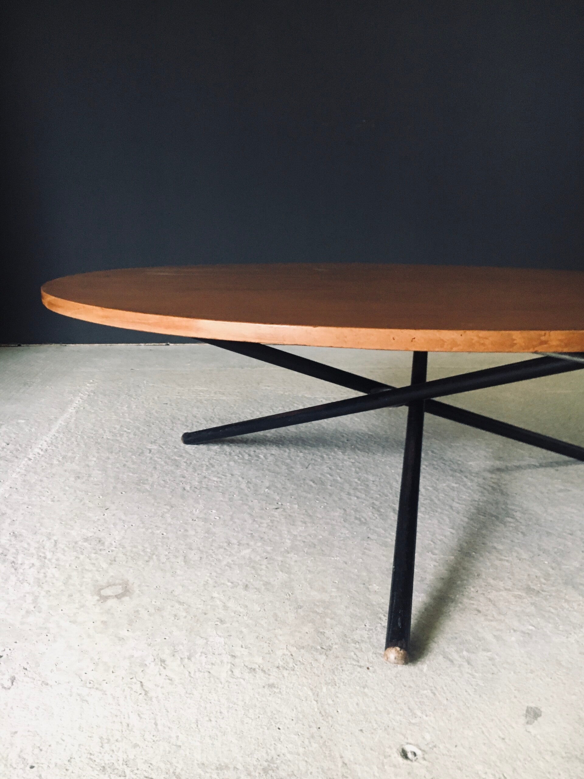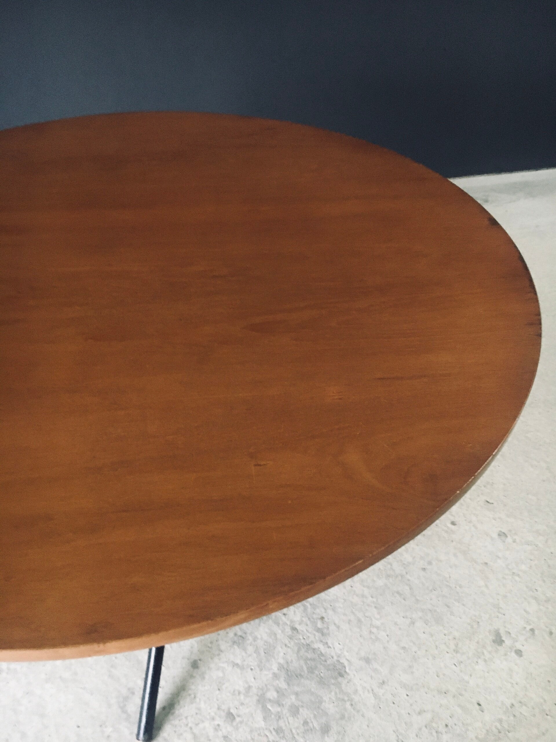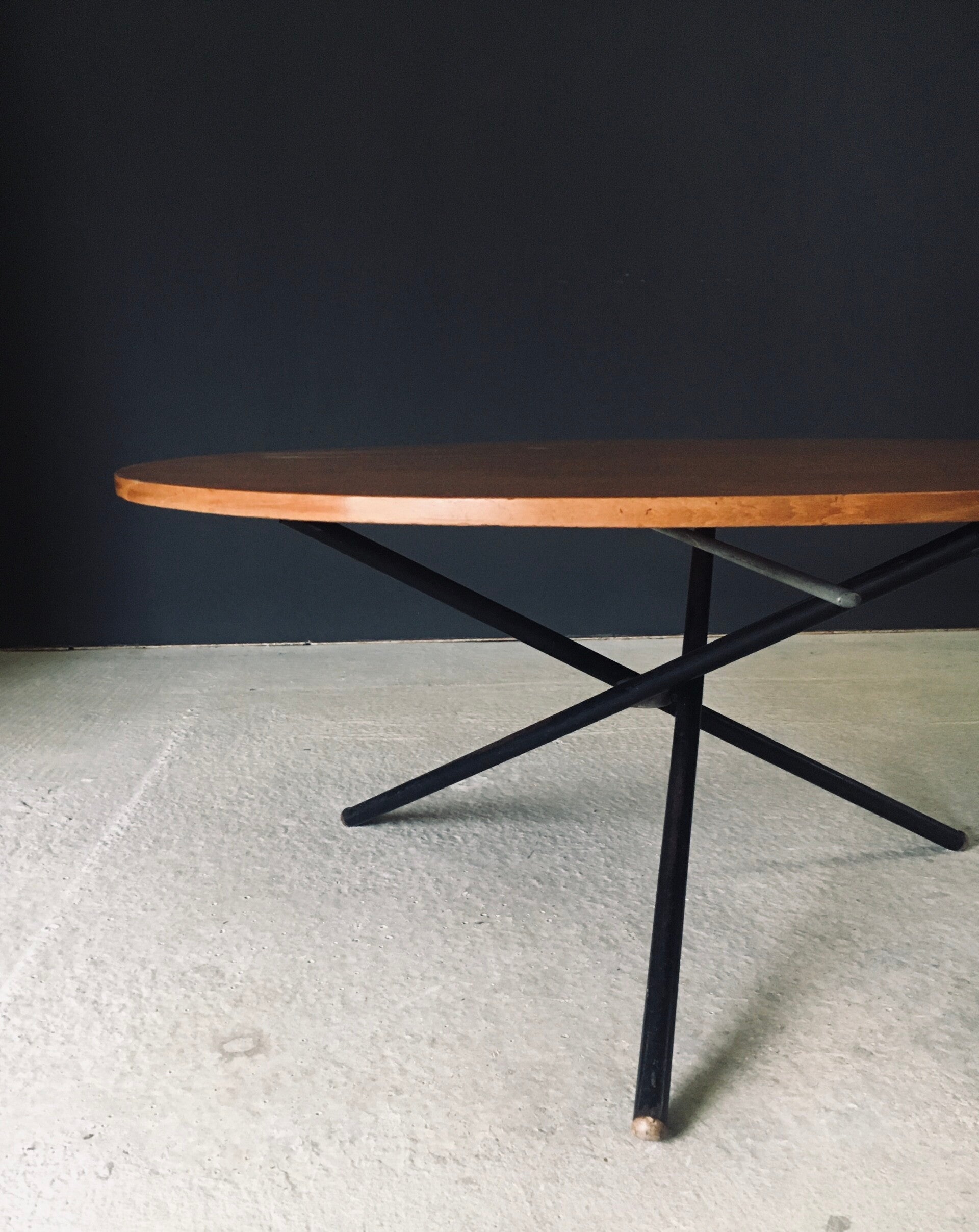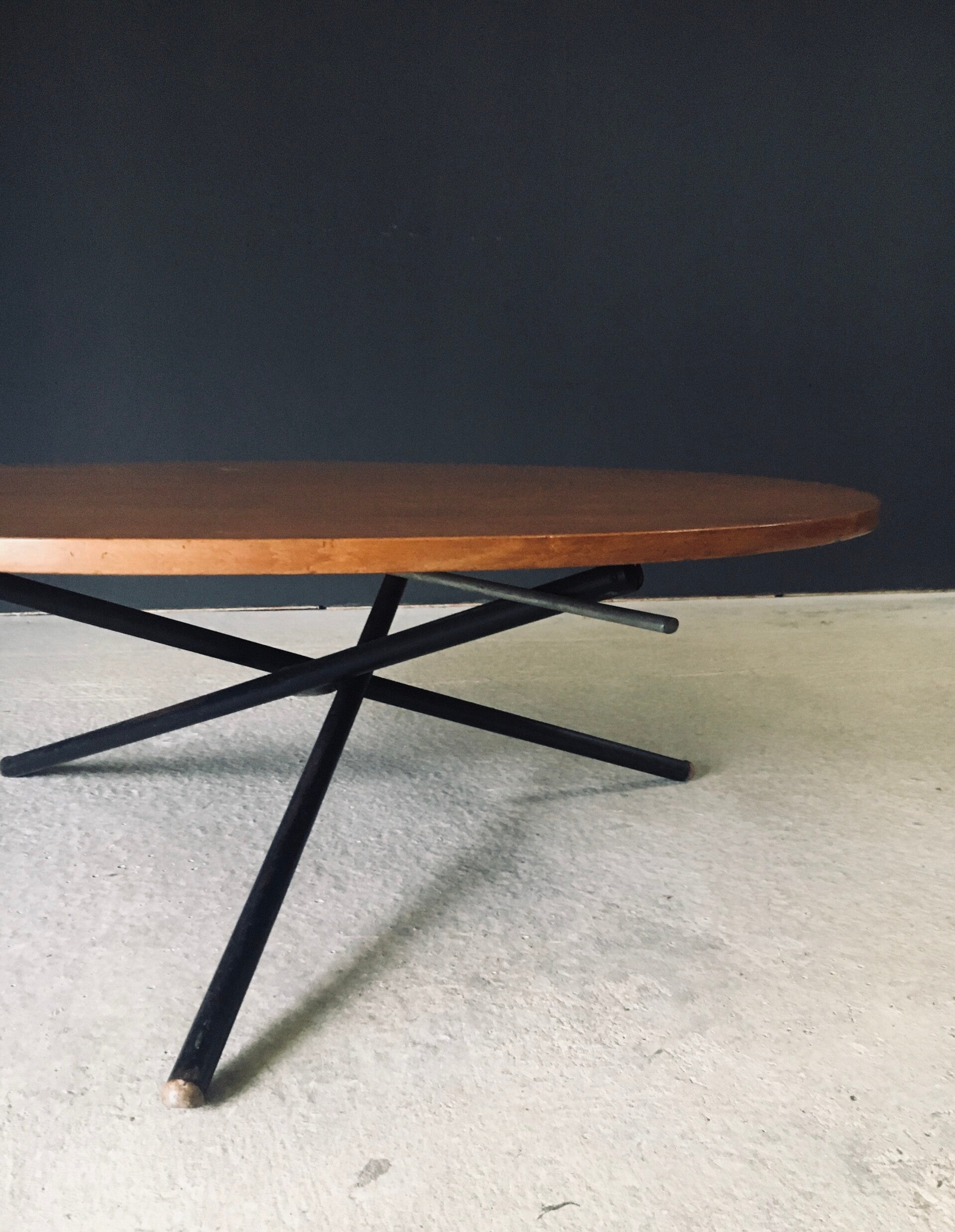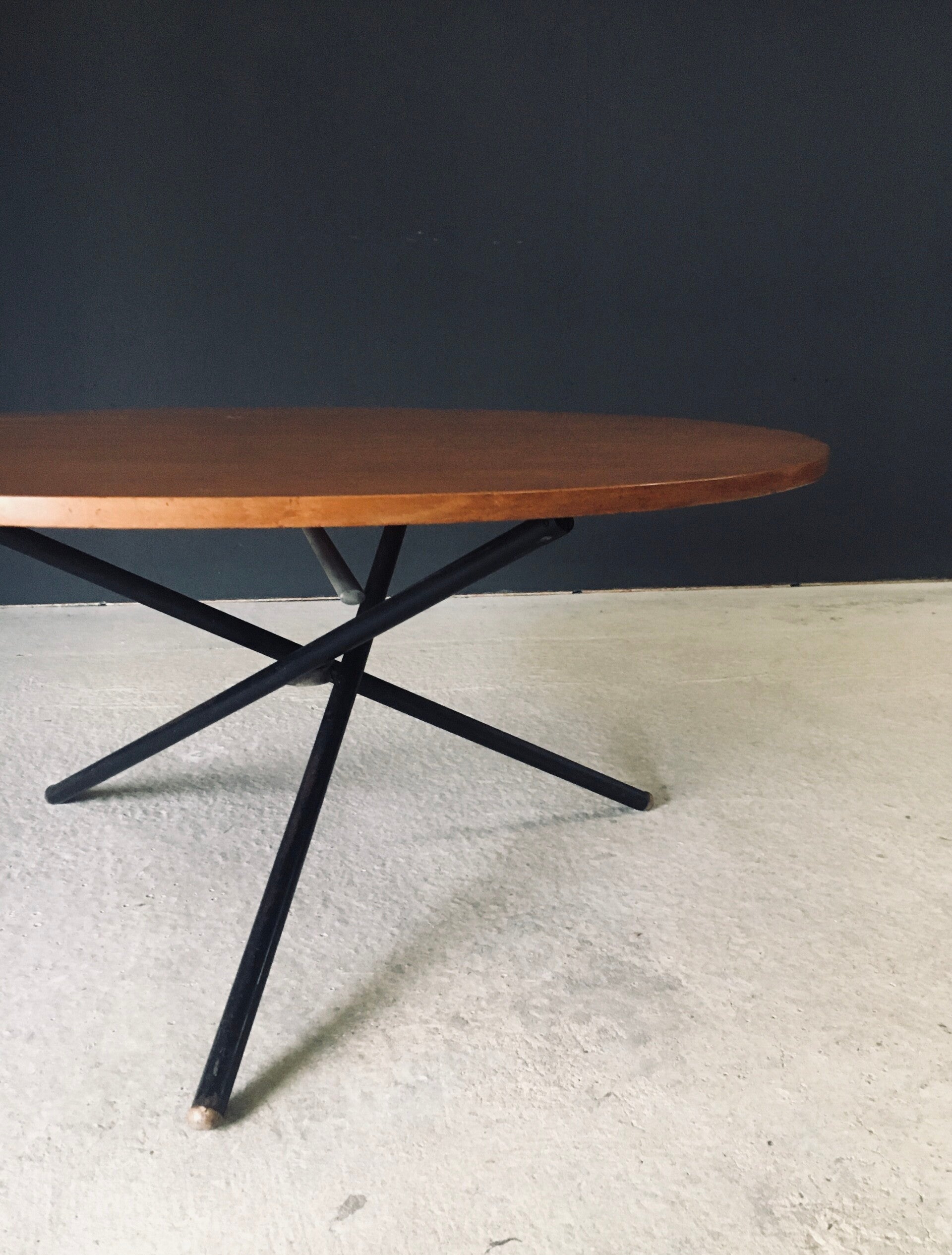 Vintage Midcentury Modern Italian Design very rare and multifunctional table by Jürg Bally for Arform. Made in Italy, 1950's period. The table has it's original label that has a serial number 80. This table with maple veneer table top and black lacquered steel legs topped with wood feet can be elevated to different heights. As a dining table, low centre table or coffee table. This comes in good, all original condition. Has normal signs of wear from it's age and use. The mechanism still works and holds the table in place at the different heights. This table measures as dining table: 76cm x 115cm x 115cm - as centre table: 54cm high and as coffee table 47cm high.