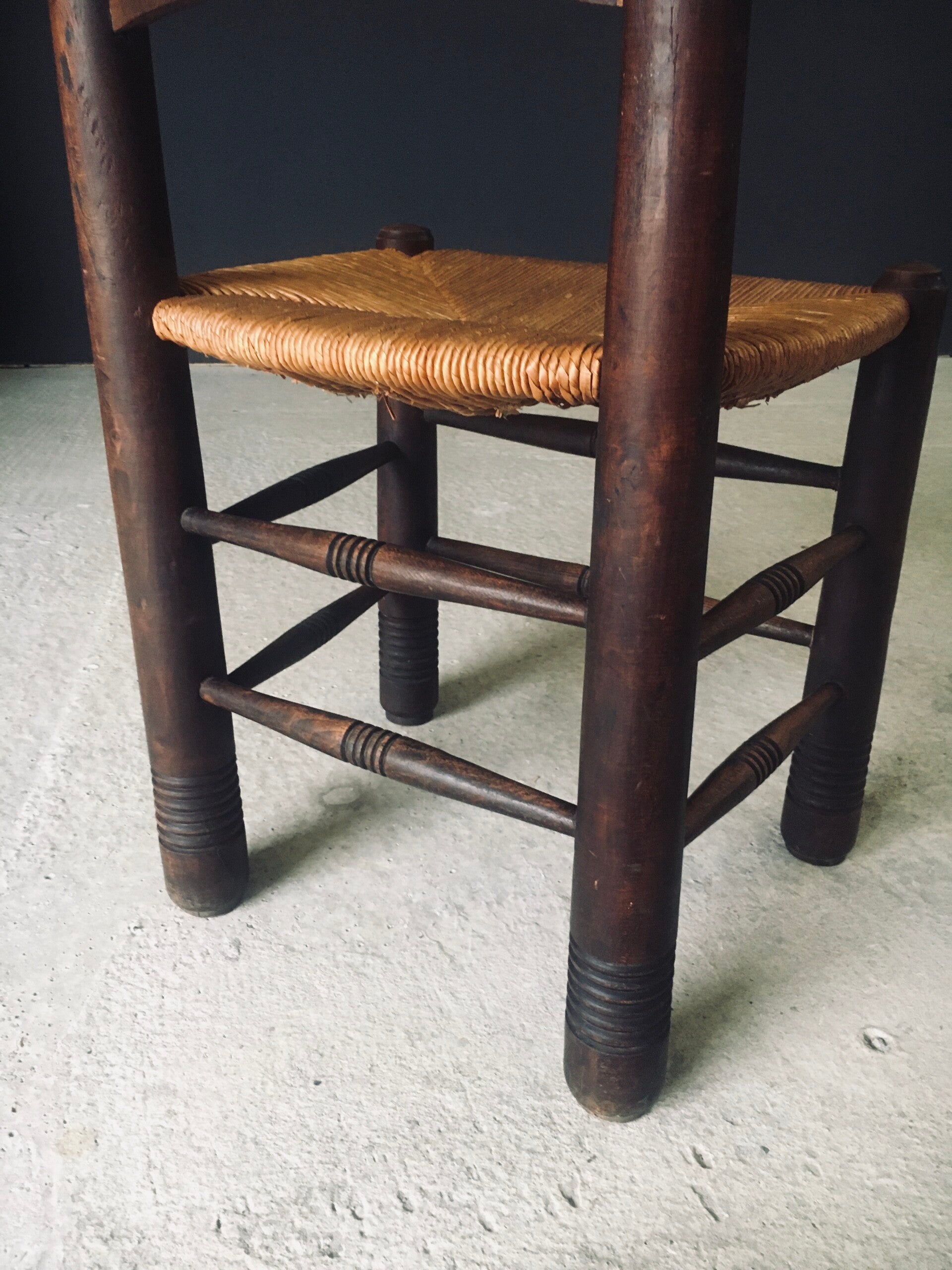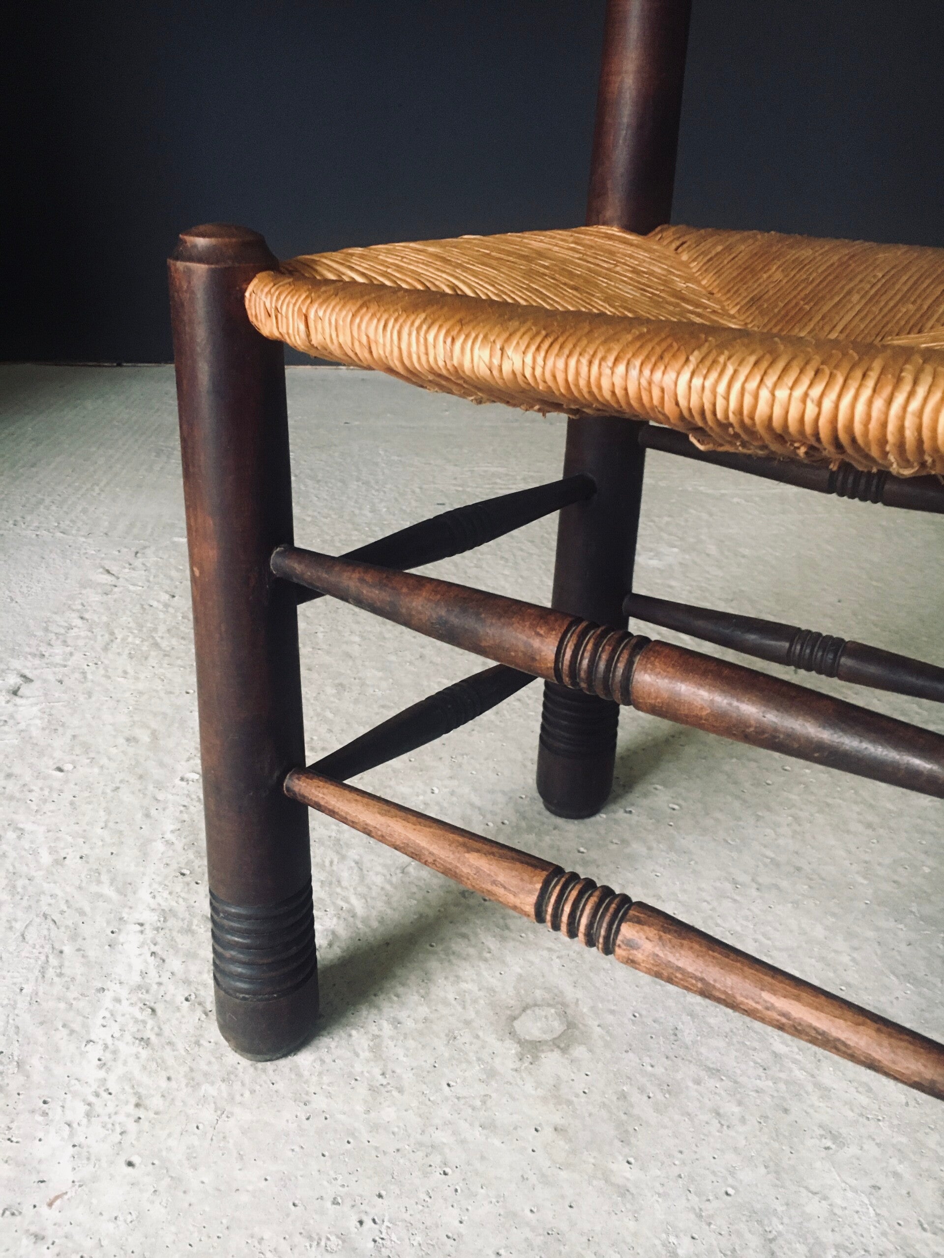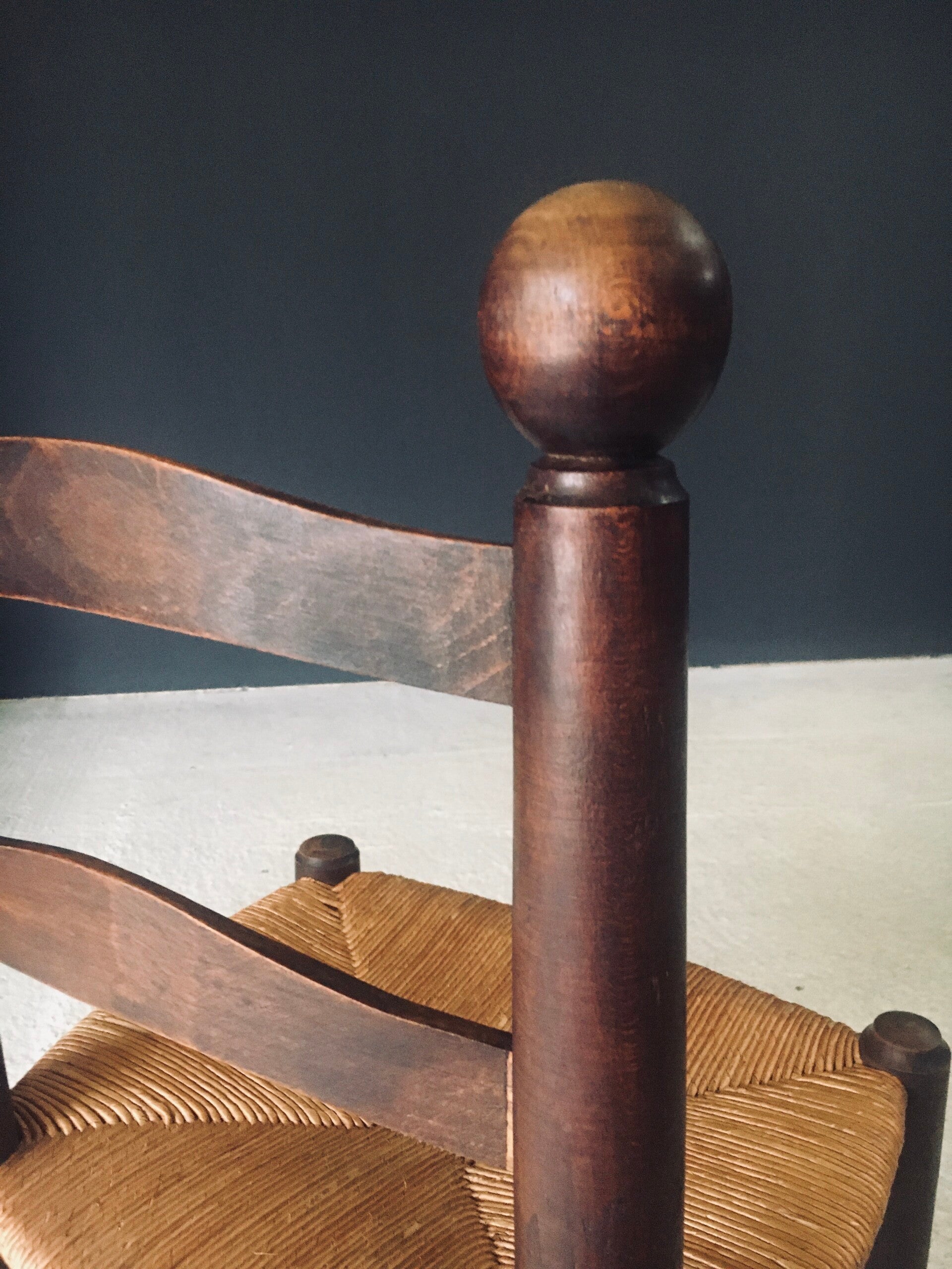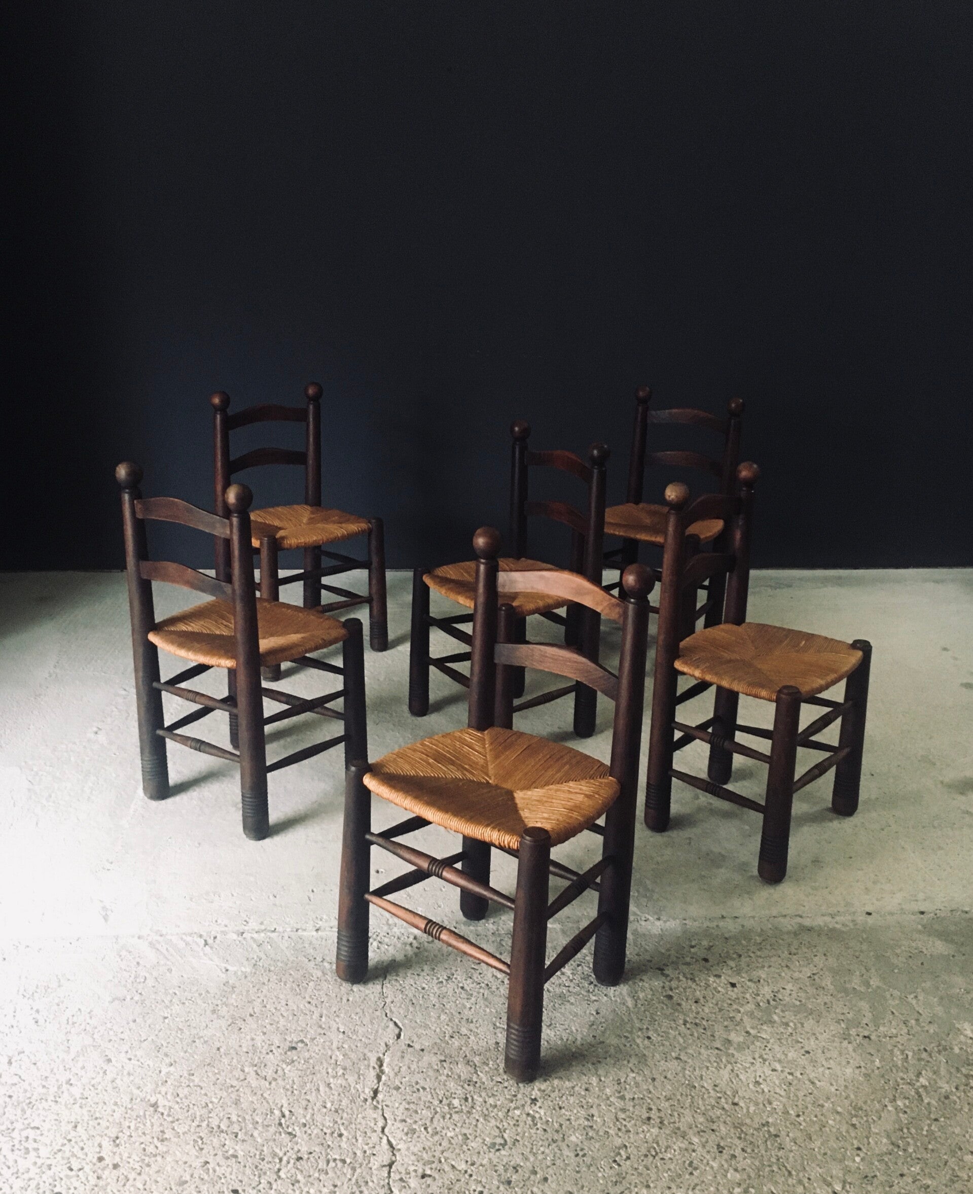 Vintage Midcentury French Provincial Design Dining Chair set of 6 by Charles Dudouyt. Made in France, 1940's / 50's period. Oak with rush seating. Typical Dudouyt design on these chairs with tapered legs, ball on the back, the carved lines on the leg bases. These come in very good, all original condition. All have normal signs of wear from their age and use. Each chair measures 85cm x 45cm x 43cm. Seat height measures 44cm.
