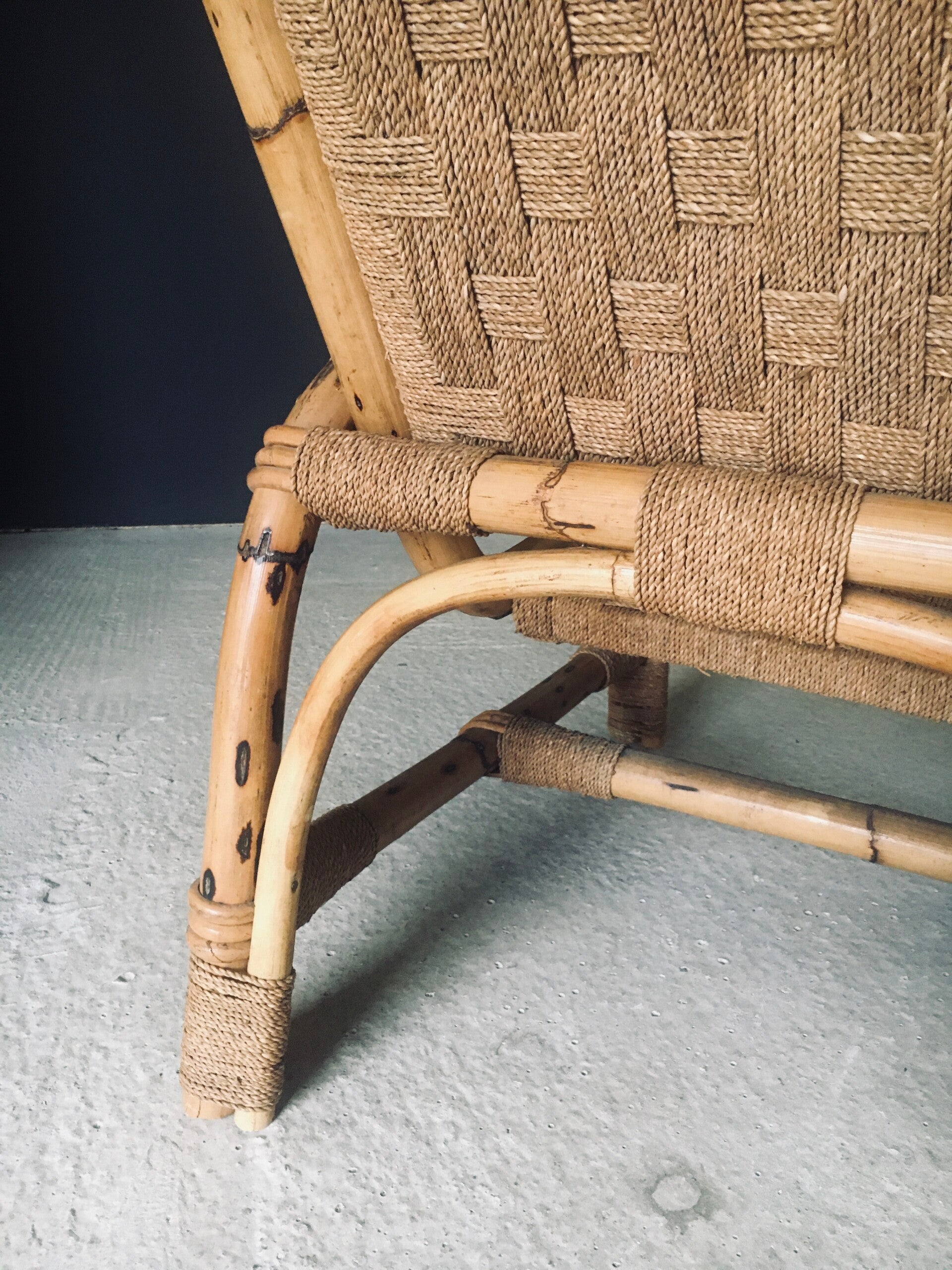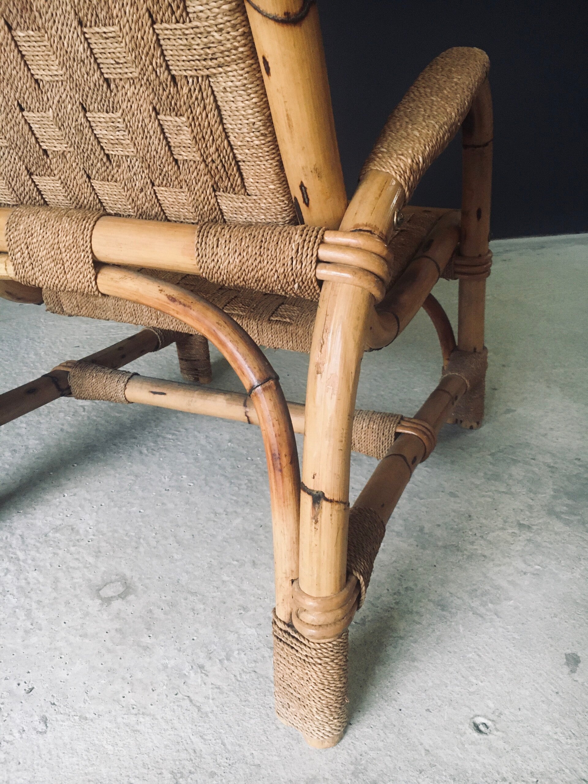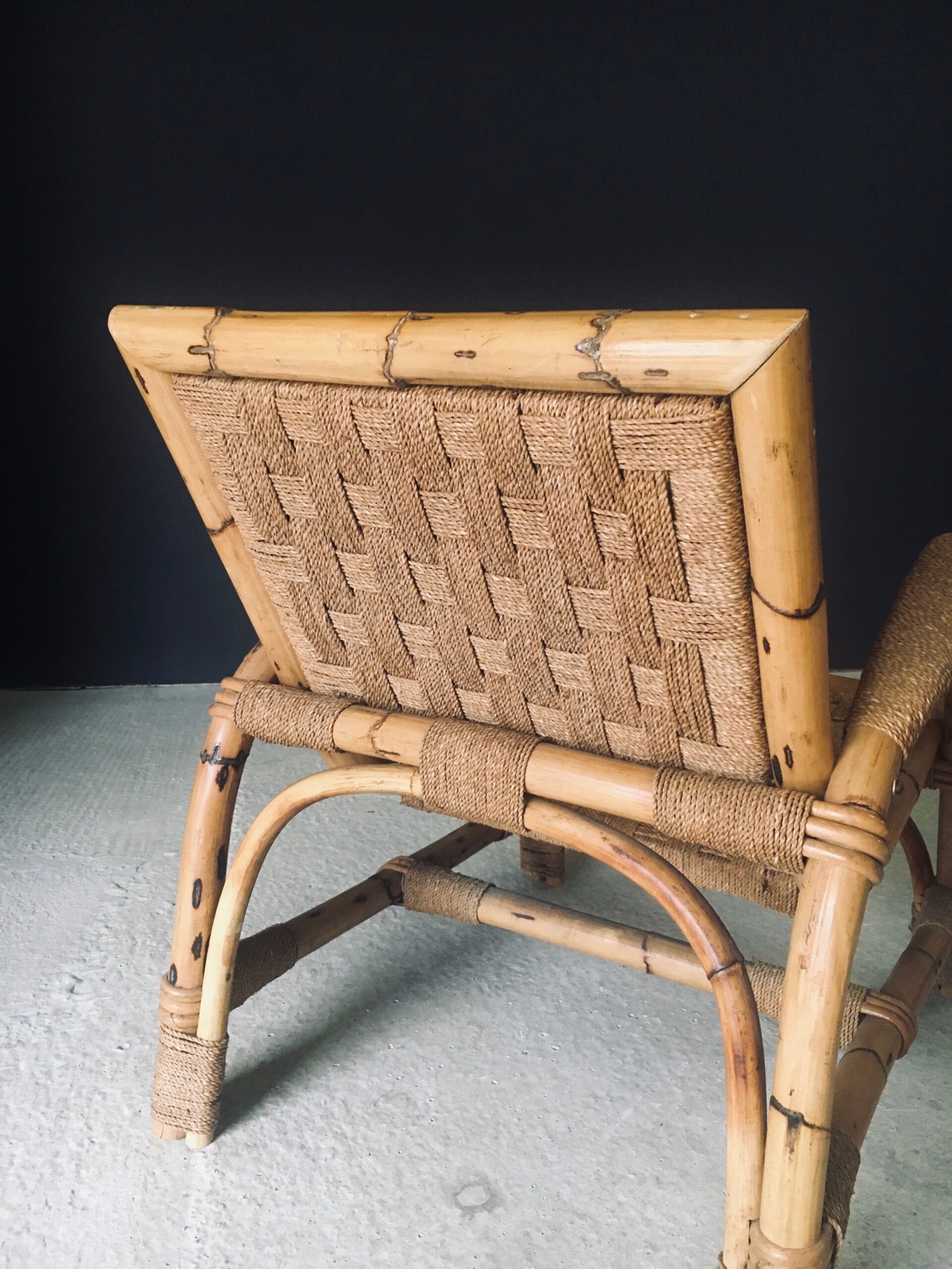 Vintage Midcentury Mediterranean Design Bamboo & Rope Lounge Chair set of 2. Made in France, 1950's period. Bend Bamboo frame with rope seat, backrest and rope bindings. These come in very good, all original condition. Both have normal signs of wear from their age and use. Each measures 83cm x 70cm x 90cm. Seat height measures 41cm.