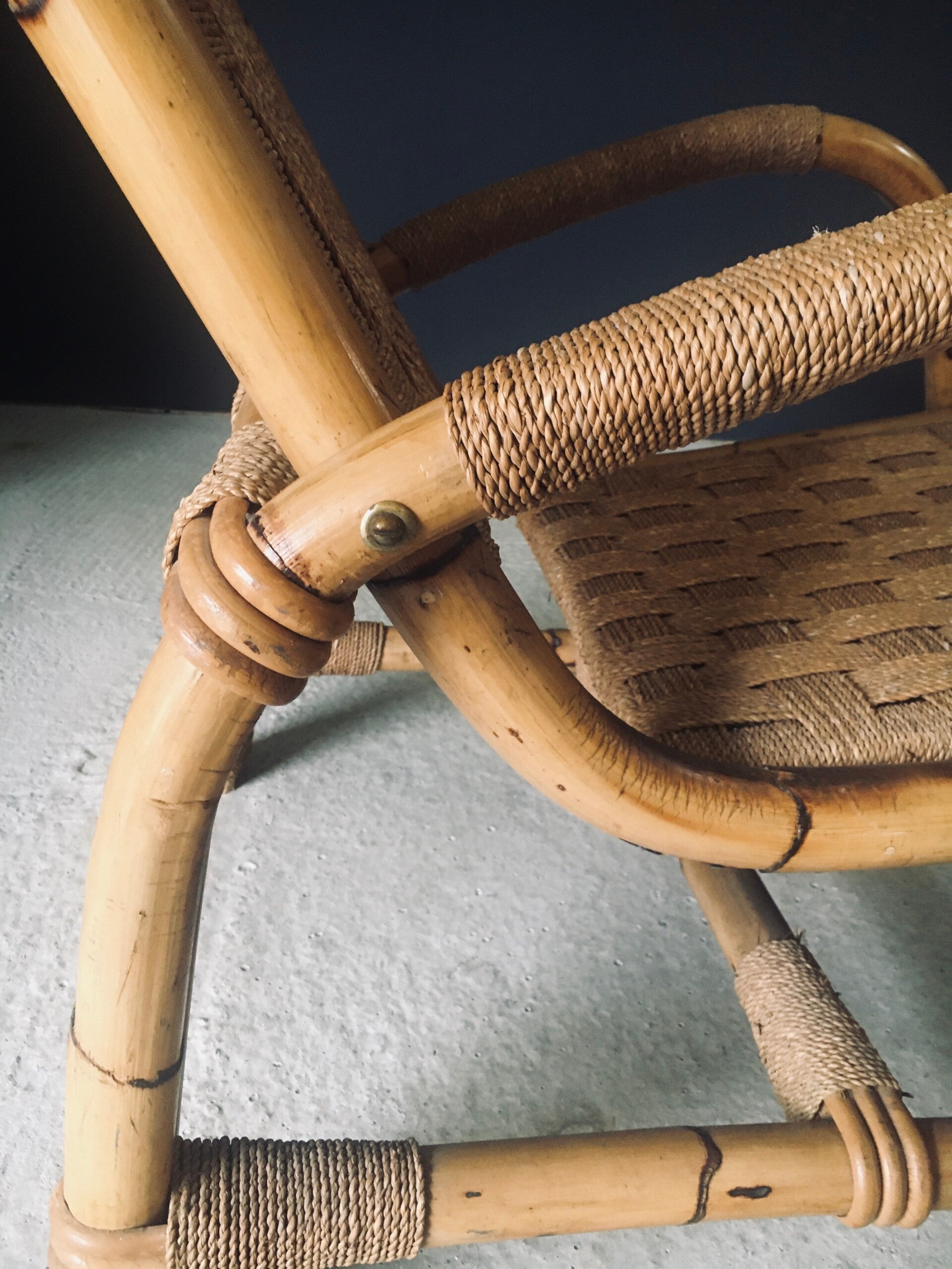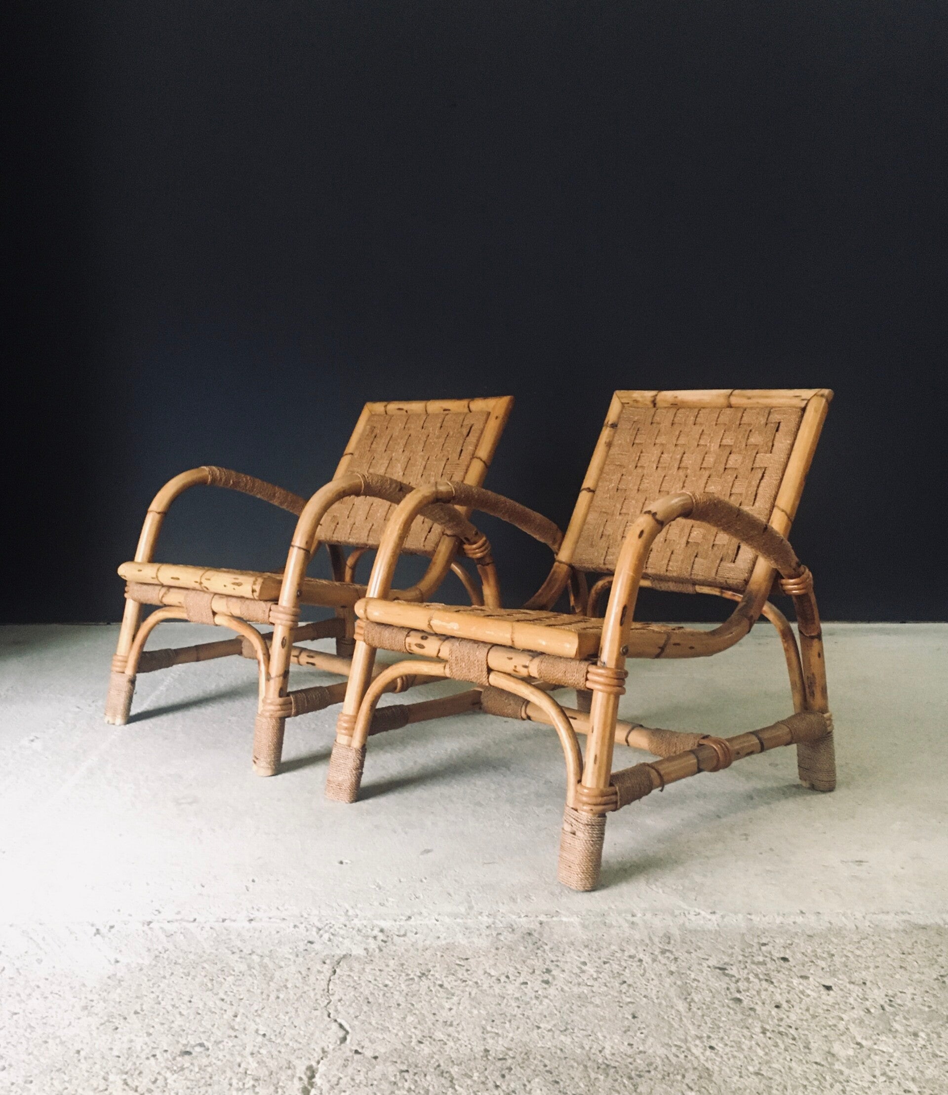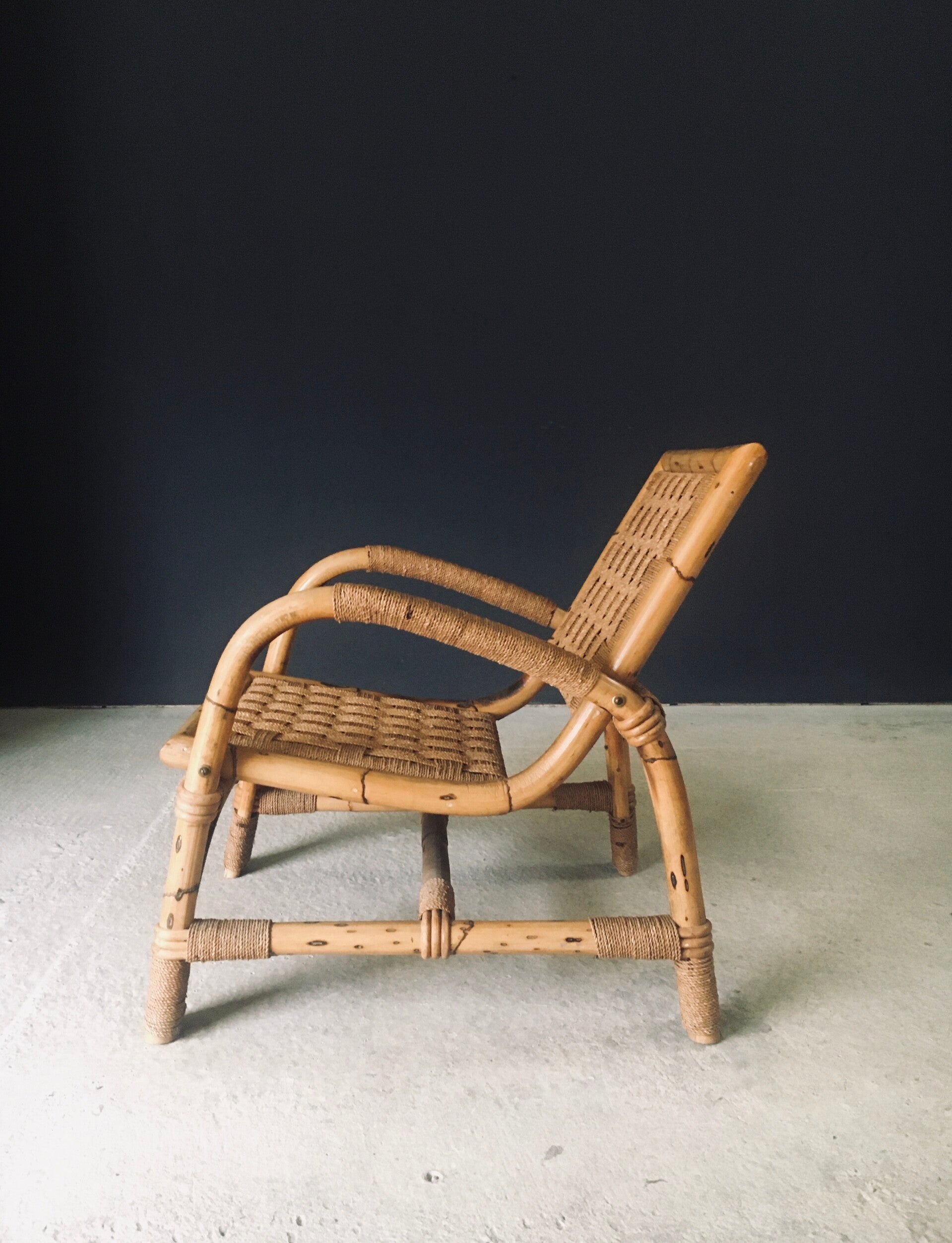 Vintage Midcentury Mediterranean Design Bamboo & Rope Lounge Chair set of 2. Made in France, 1950's period. Bend Bamboo frame with rope seat, backrest and rope bindings. These come in very good, all original condition. Both have normal signs of wear from their age and use. Each measures 83cm x 70cm x 90cm. Seat height measures 41cm.
