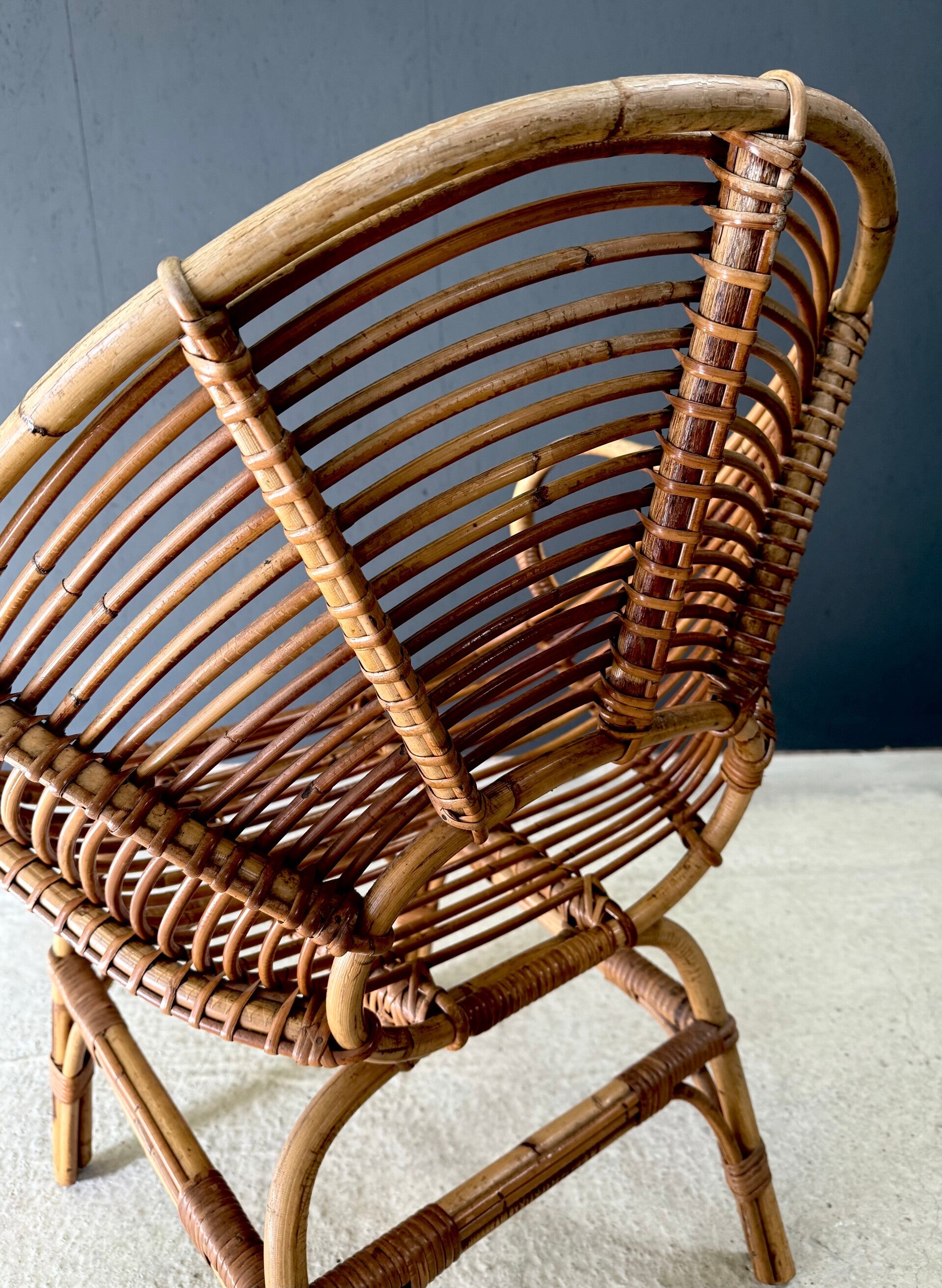 Midcentury Italian Design Bamboo Pod Arm Chair. Made in Italy, 1960's period. Solid bend bamboo constructed armchair, with nice open feel due to the vide in the seating. This comes in very good, all original condition, with normal signs of wear and use from it's age. This measures 86cm x 68cm x 62cm. Seat height measures 44cm.