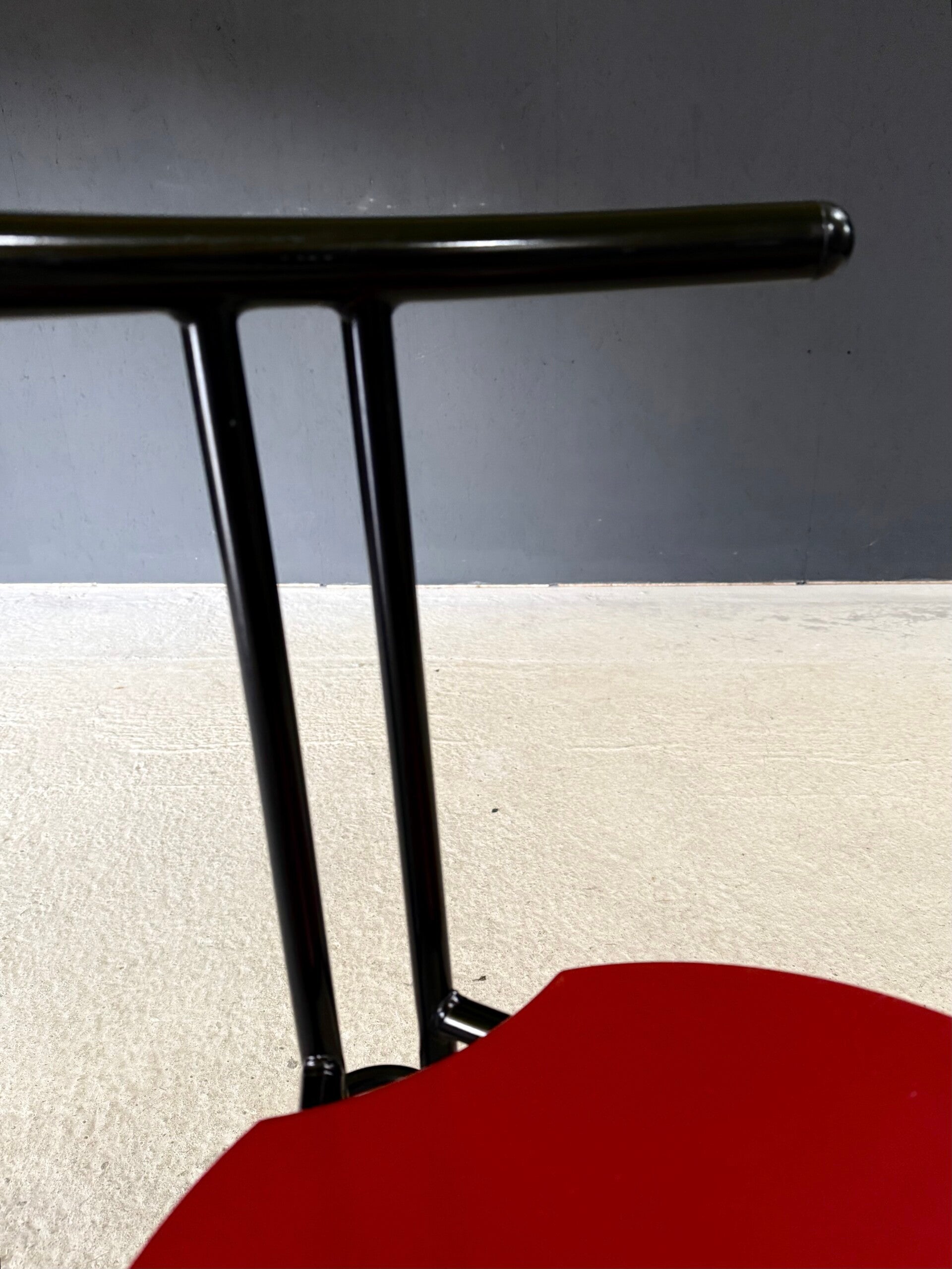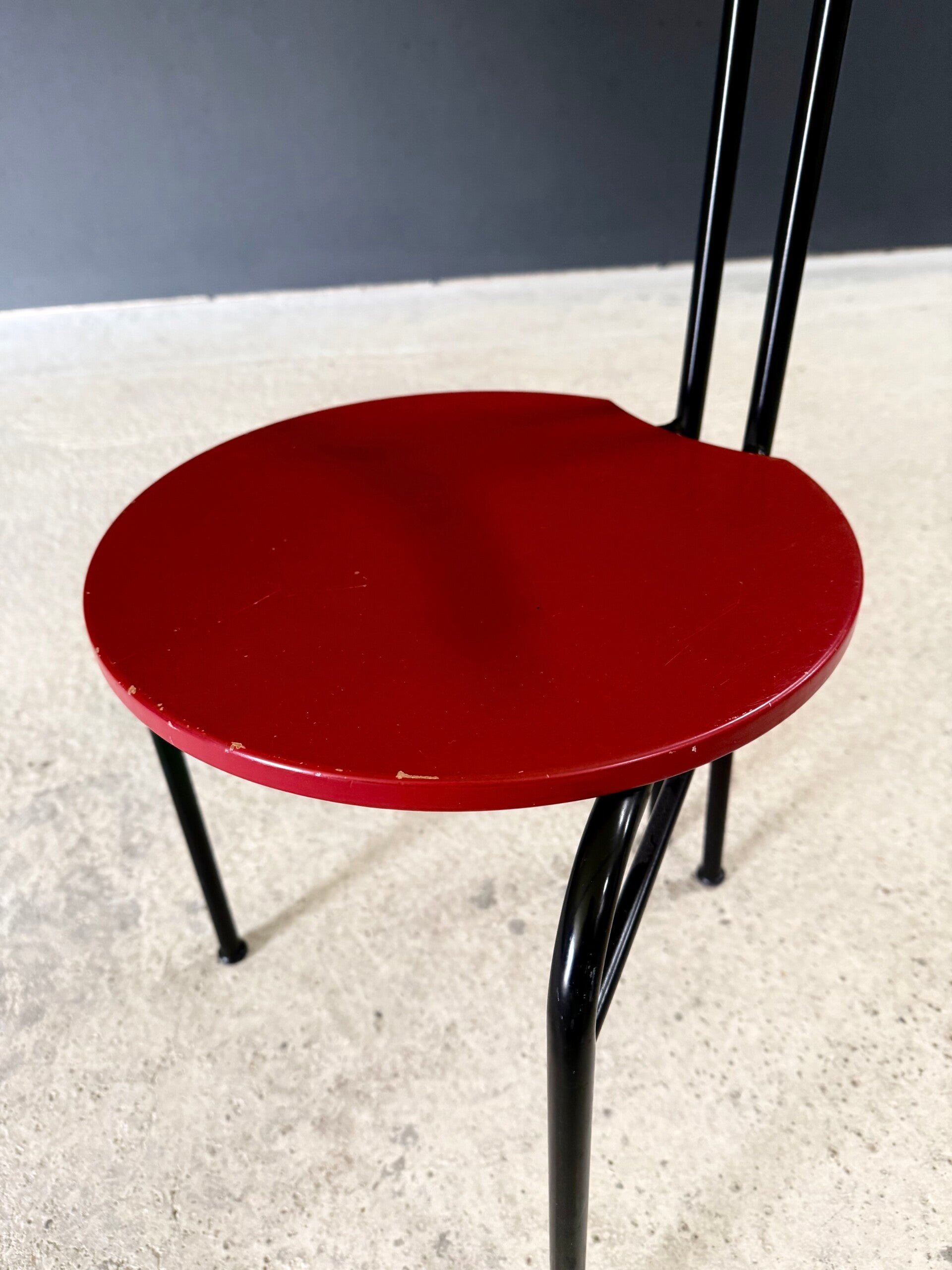 Vintage Postmodern Italian Design Slender Dining Chair set of 4. Made in Italy, 1980's period. Metal tripod constructed chairs with beech red lacquered seat. No maker or model markings. These come in very good and sturdy condition with normal signs of their use and age. Minor scratches and wear to the metal and wood. Each chair measures 75cm x 42cm x 47cm. Seat height measures 46cm.