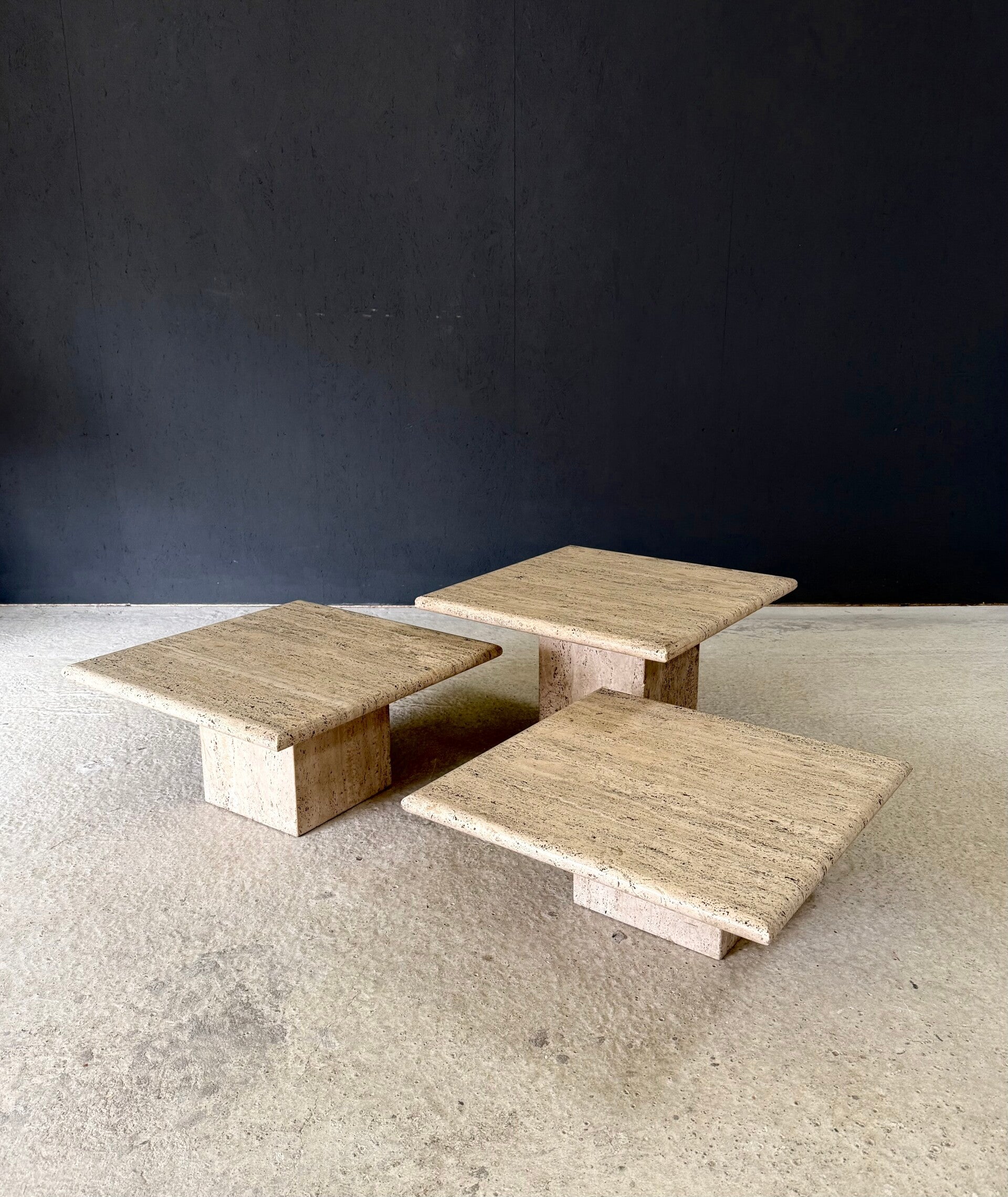 Vintage 1970's Italian Design set of 3 Travertine Nesting Side Tables. Made in Italy in the 1970's. Square with rounded edges on each table. All are in good condition, the largest model has some corner chips (see pictures). Normal signs of wear from their use and age. Sizes: Large: 35cm x 55cm x 55cm - Medium: 28cm x 55cm x 55cm - Small: 21cm x 55cm x 55cm.