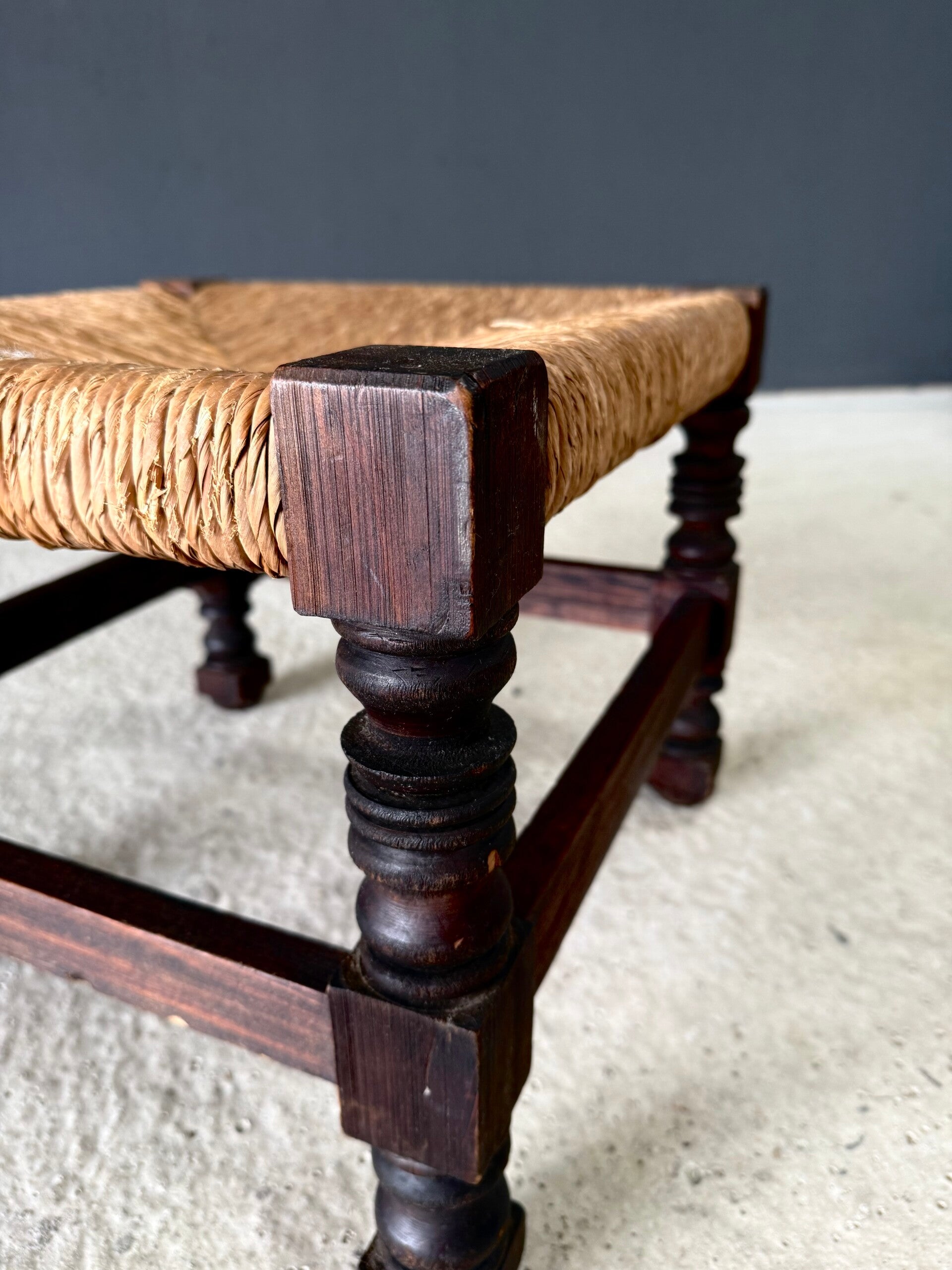 Vintage French Country Design Hand Crafted Oak & Rush Low Stool. Made in France, 1940's - 50's period. Solid oak constructed frame with turned legs and woven rush seat. This comes in very good, all original condition. Measures 36cm x 45cm x 45cm.