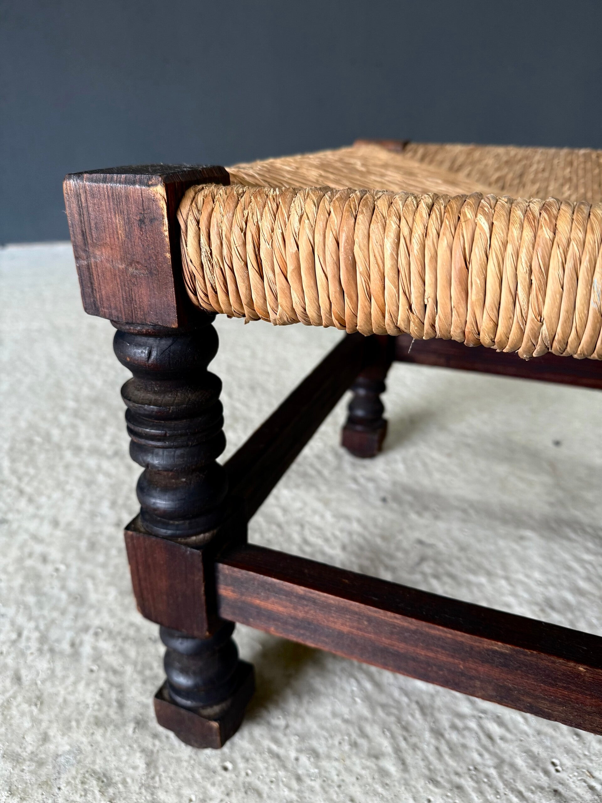 French Country Oak & Rush Low Stool, France 1940's