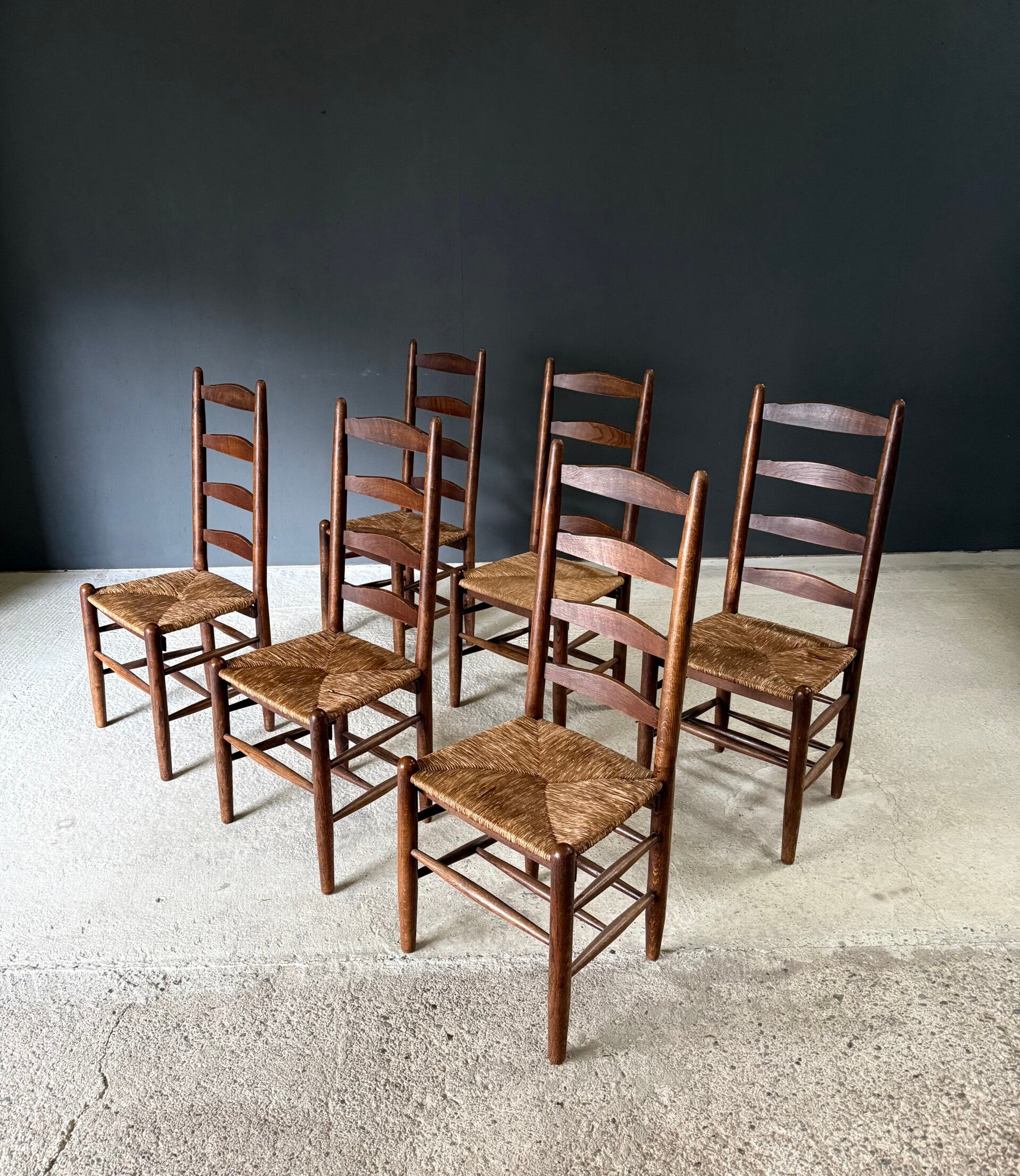 Vintage Rustic Design High Ladder Back Oak & Rush Dining Chair set of 6. Made in Belgium, 1950's period. Solid oak frame with rush woven seats. This is the high back model, we also have a lower back model in stock. These come in good, well used condition, with clear signs of their use and age. The rush seats are all in good order. One seat has been profesionally replaced some time ago by the previous owner. Each chair measures 108cm x 46,5cm x 45cm. Seat height measures 45cm.
