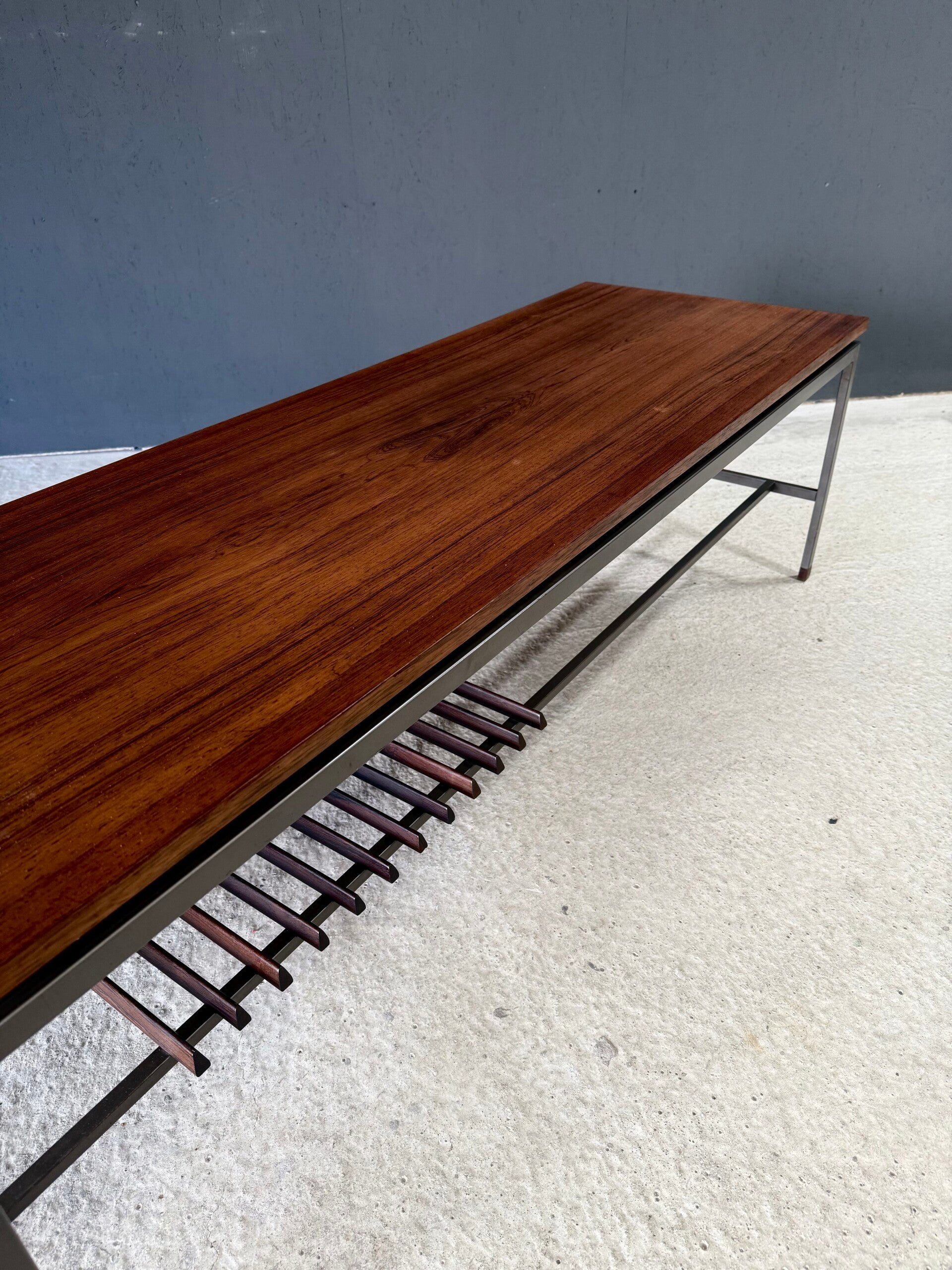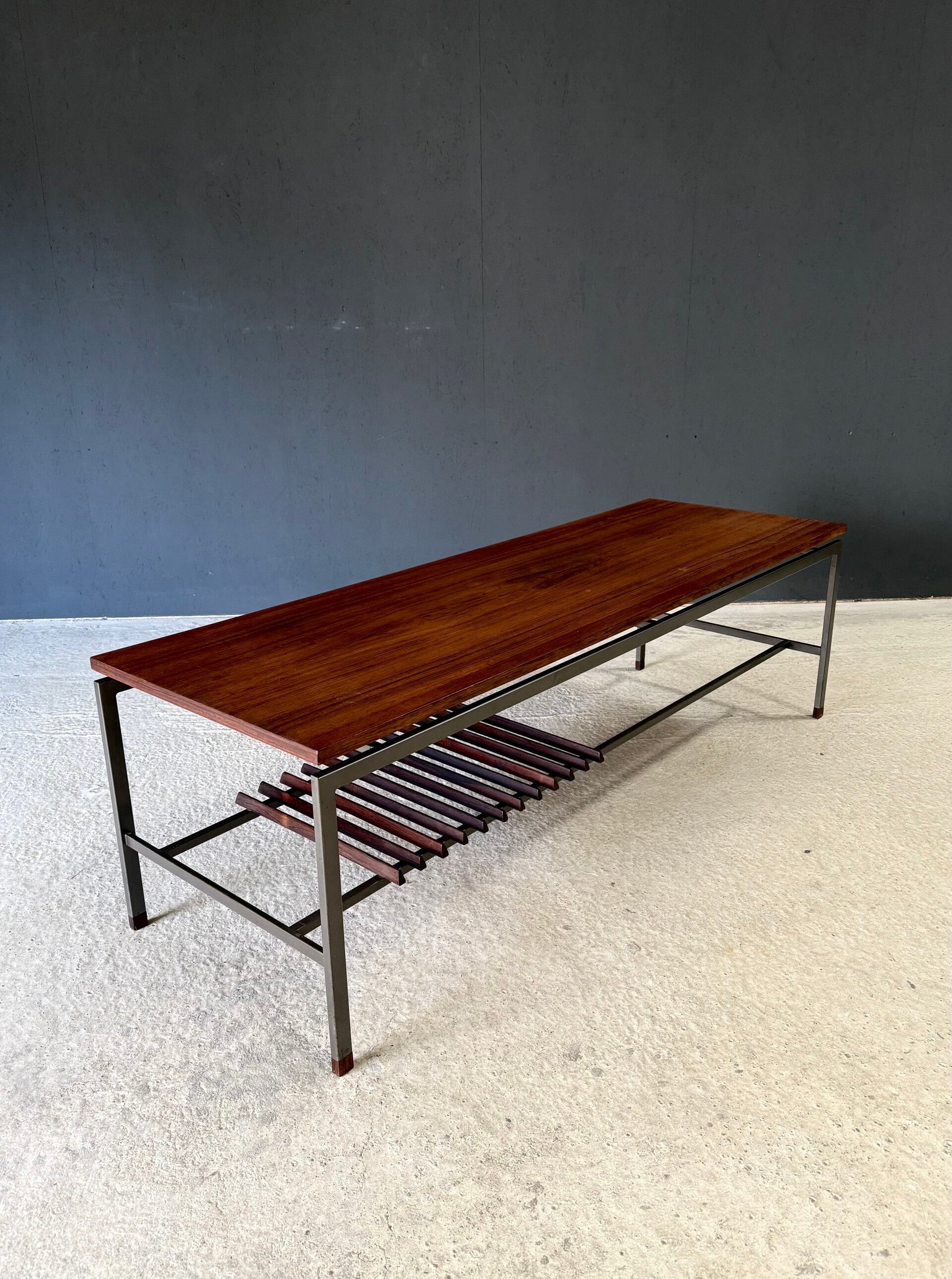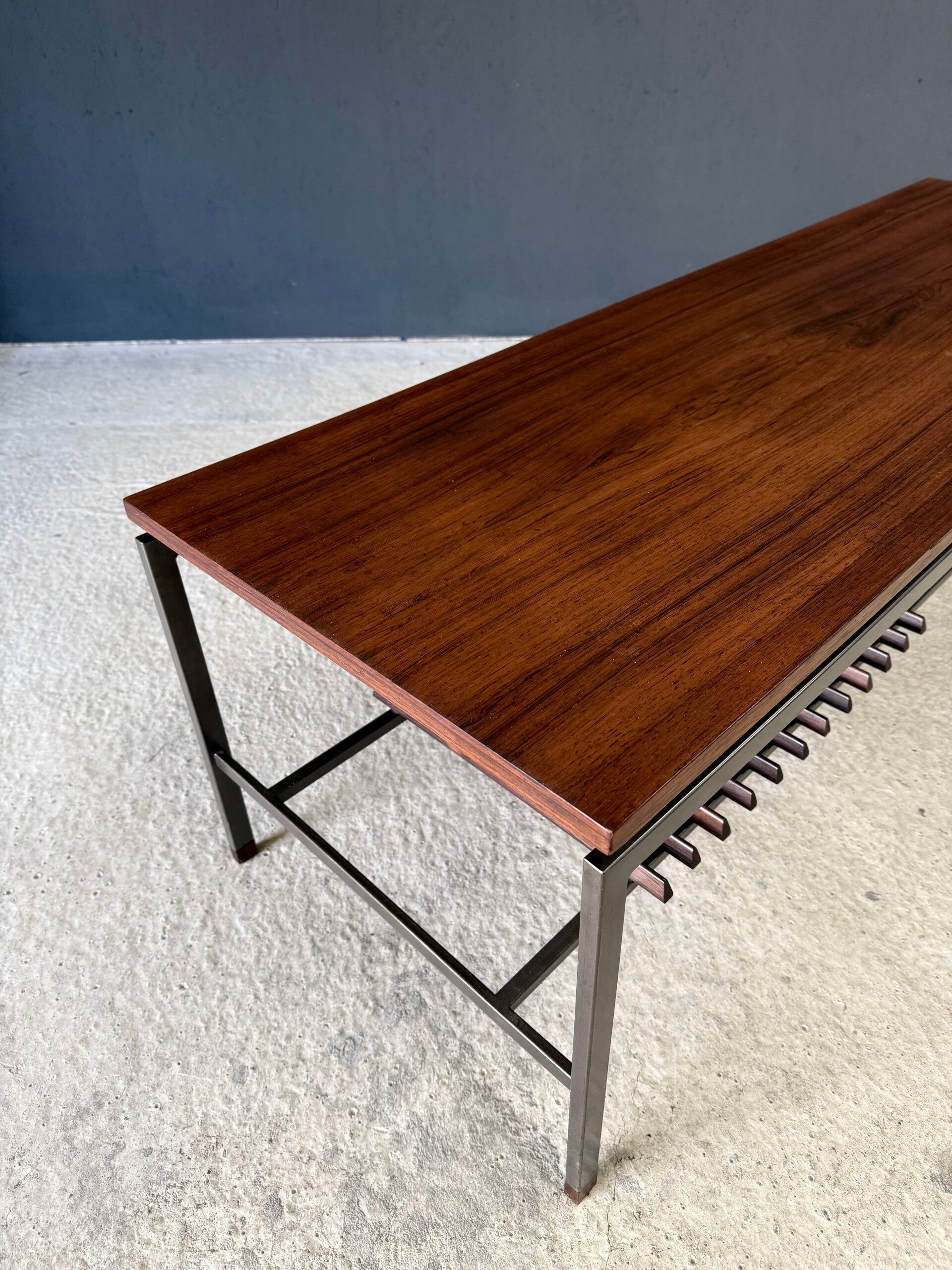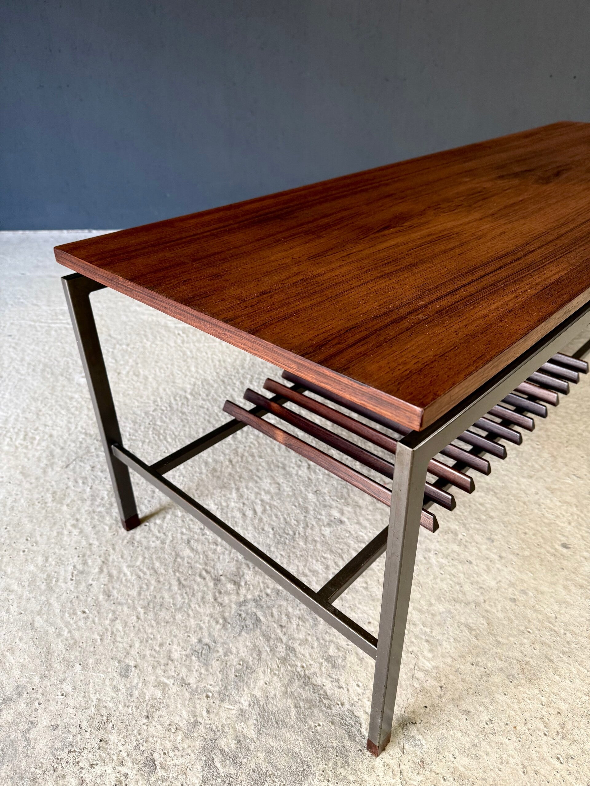 Vintage Midcentury Modern Dutch Design Slender Coffee Table by Topform. Made in the Netherlands in the 1960's. Labeled underneath. Teak veneer top on grey square metal base with wenge wood slats and feet. This comes in very good, all original condition. Measures 46cm x 150cm x 50cm.