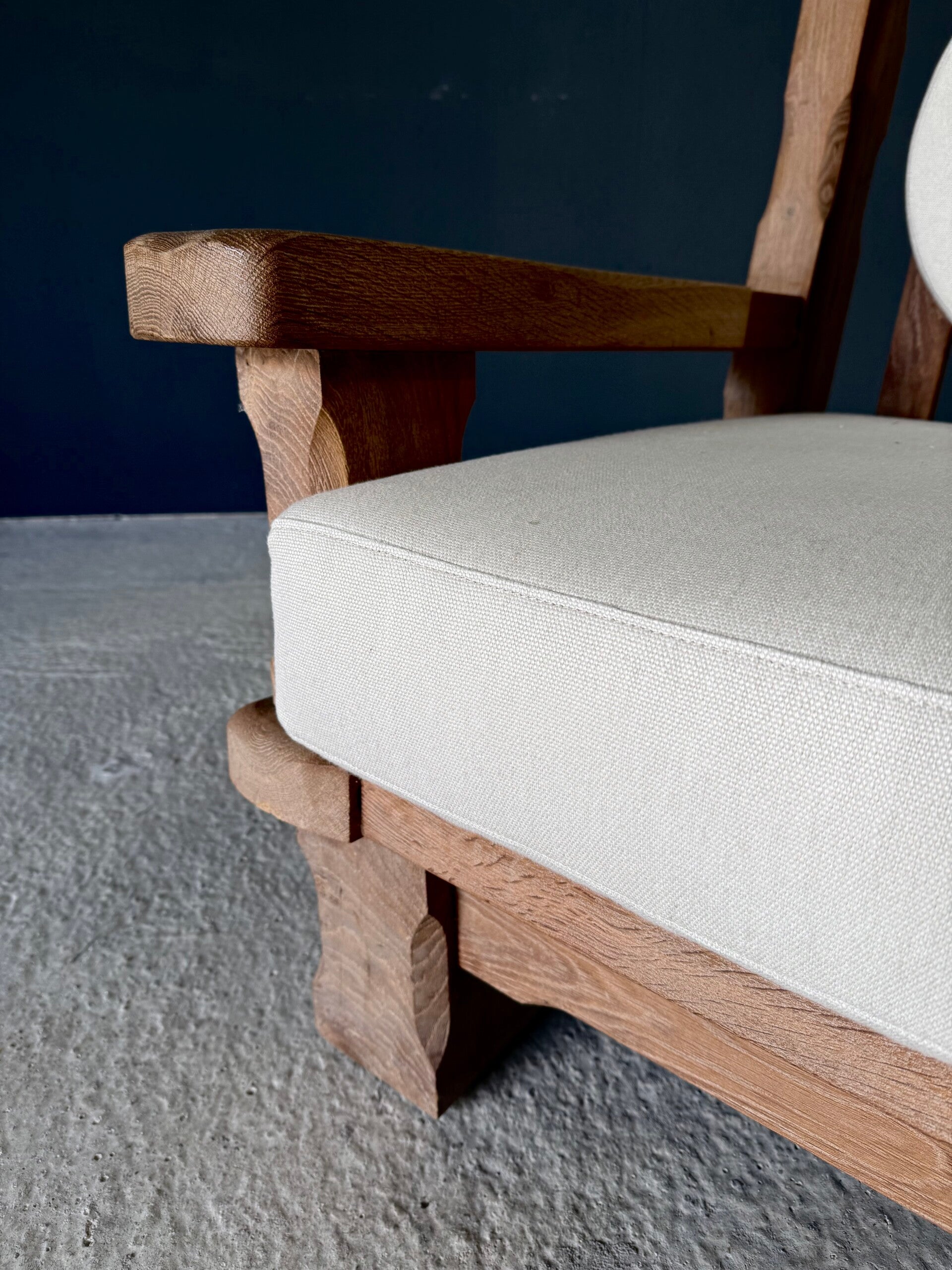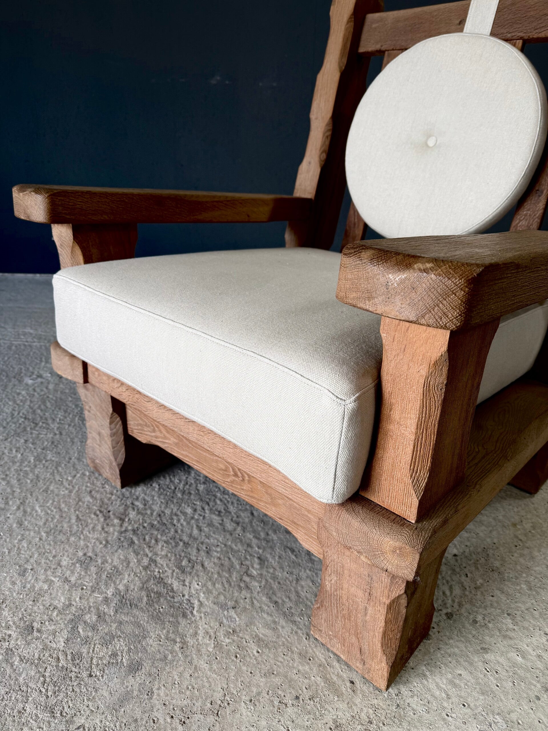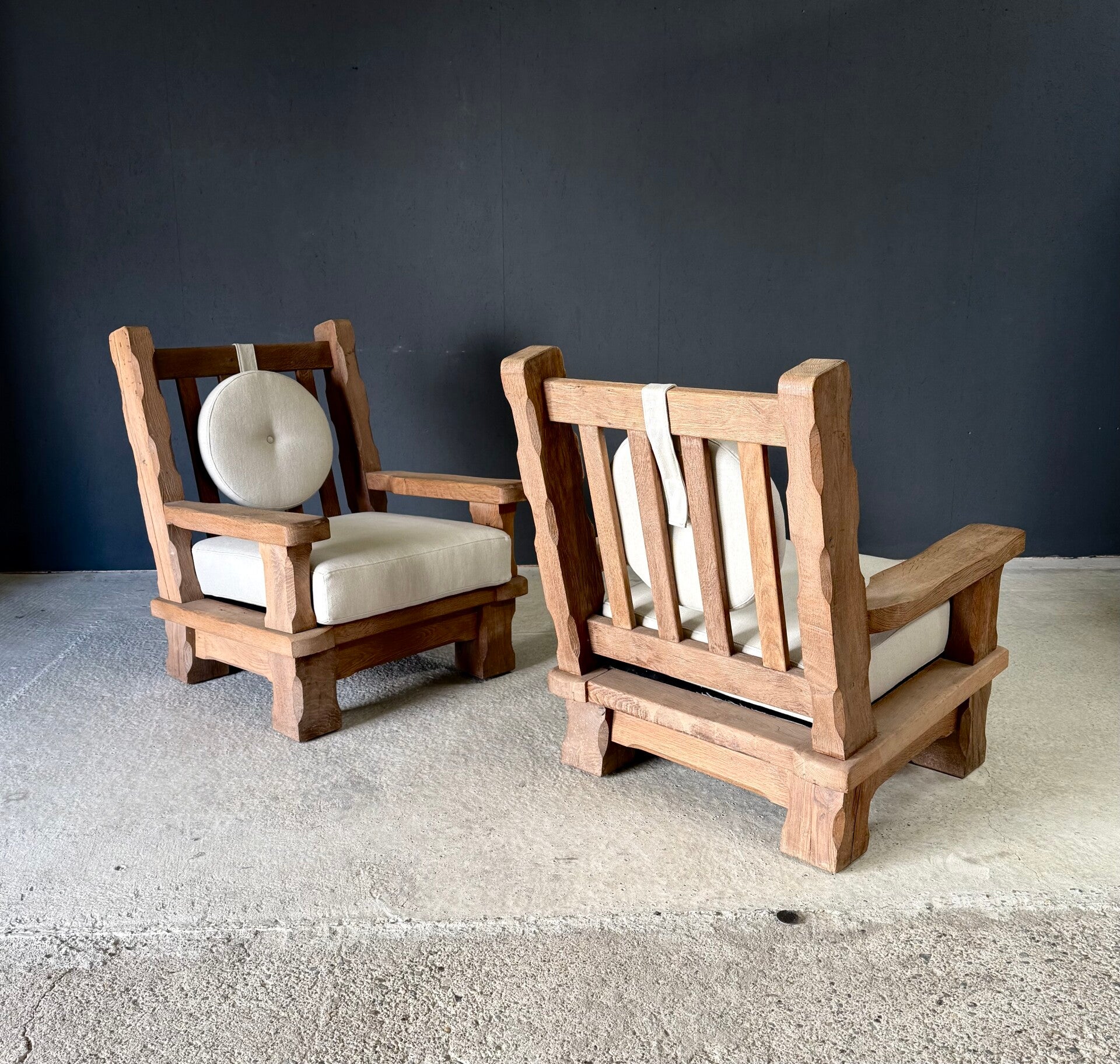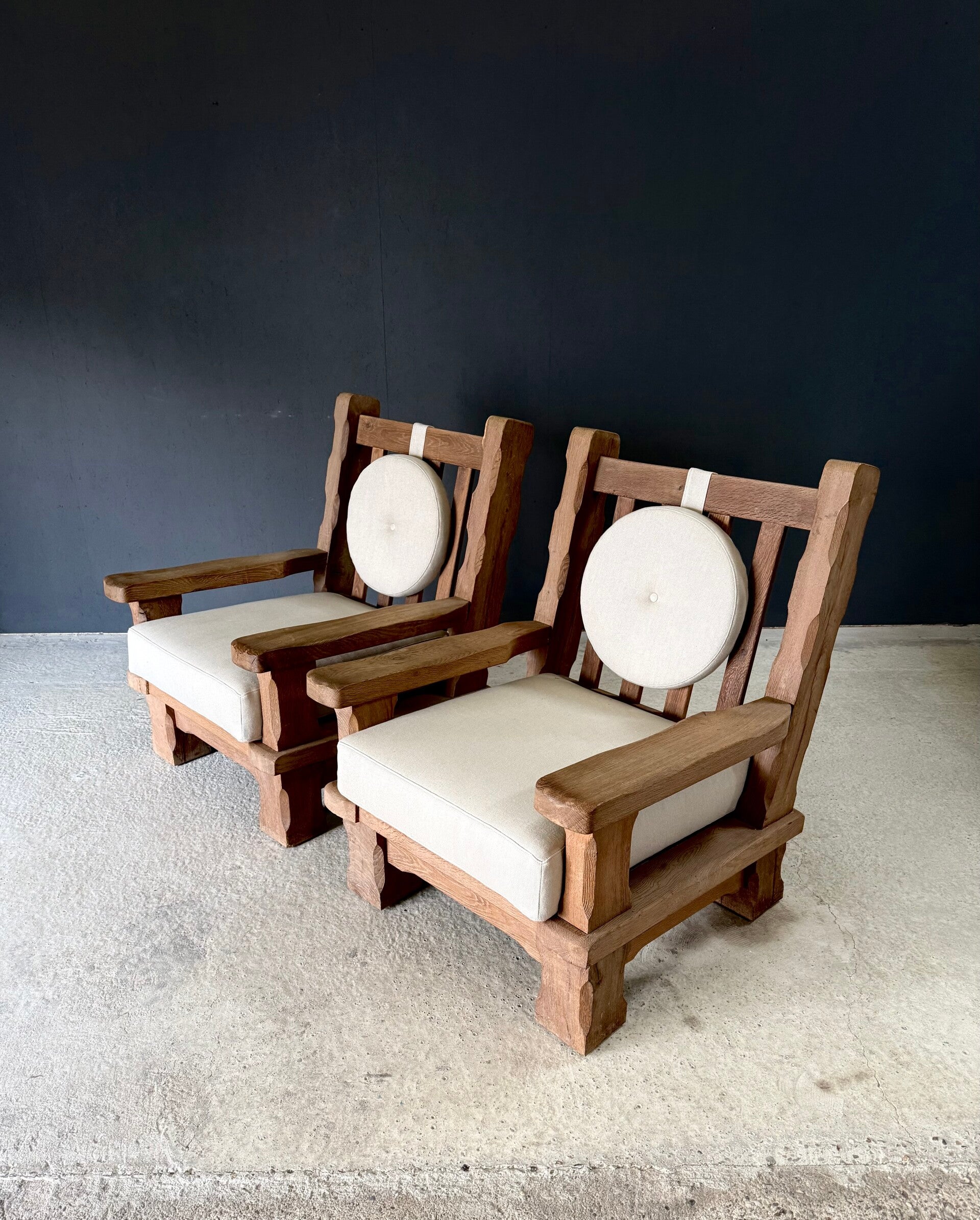 Vintage Brutalist Belgian Design XL Oak Lounge Chair set of 2. Made in Belgium, 1960's period. Solid heavy oak constructed armchair set with newly made reupholstered cushions. Carved chunky thick light colored oak frame. These come in very good condition. The cushions have been professionally made to measure. Each arm chair measures 100cm x 80cm x 90cm. Seat height measures 45cm.