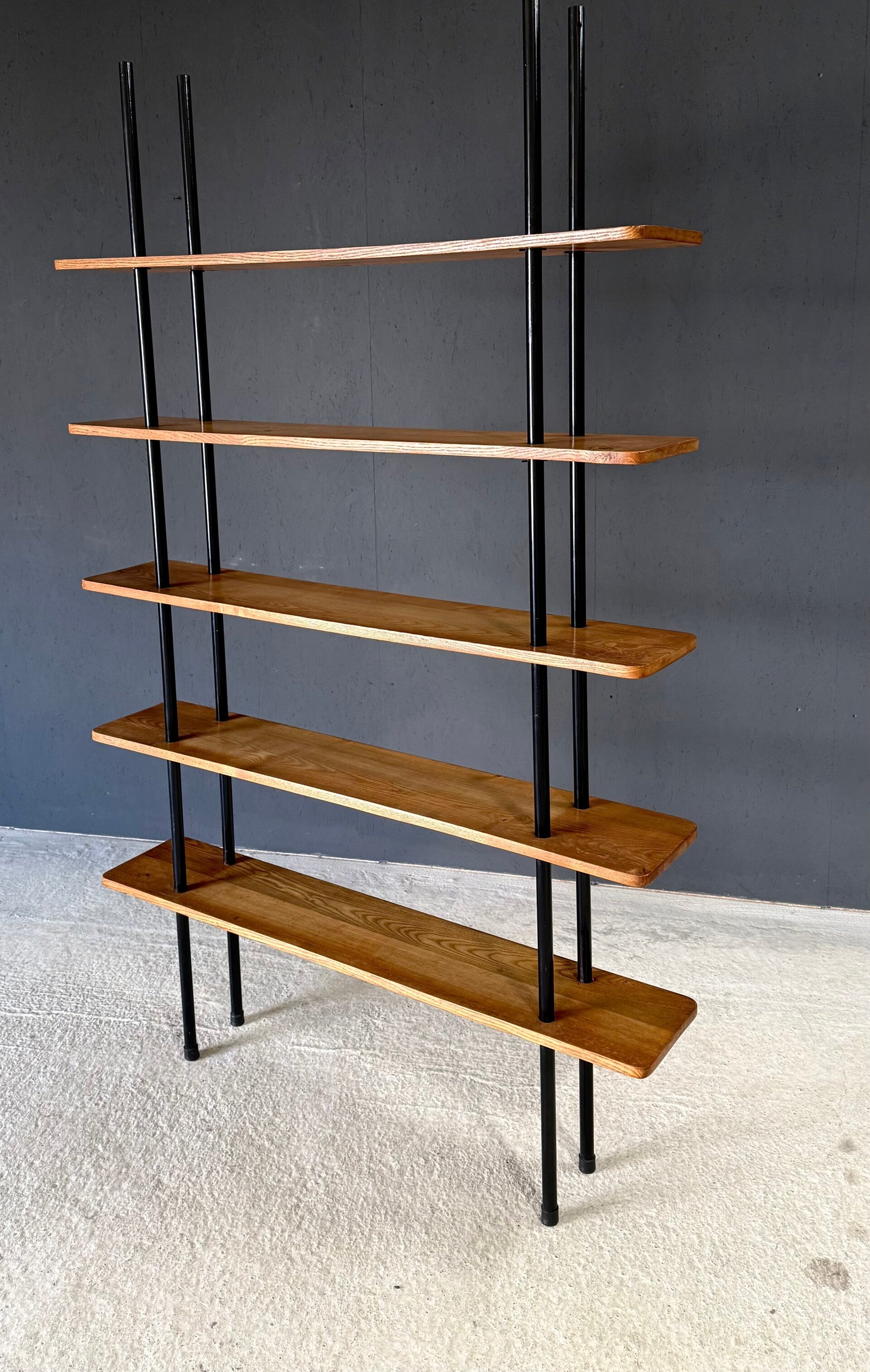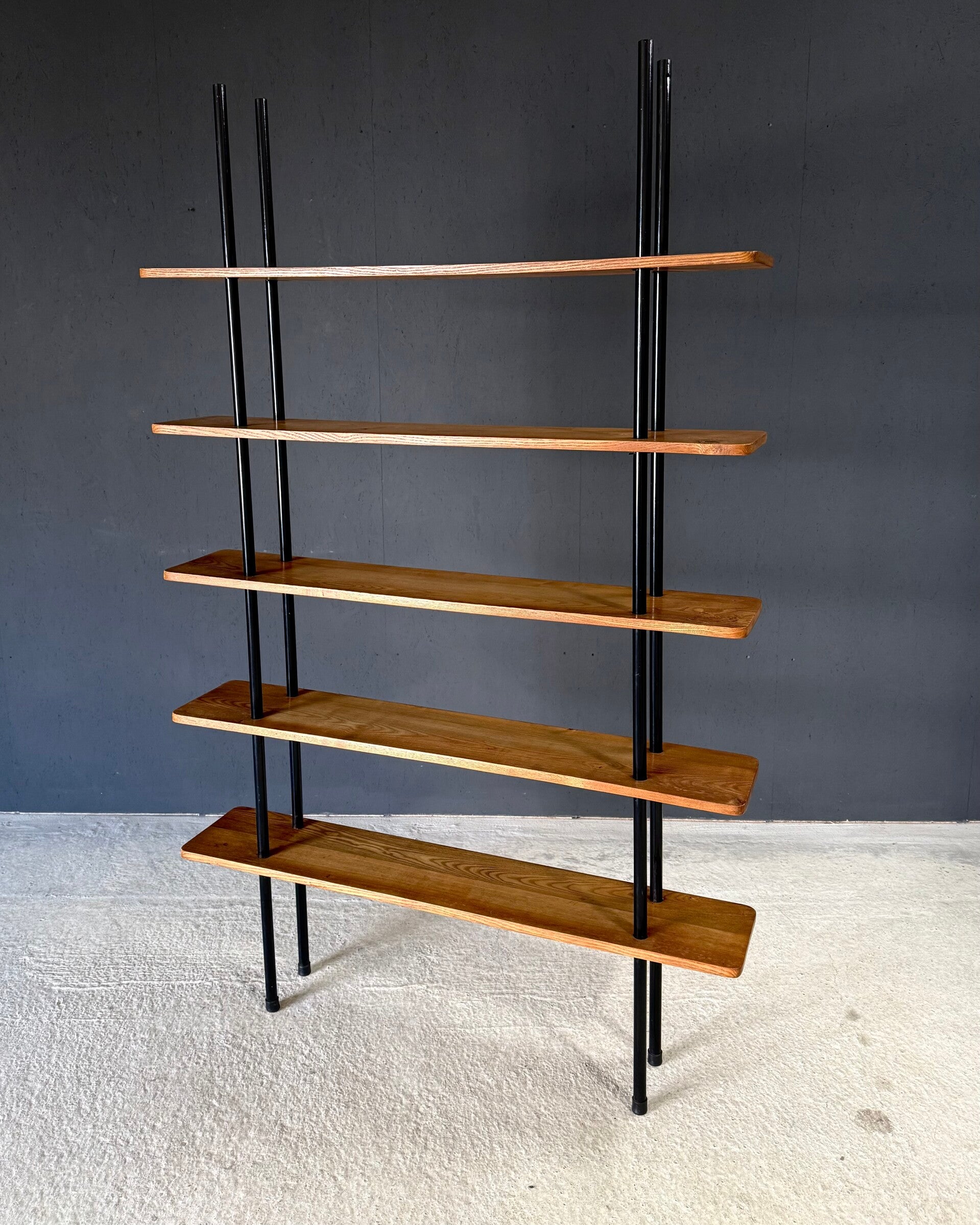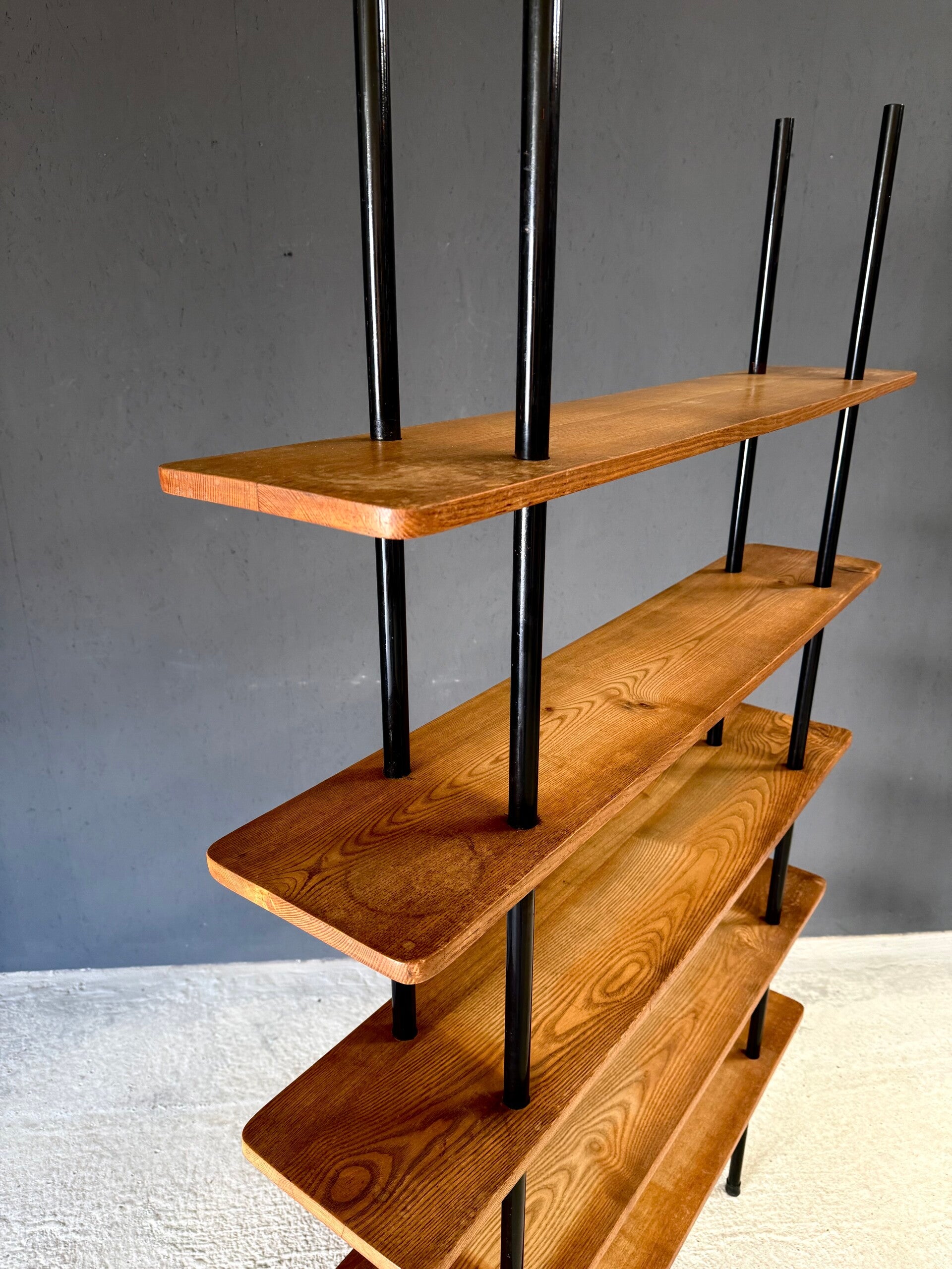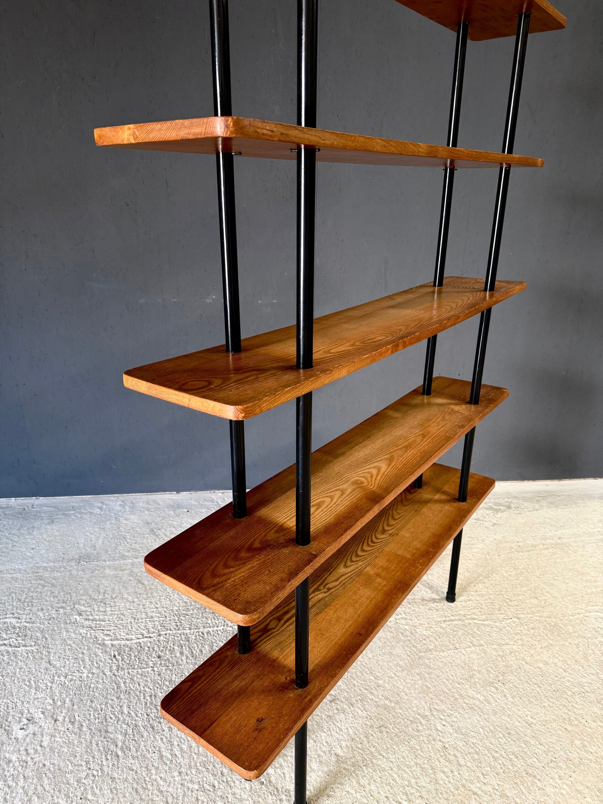 Vintage Midcentury Modern Dutch Design Stick Shelving Unit by Willem Lutjens. Made in the Netherlands, 1960's period. 4 Black lacquered steel rods with 5 solid birch wooden planks merged together in a very minimalistic way. This comes in good, all original condition. Has normal signs of wear from it's past use and age. This measures 201cm x 124,5cm x 24cm.