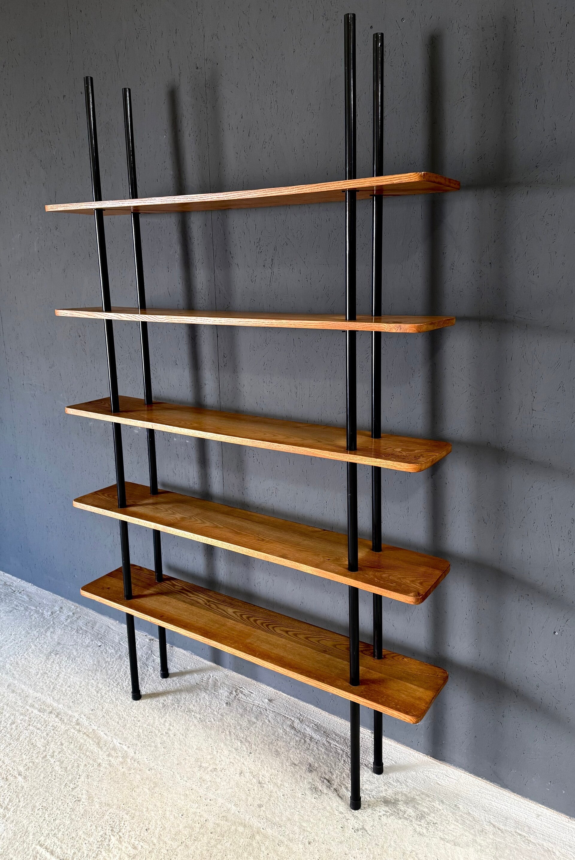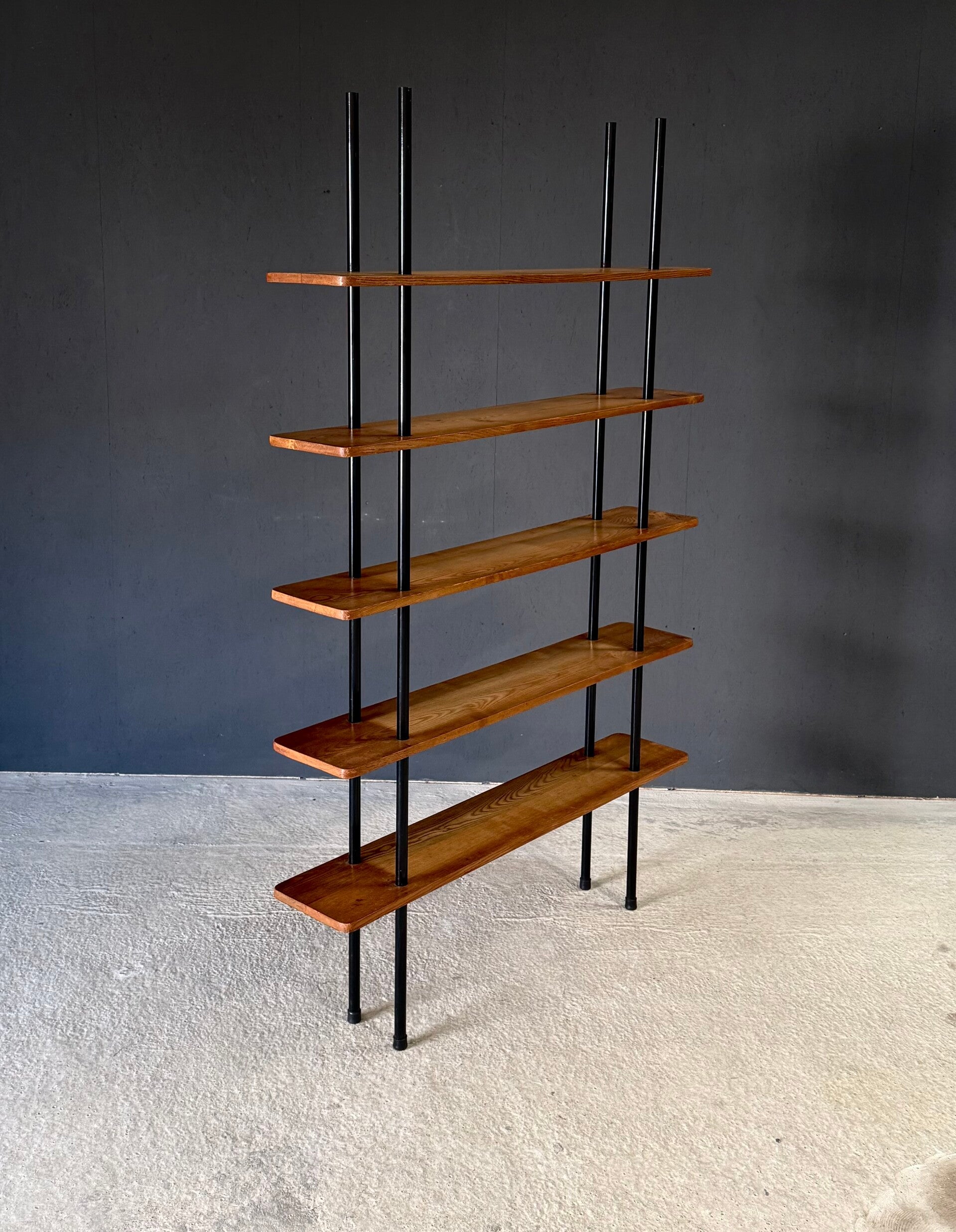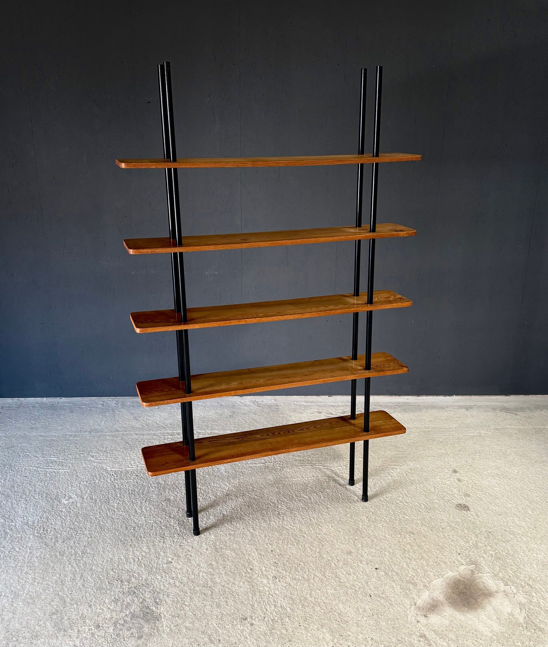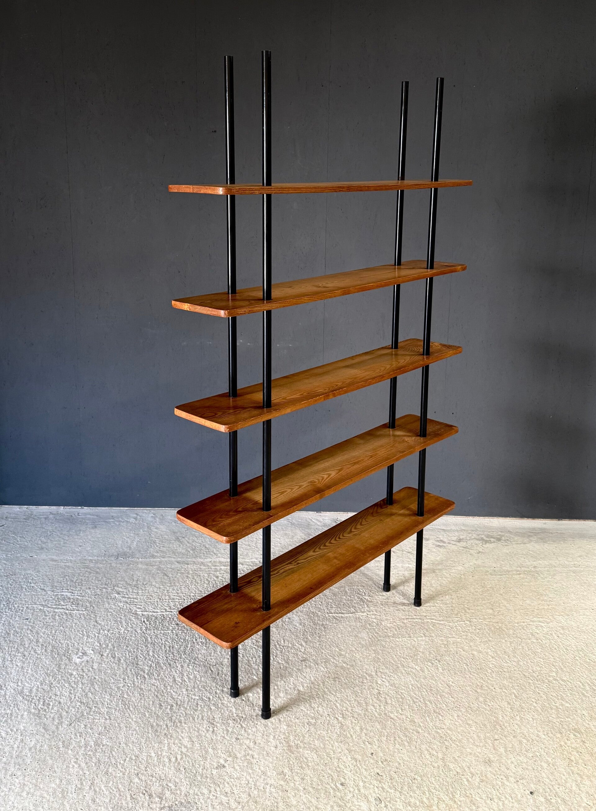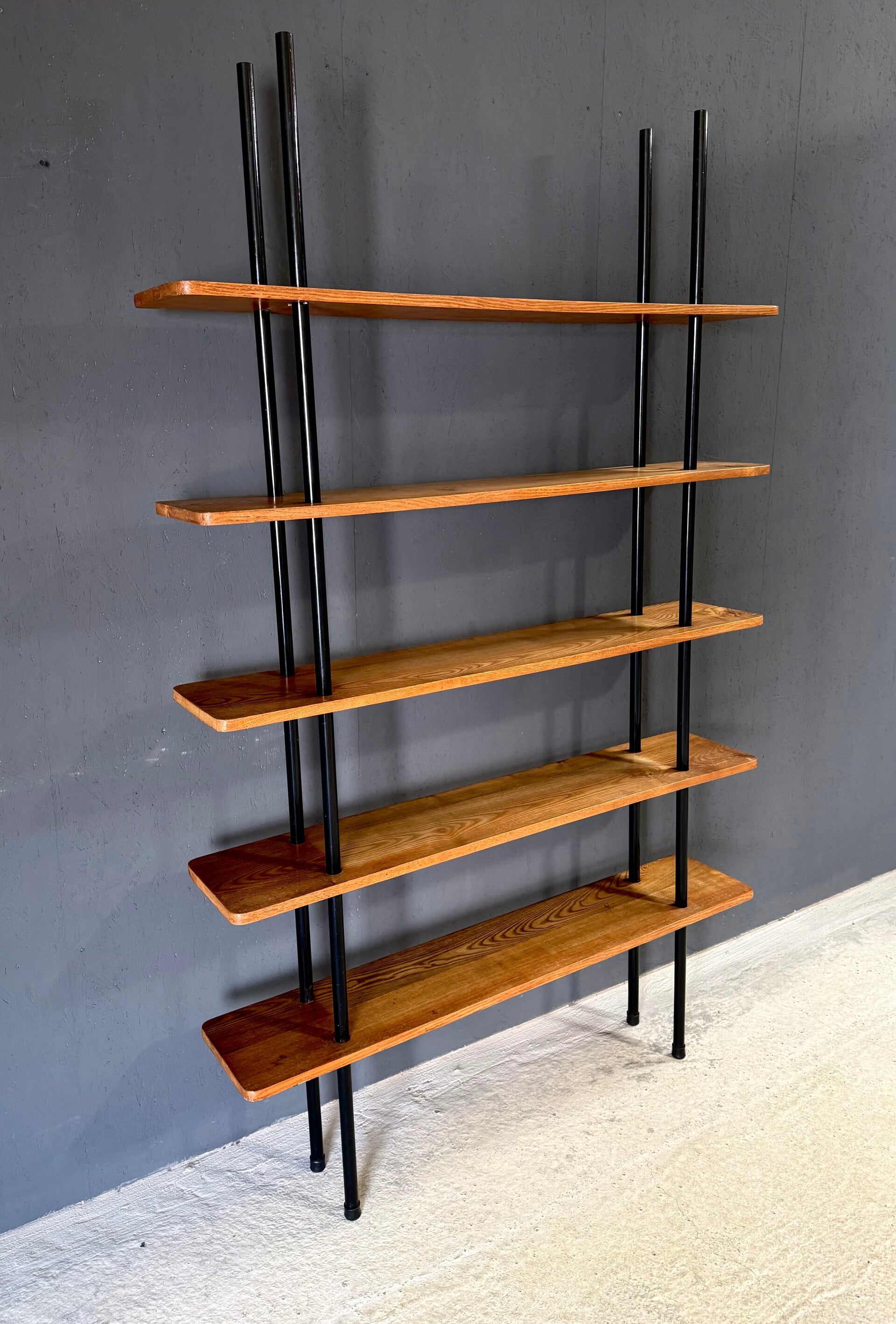 Vintage Midcentury Modern Dutch Design Stick Shelving Unit by Willem Lutjens. Made in the Netherlands, 1960's period. 4 Black lacquered steel rods with 5 solid birch wooden planks merged together in a very minimalistic way. This comes in good, all original condition. Has normal signs of wear from it's past use and age. This measures 201cm x 124,5cm x 24cm.