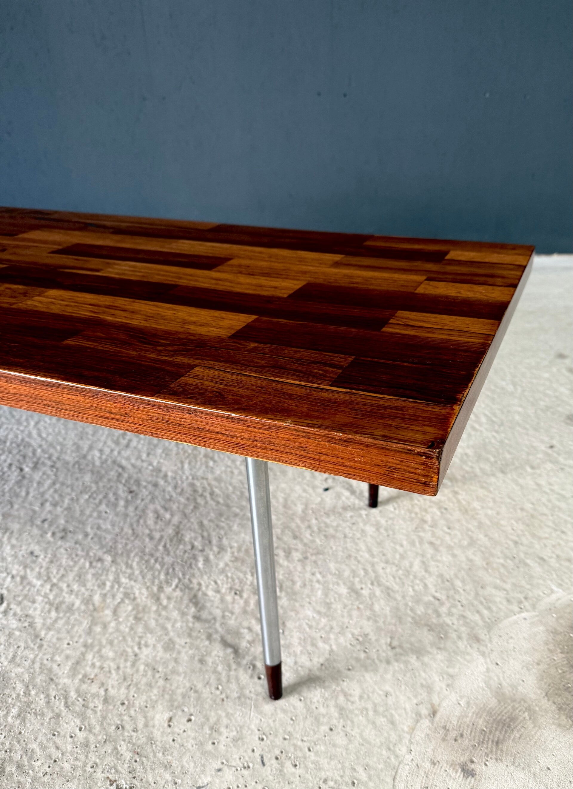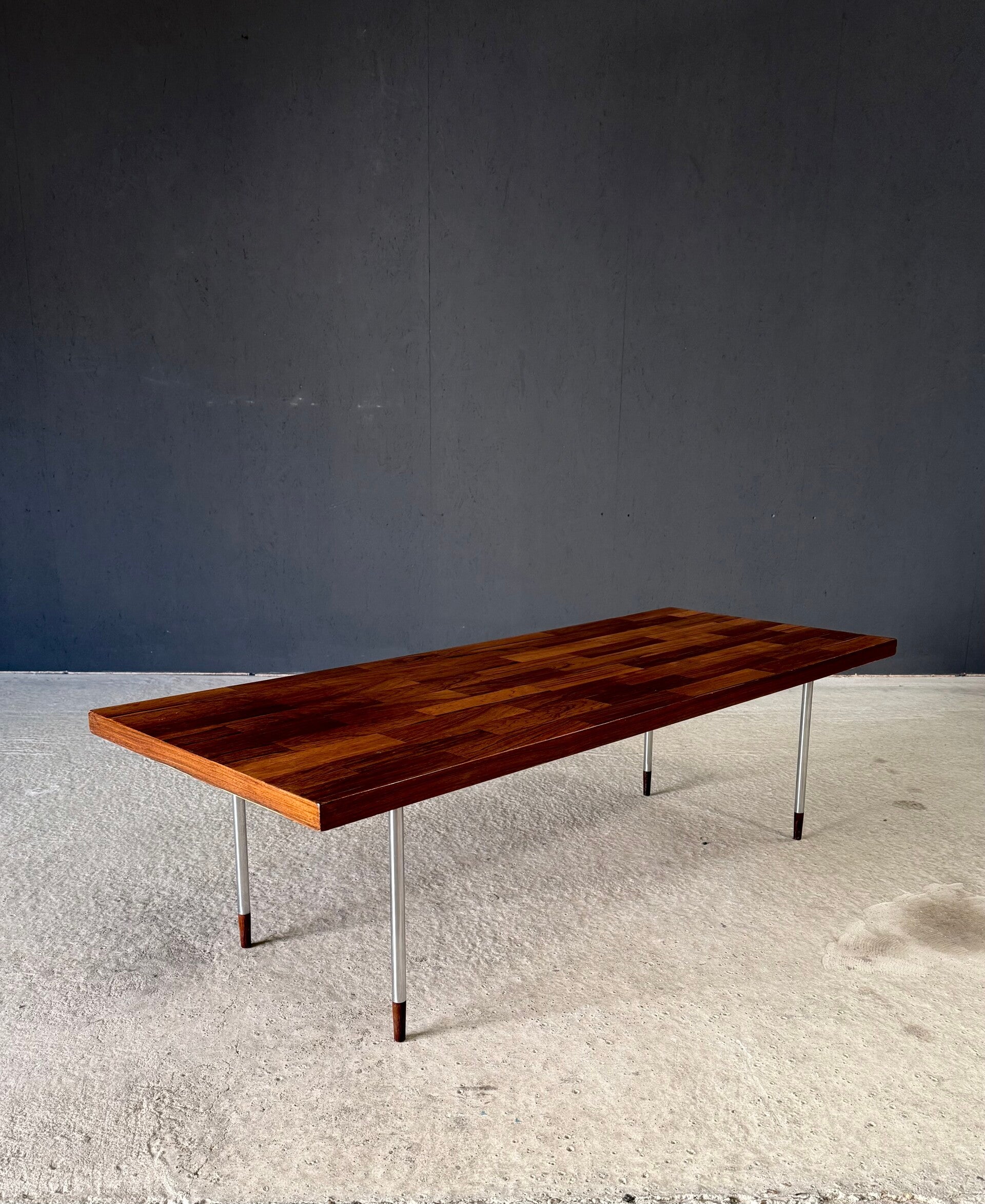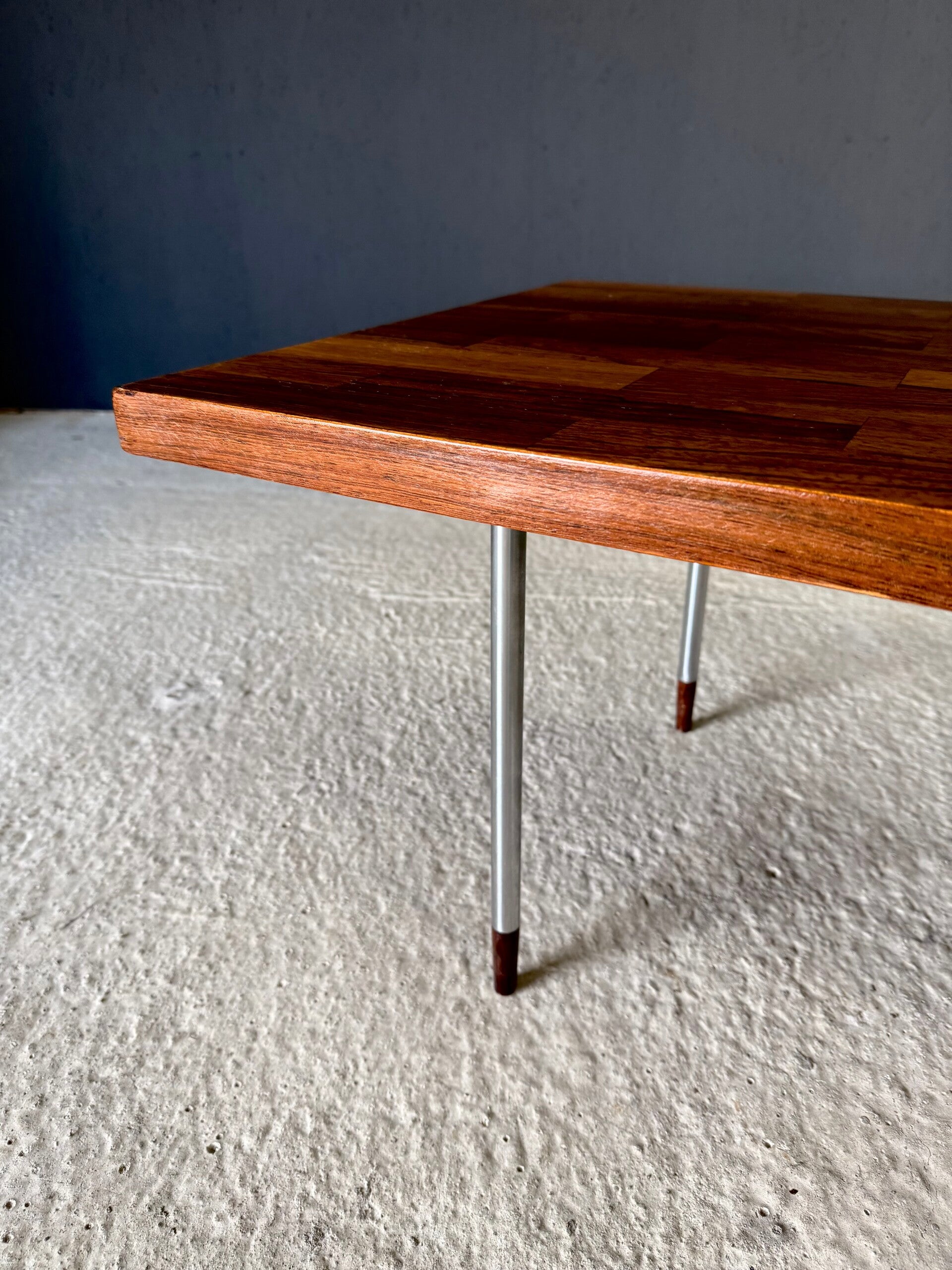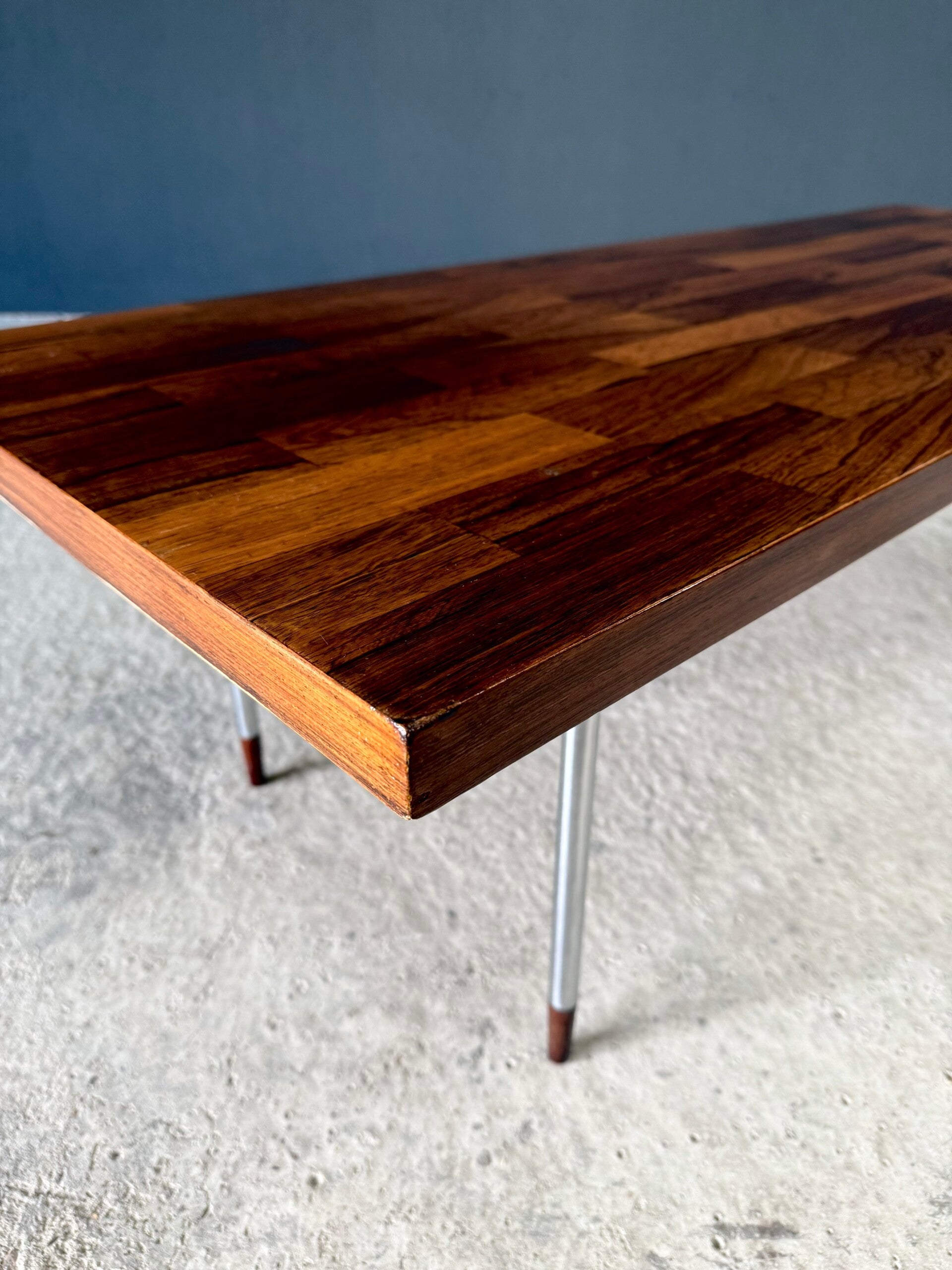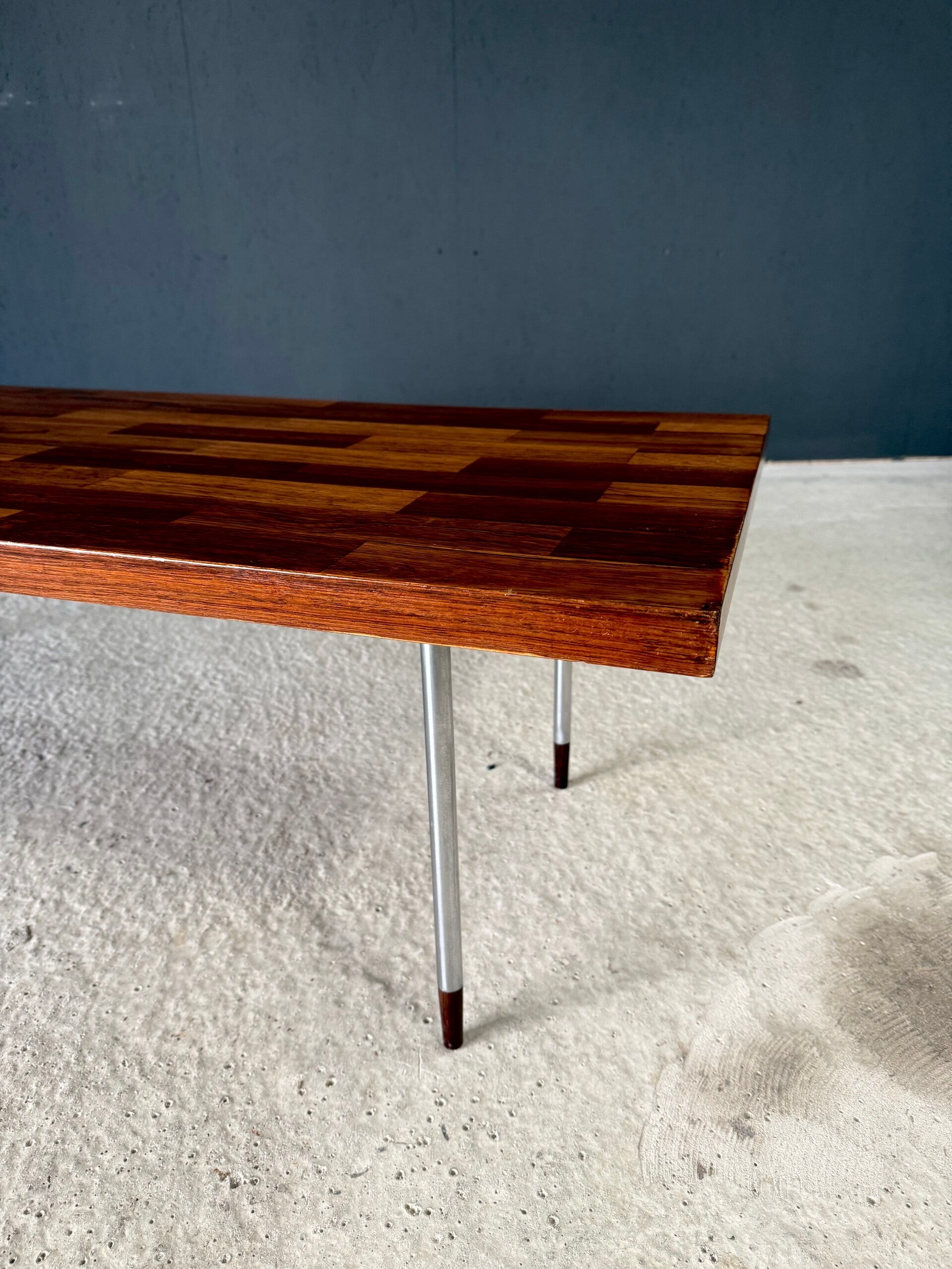 Vintage Midcentury Modern Dutch Design Coffee Table by Rudolf Bernd Glatzel for Fristho. Made in the Netherlands, 1960's period. Marked with label underneath. Teak inlay top on stainless steel legs with solid teak feet. Beautiful slender design. This comes in very good condition. With minor wear for it's age and use. This measures 40cm x 140cm x 54cm.