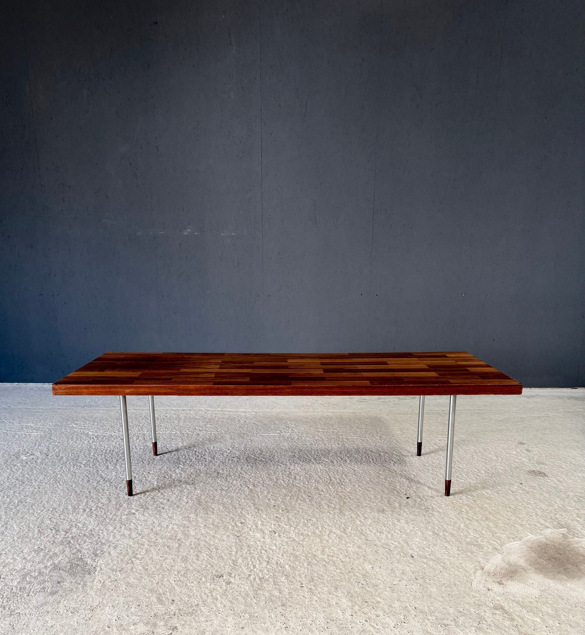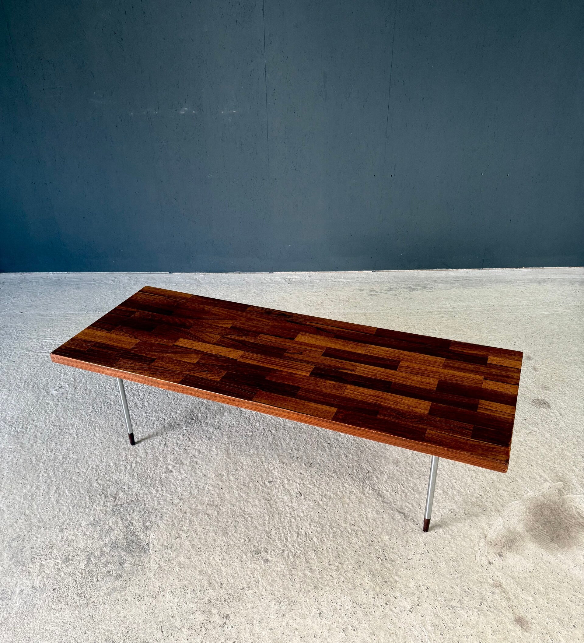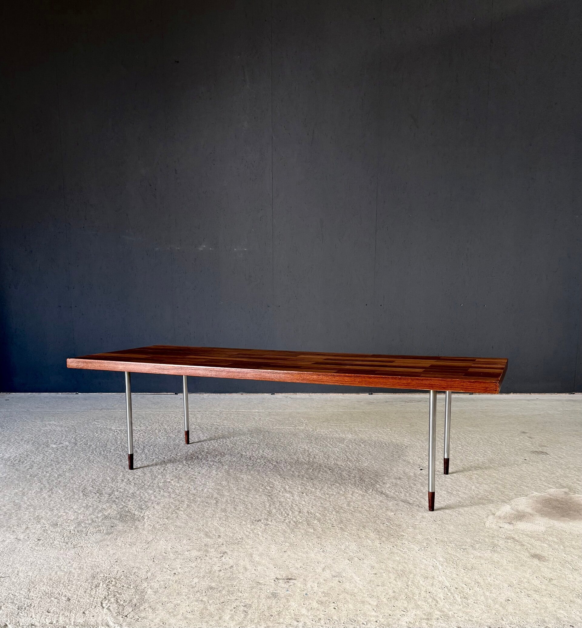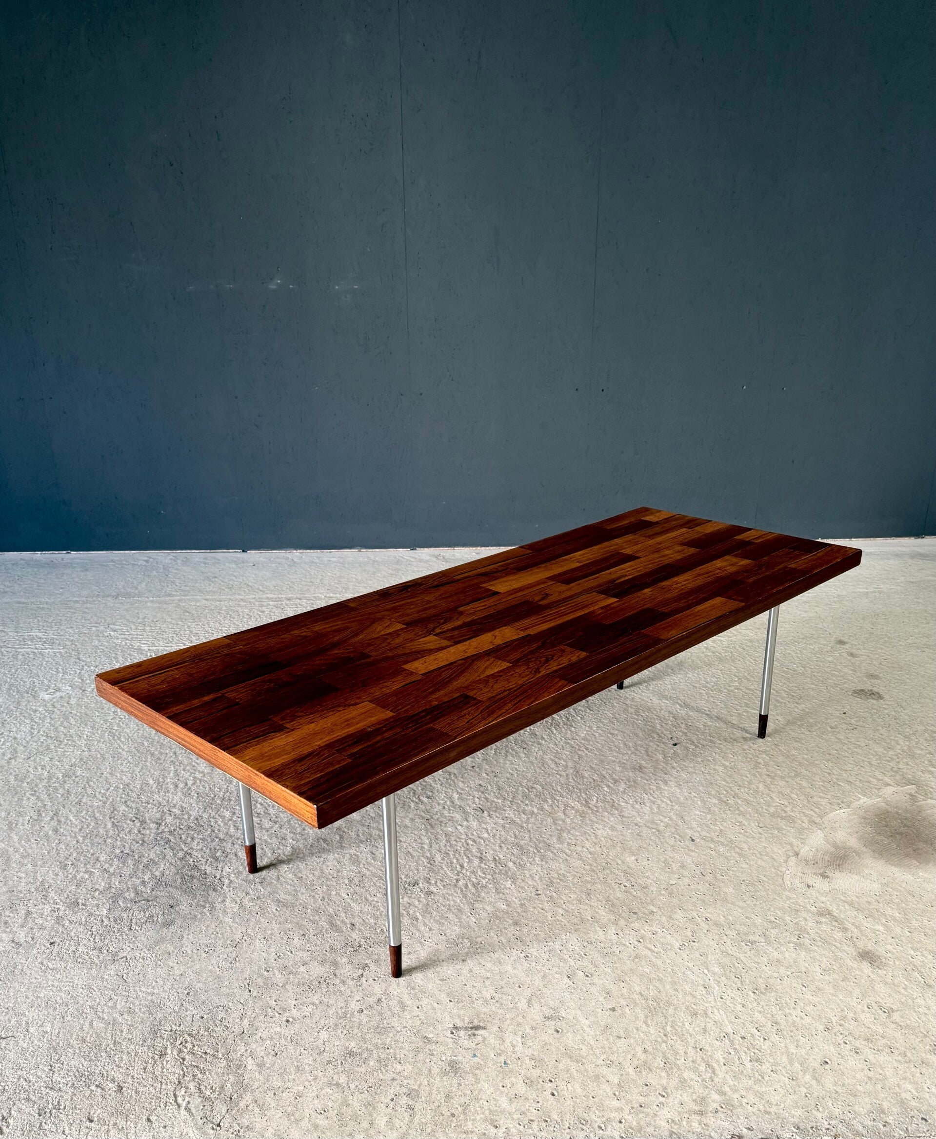 Vintage Midcentury Modern Dutch Design Coffee Table by Rudolf Bernd Glatzel for Fristho. Made in the Netherlands, 1960's period. Marked with label underneath. Teak inlay top on stainless steel legs with solid teak feet. Beautiful slender design. This comes in very good condition. With minor wear for it's age and use. This measures 40cm x 140cm x 54cm.