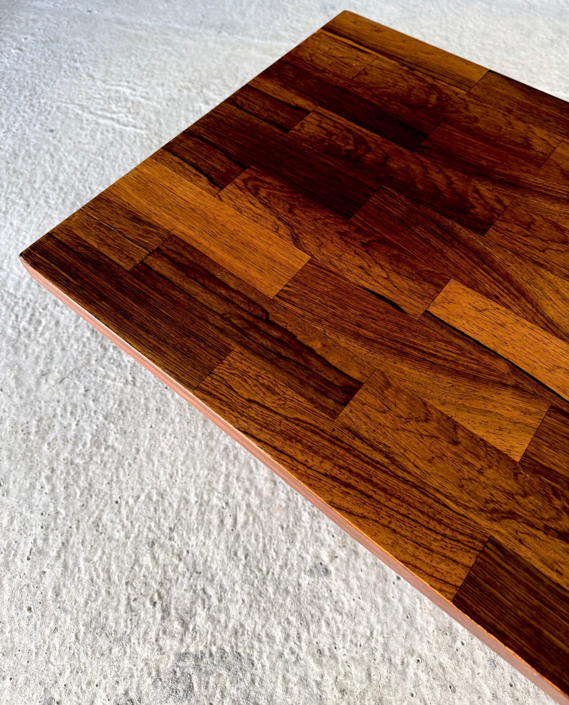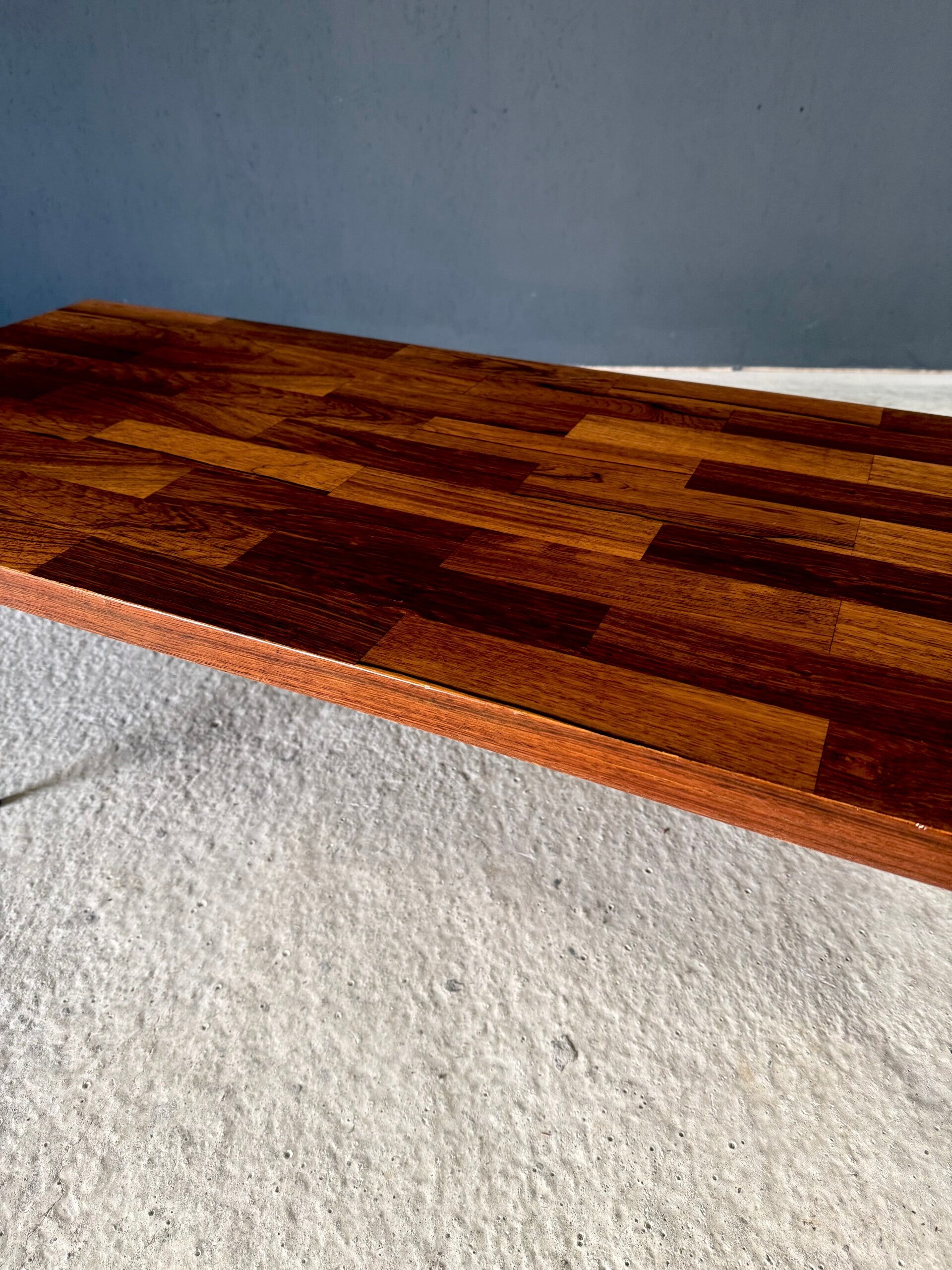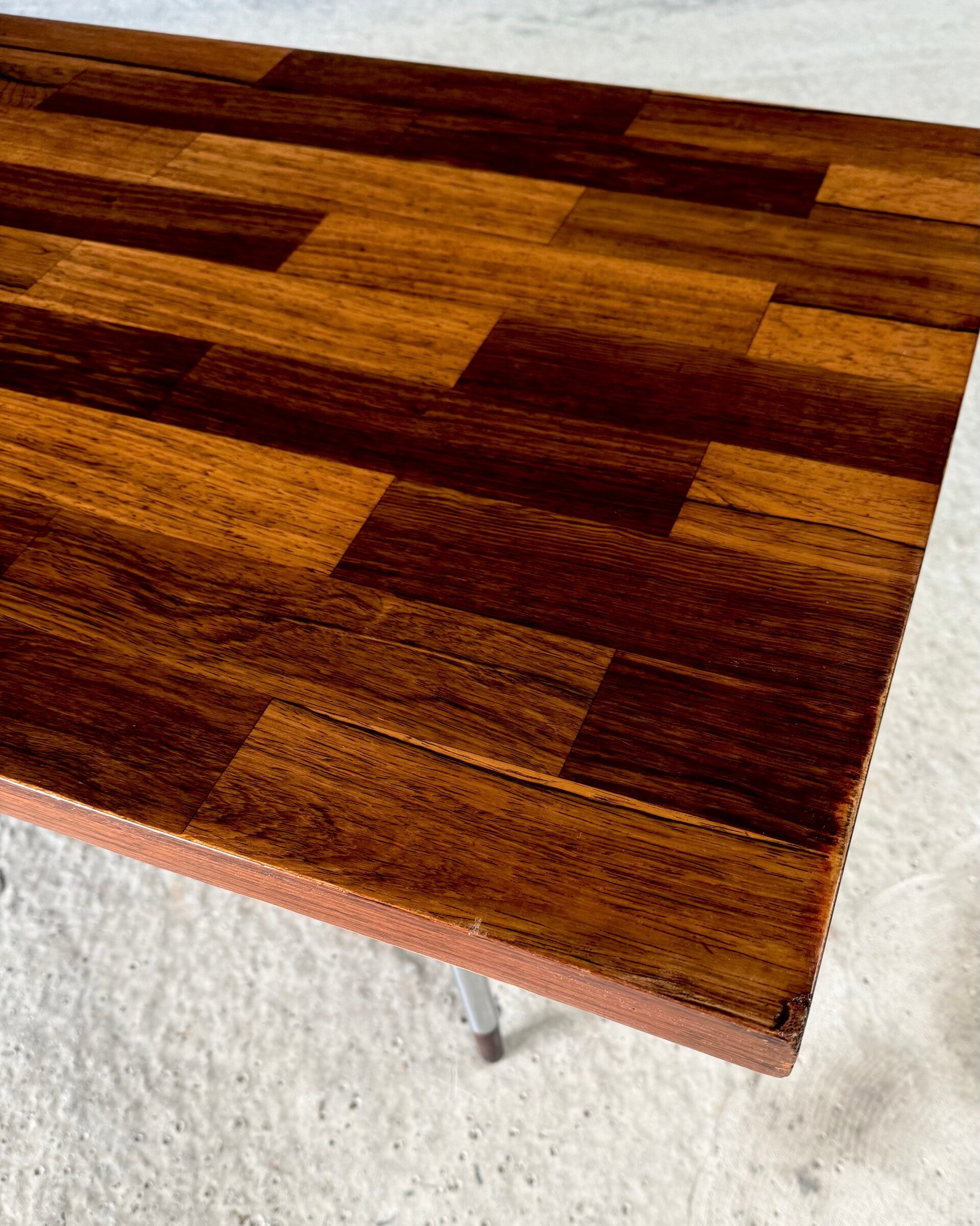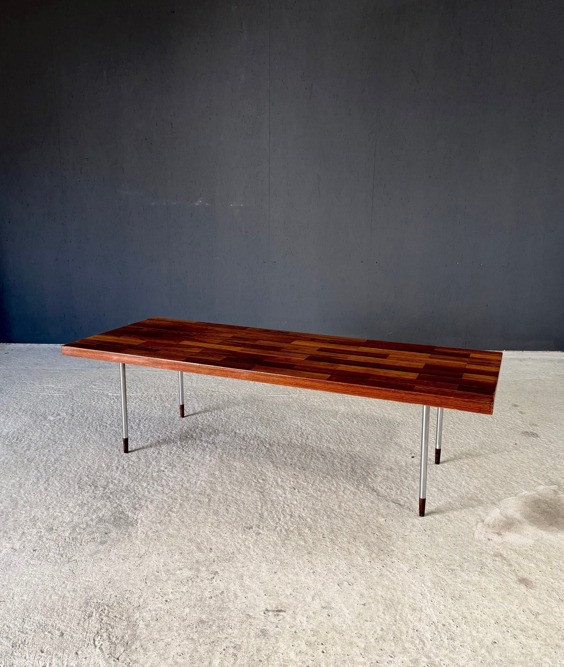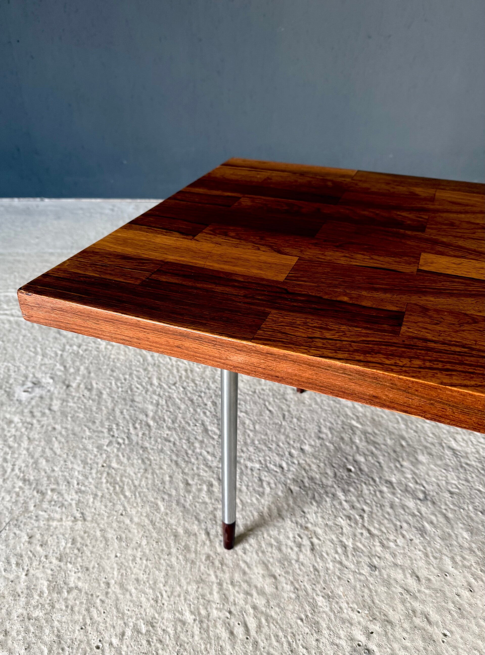 Vintage Midcentury Modern Dutch Design Coffee Table by Rudolf Bernd Glatzel for Fristho. Made in the Netherlands, 1960's period. Marked with label underneath. Teak inlay top on stainless steel legs with solid teak feet. Beautiful slender design. This comes in very good condition. With minor wear for it's age and use. This measures 40cm x 140cm x 54cm.