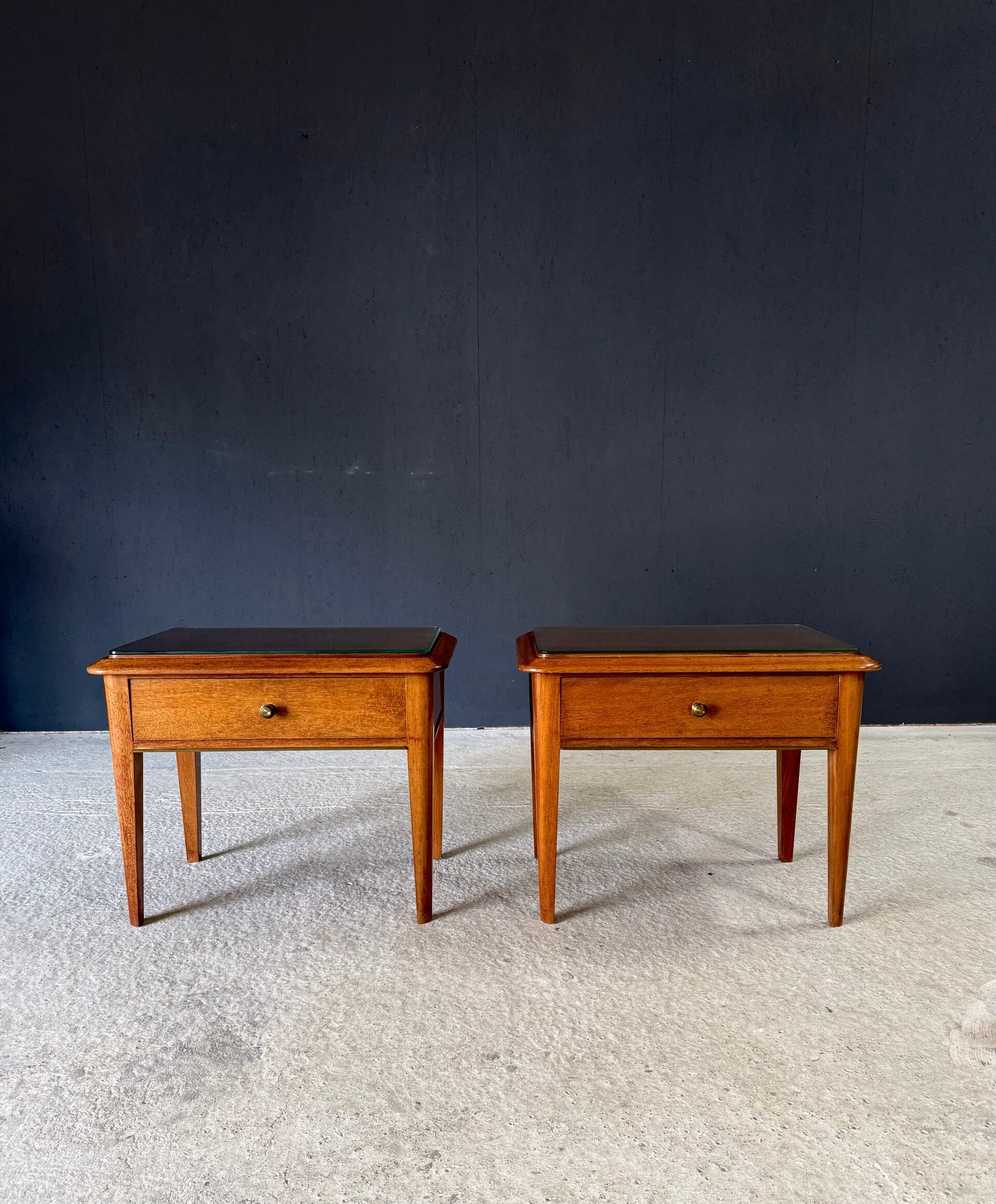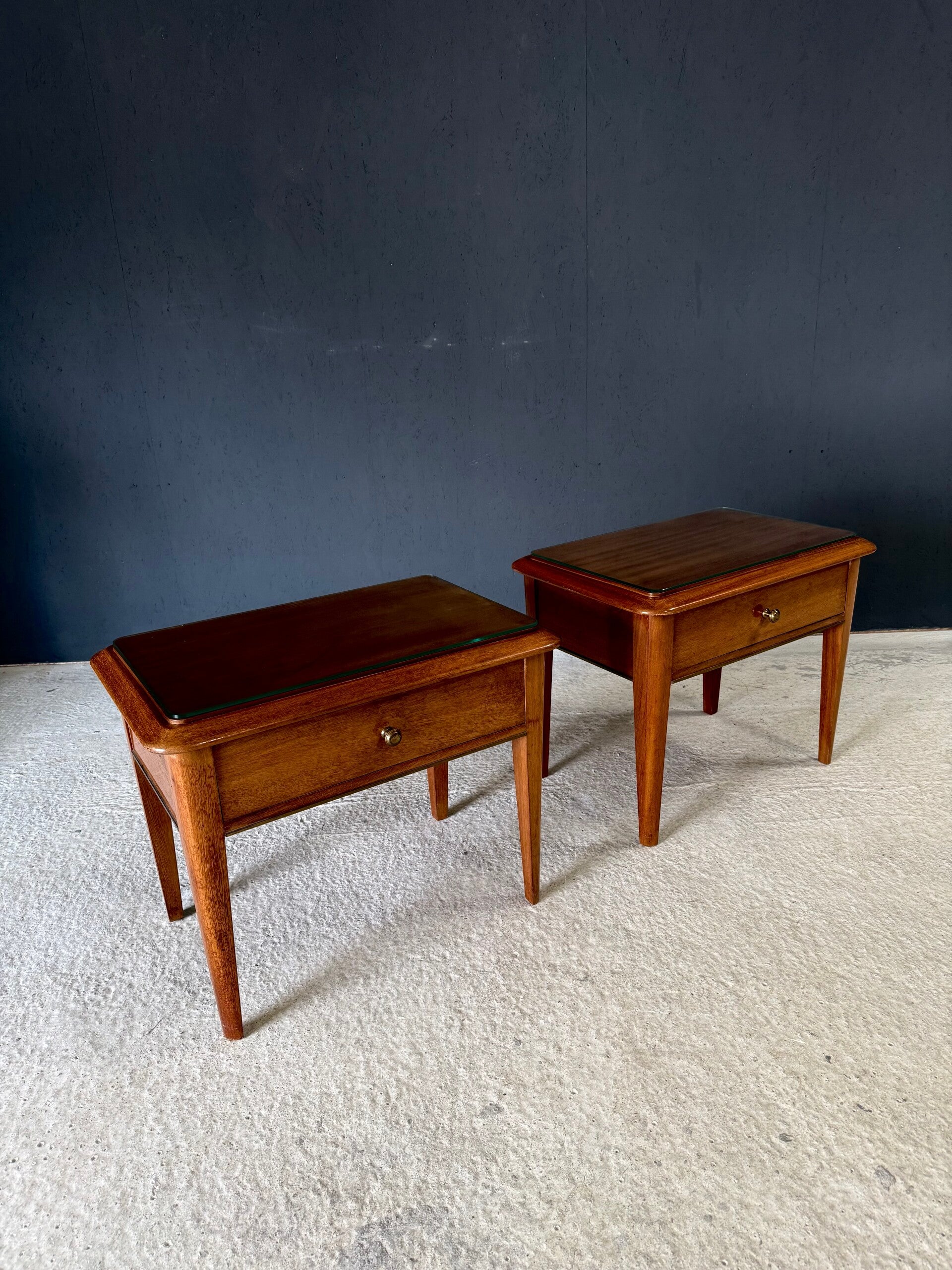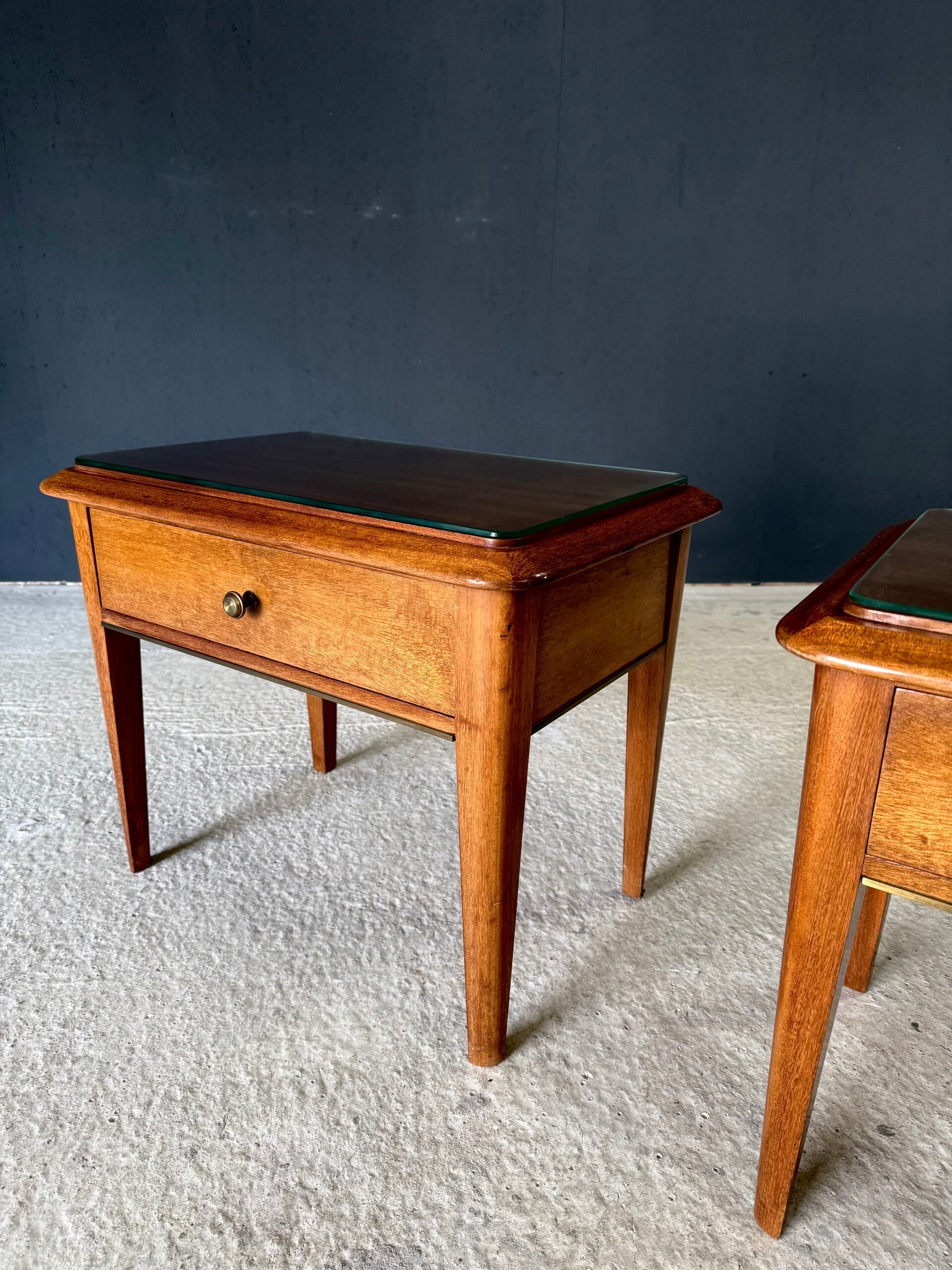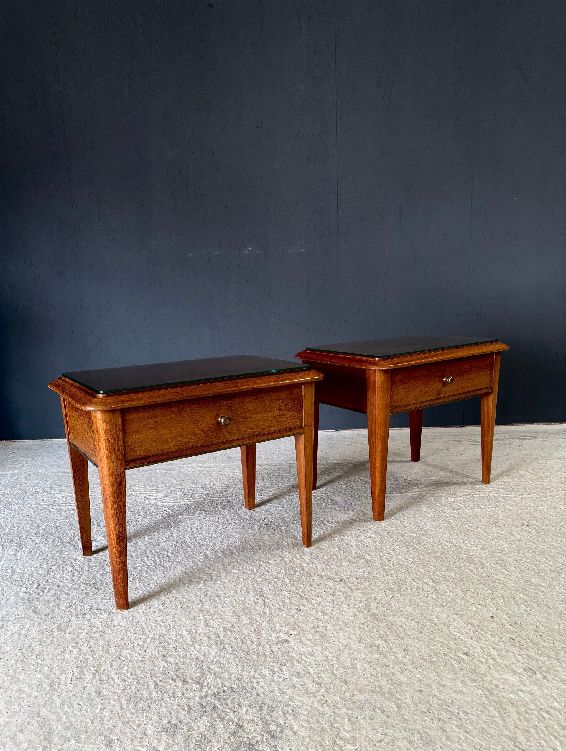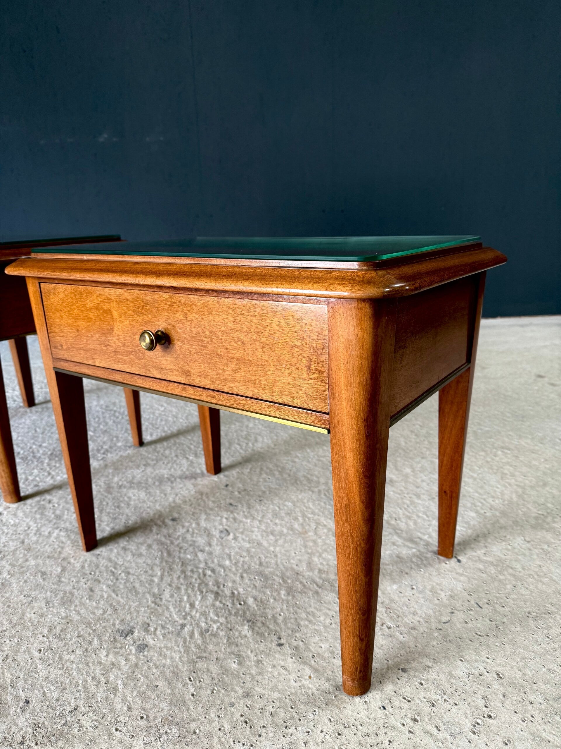 Vintage Midcentury Italian Design Bedside Cabinet set of 2. Made in Italy, 1950's period. Skilfully made and designed set of bedside cabinets in fruit wood with brass trimmings and a loose glass top. These come in good, original condition, with minor signs of wear from their age and use. Each measures 50cm x 63cm x 42cm.