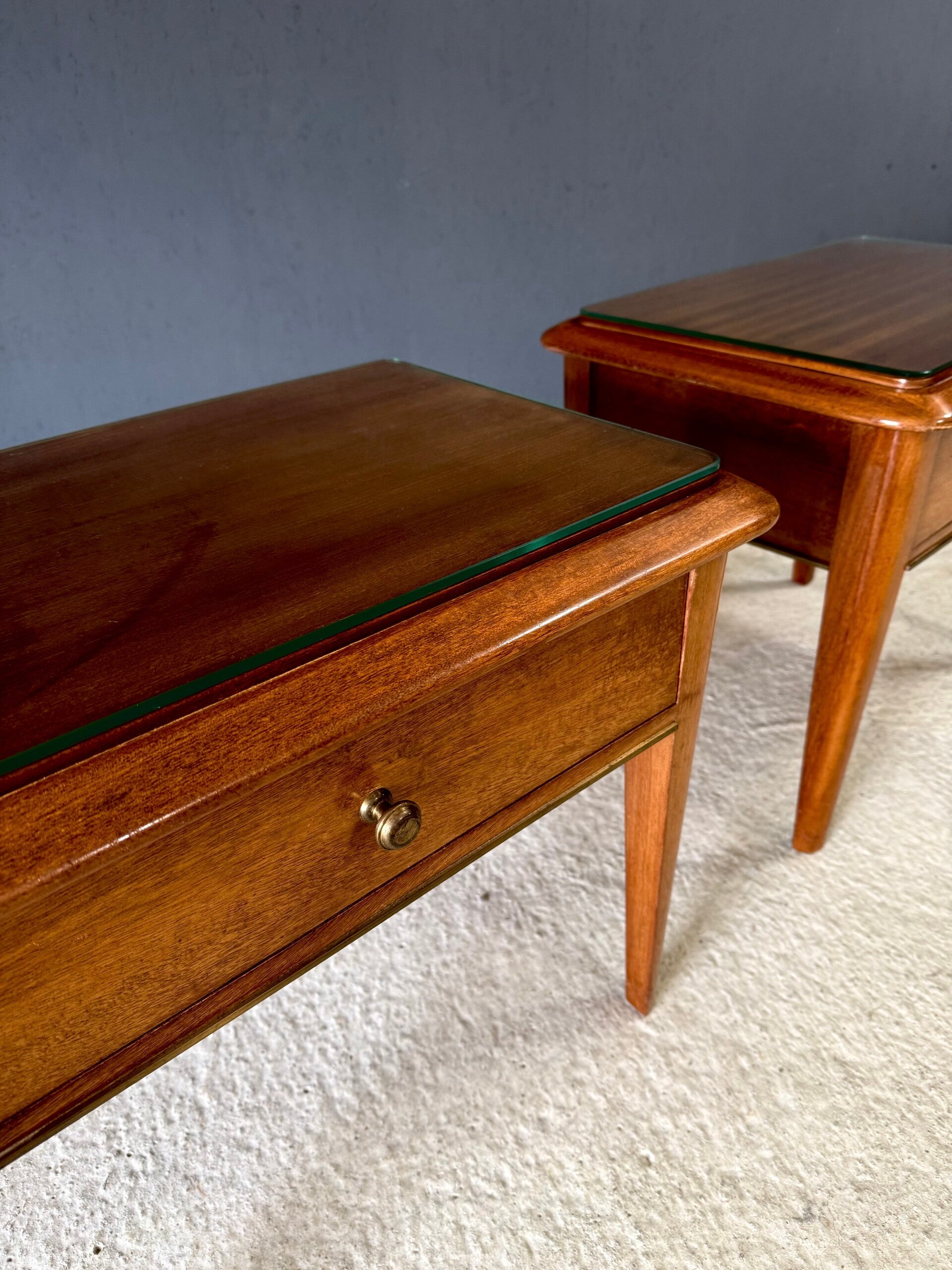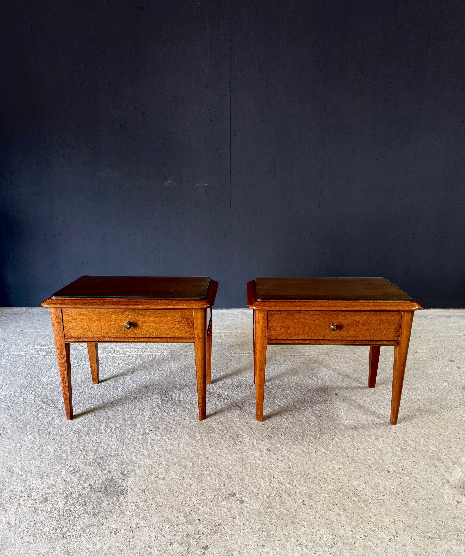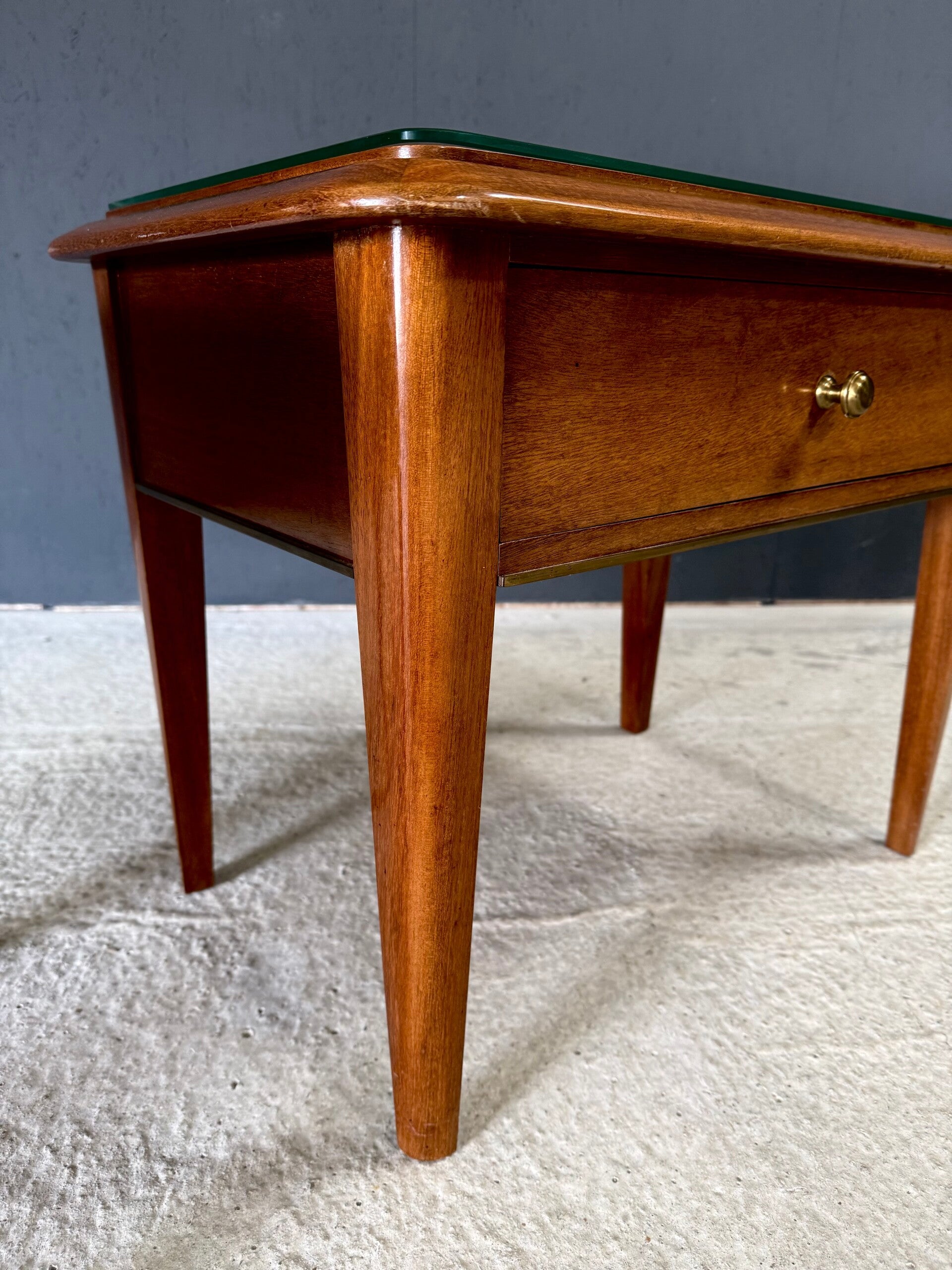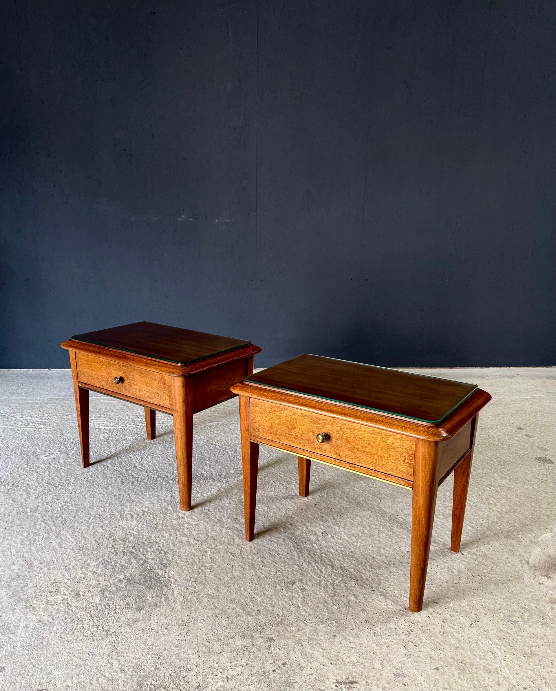 Vintage Midcentury Italian Design Bedside Cabinet set of 2. Made in Italy, 1950's period. Skilfully made and designed set of bedside cabinets in fruit wood with brass trimmings and a loose glass top. These come in good, original condition, with minor signs of wear from their age and use. Each measures 50cm x 63cm x 42cm.
