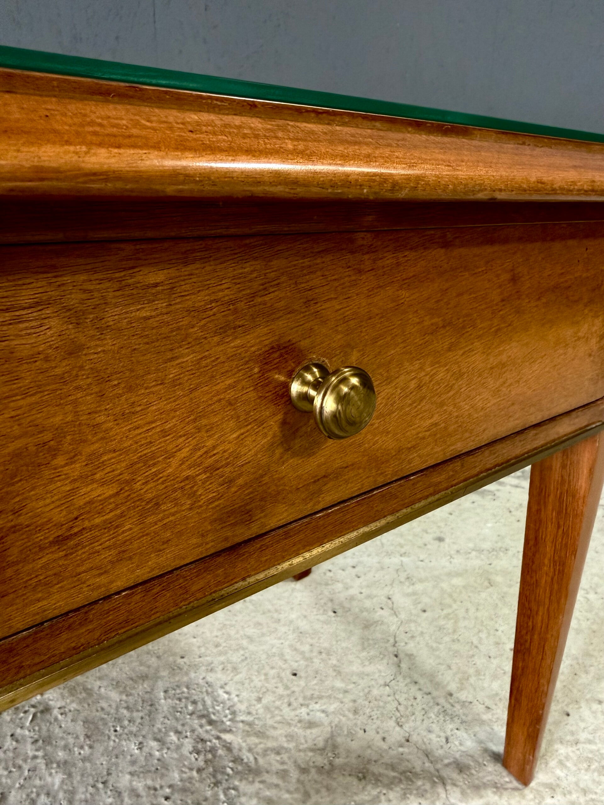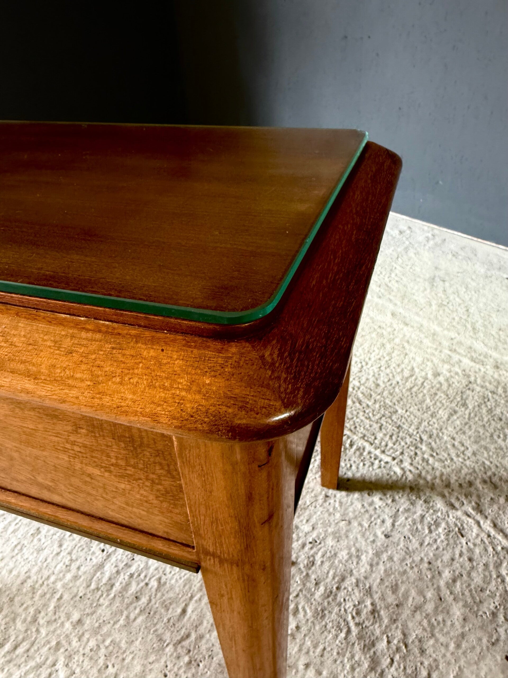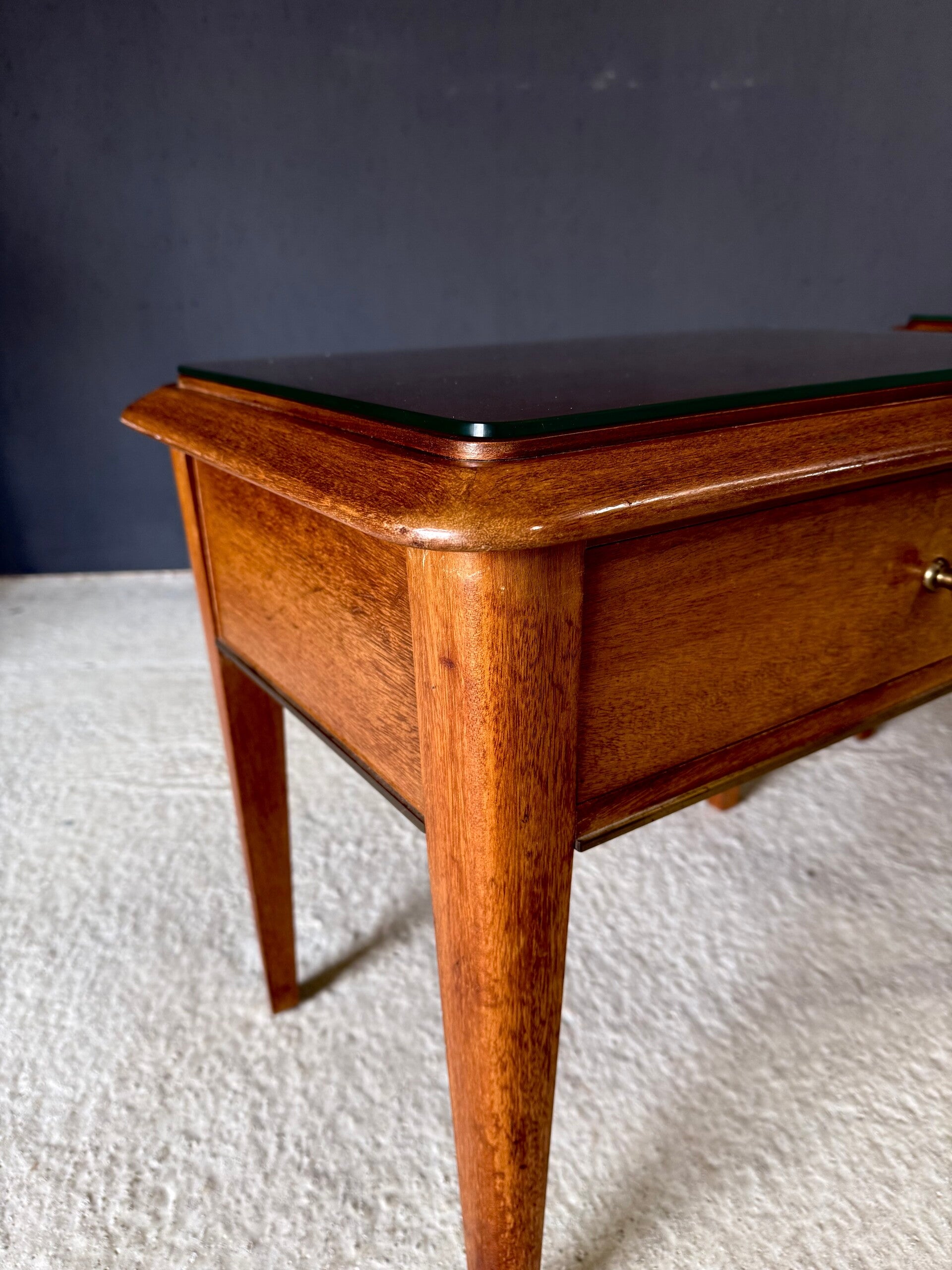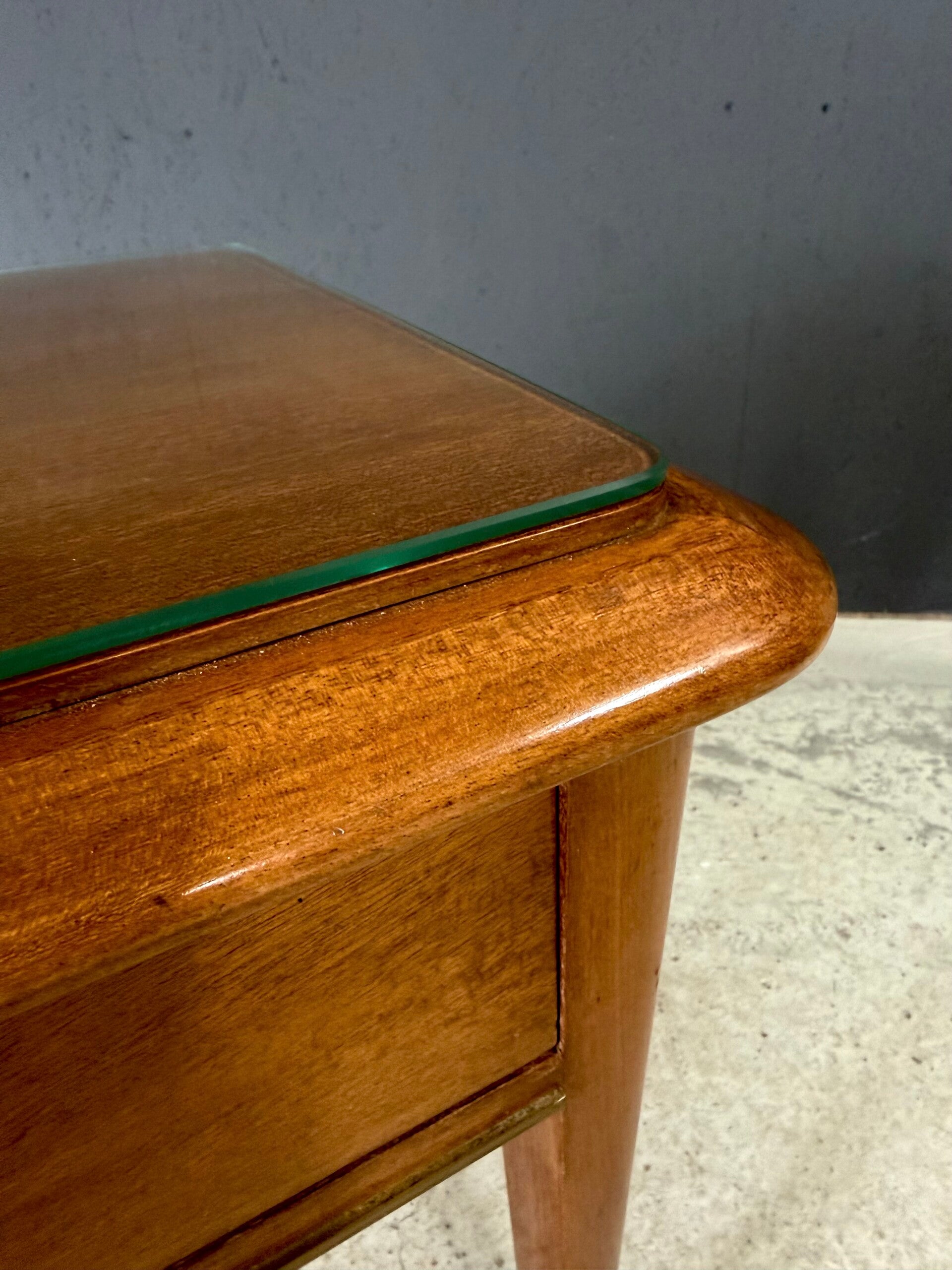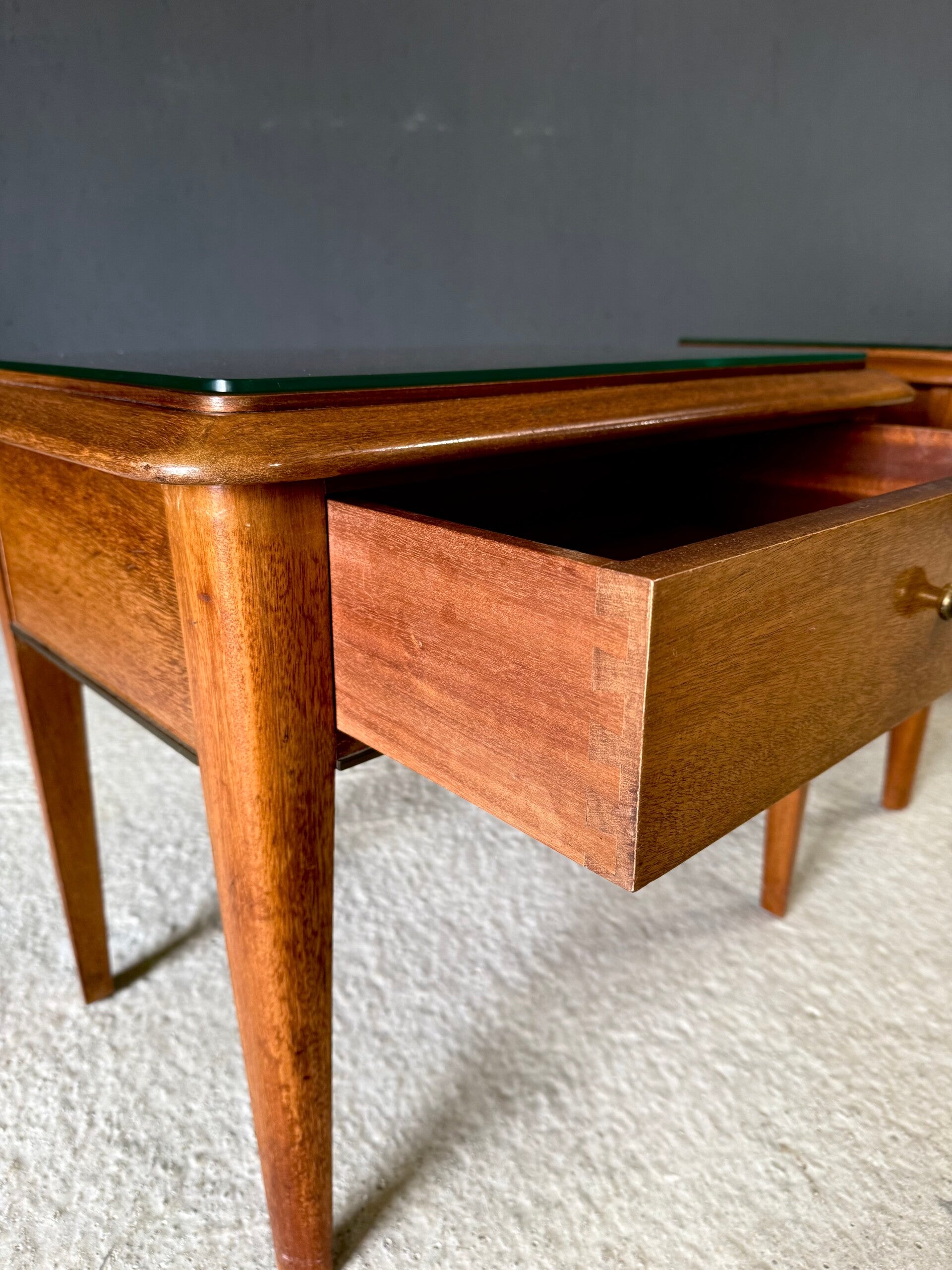 Vintage Midcentury Italian Design Bedside Cabinet set of 2. Made in Italy, 1950's period. Skilfully made and designed set of bedside cabinets in fruit wood with brass trimmings and a loose glass top. These come in good, original condition, with minor signs of wear from their age and use. Each measures 50cm x 63cm x 42cm.