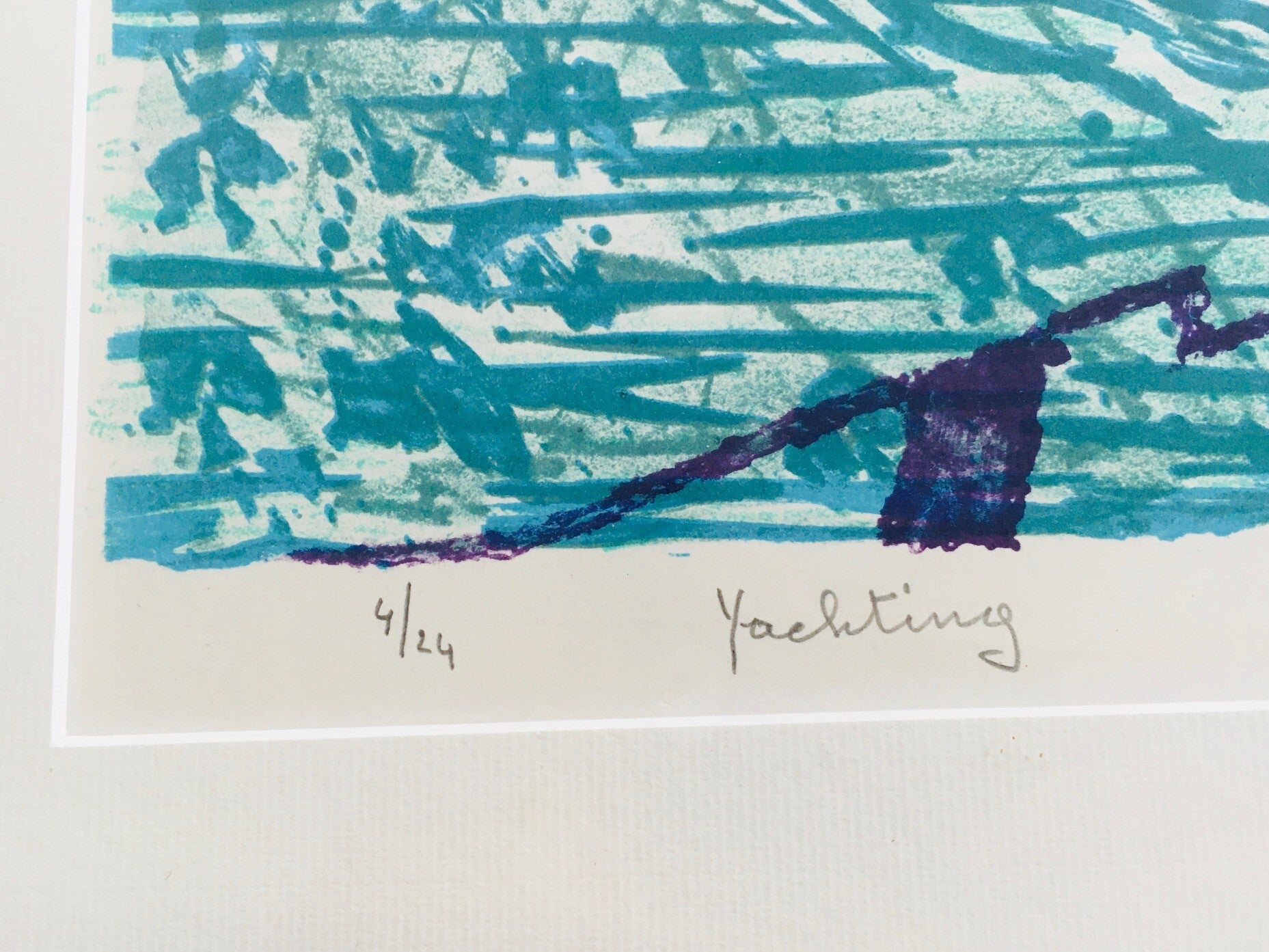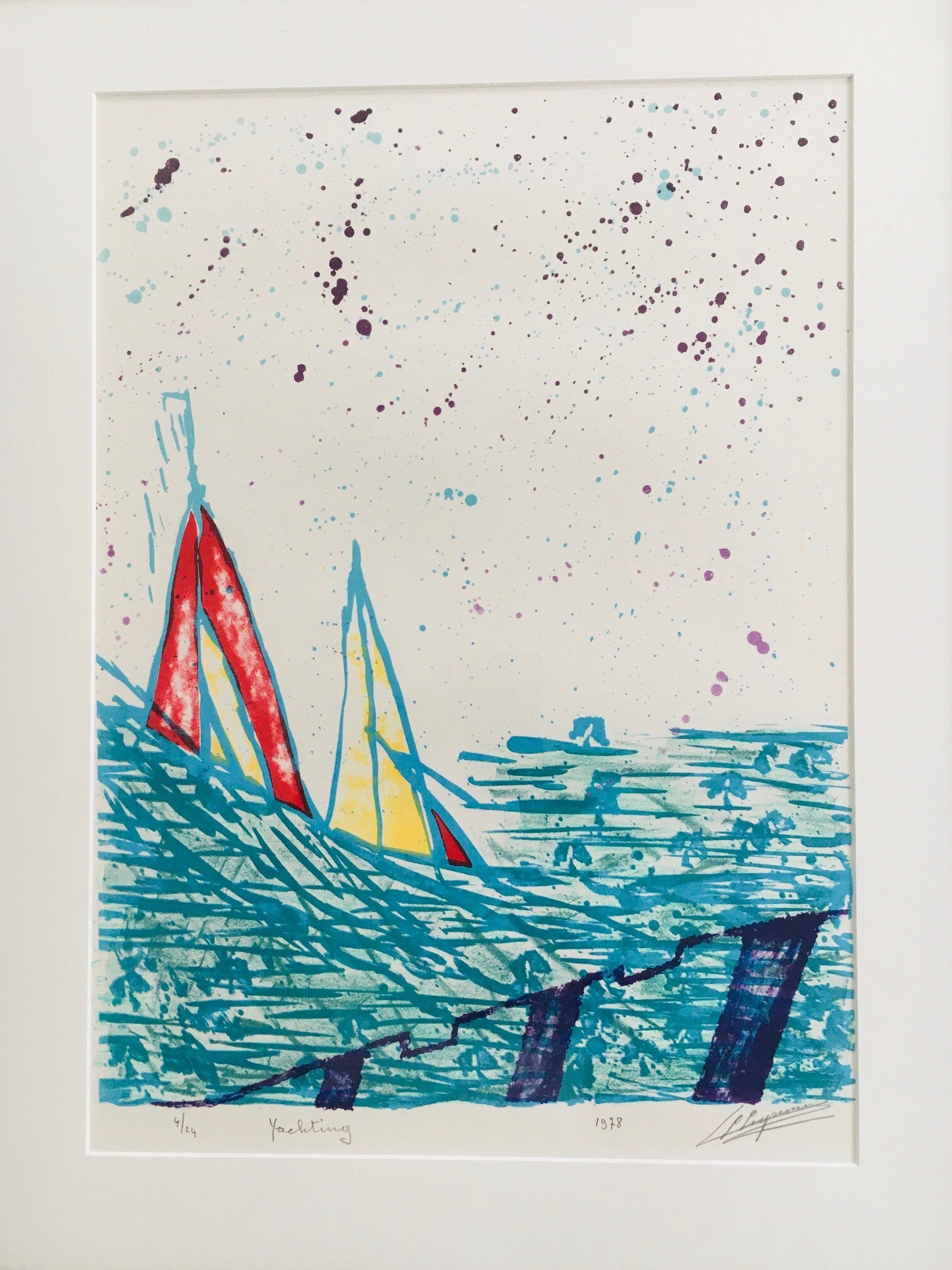 Original Art Litho Print "Yachting". Signed and numbered by artist. Number 4/24. Signature & dated 1978. Don't know the artist. In very good condition and well framed with passe-partout after glass. Total size of the frame measures: 50cm x 64cm x 1,5cm.