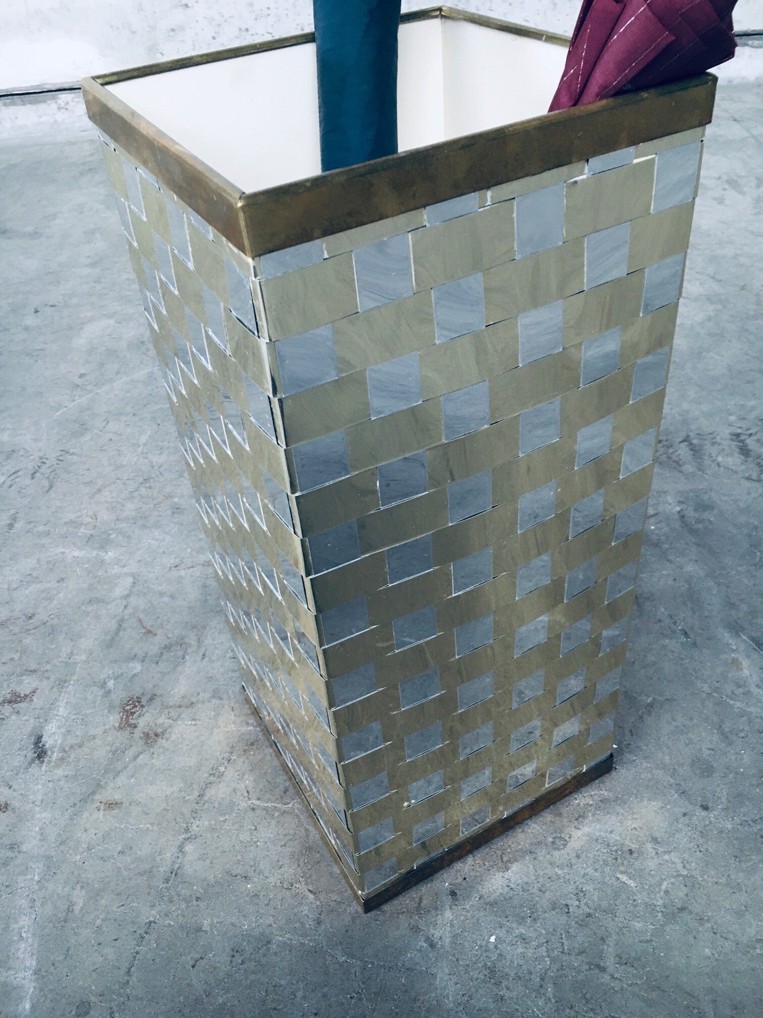 Vintage Midcentury Modern Italian Design 2 color brass Umbrella Stand by Romeo Rega, Italy 1970's. Hollywood Regency Style. Brass & chrome metal. In very good original condition. Measures: 51cm x 22,5cm x 22,5cm.